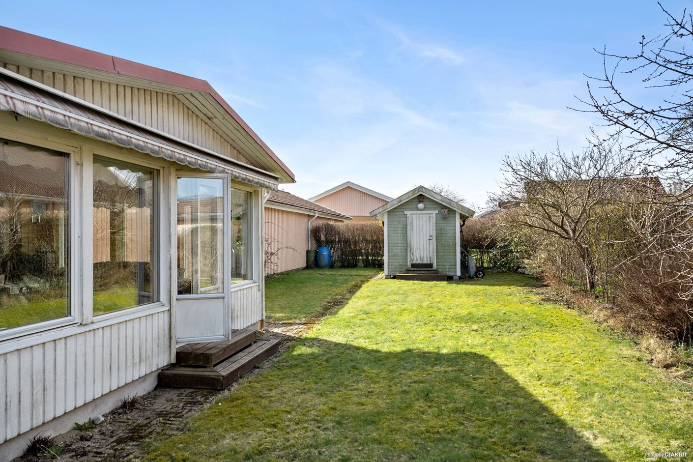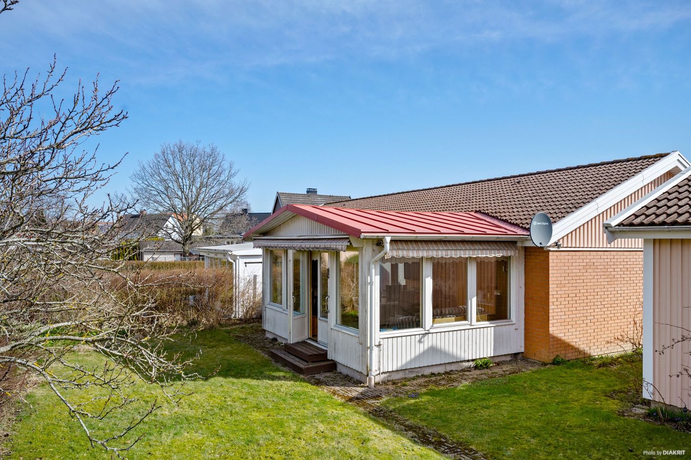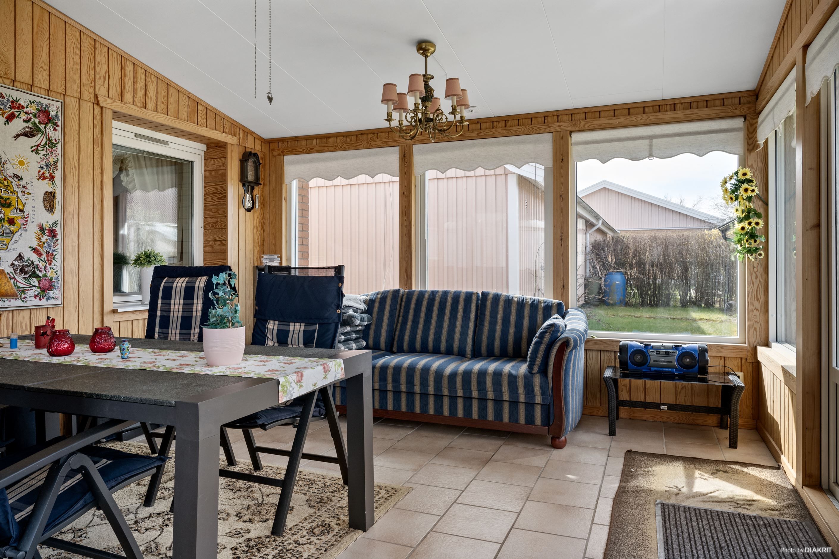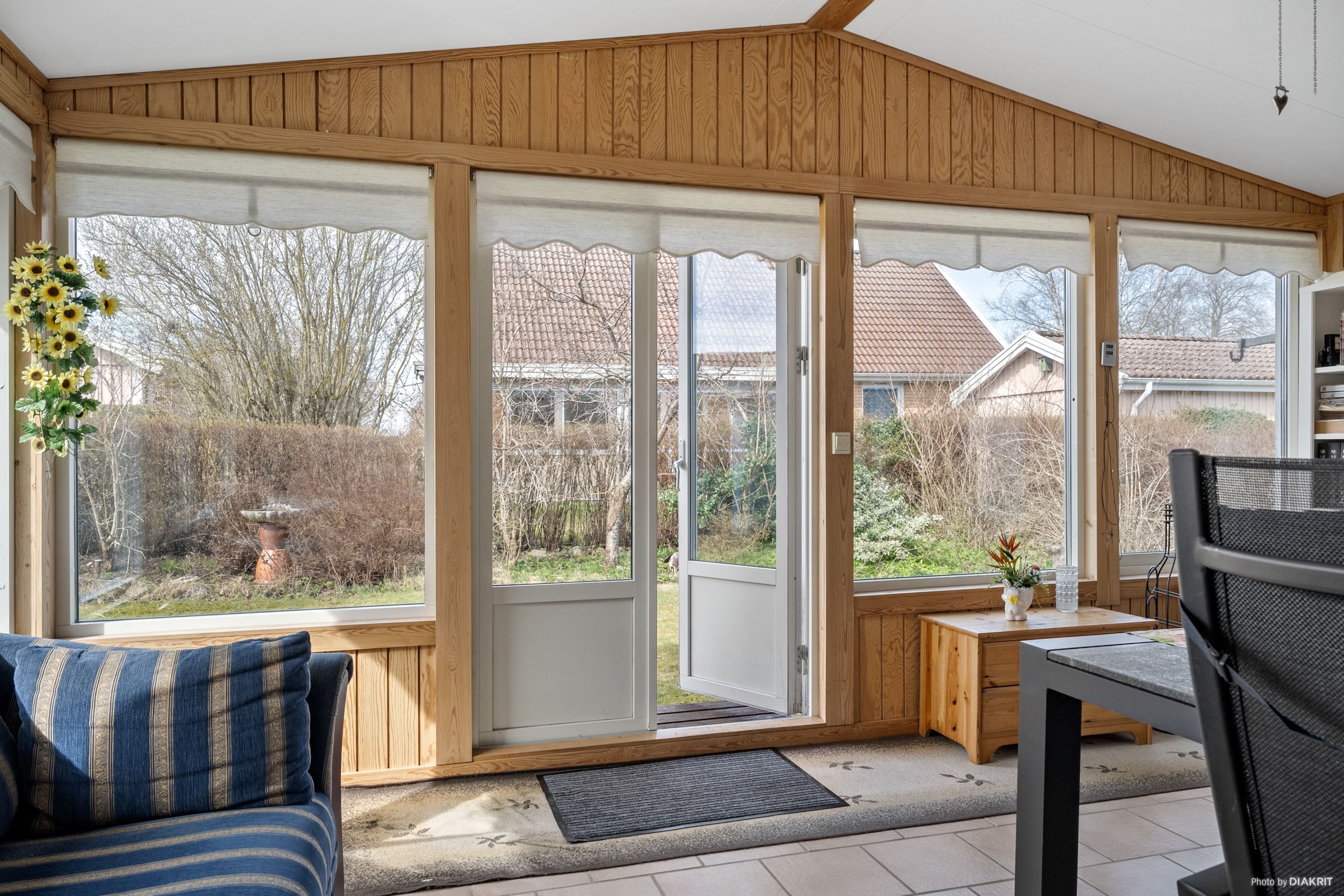 Bostaden har en genomtänkt planlösning med tre rum och kök, varav två sovrum. Skicket är genomgående välhållet och ombonat, med en tidlös standard som ger ett tryggt och bekymmersfritt boende från första dagen. Vardagsrummet har utgång till ett inglasat uterum som förlänger säsongen och blir en naturlig plats för både vardag och umgänge. Härifrån når du även den egna lilla trädgårdstäppan – lagom stor och lättskött, perfekt för odling, grill eller avkoppling i solen. På tomten finns dessutom ett praktiskt redskapsskjul.