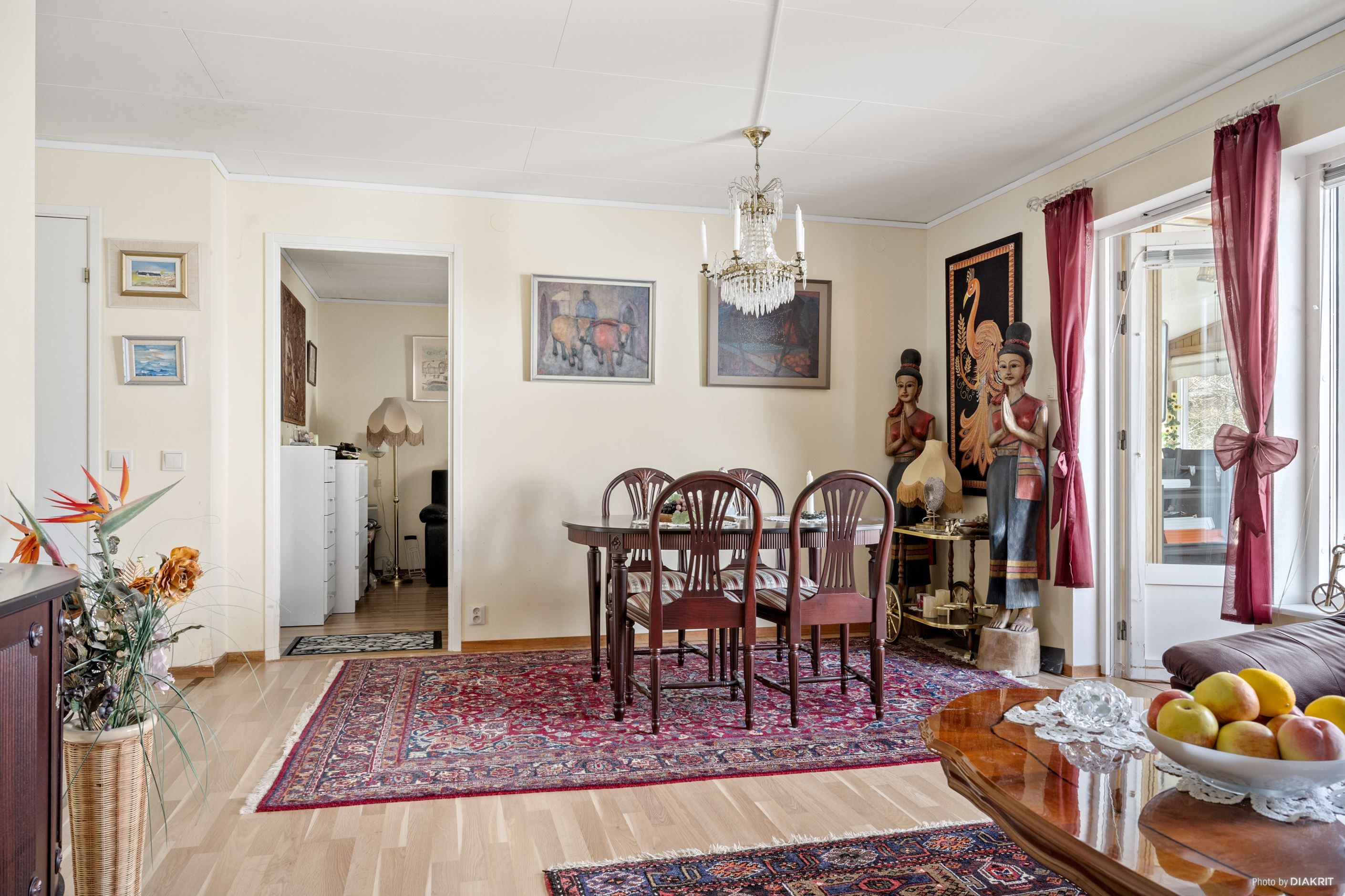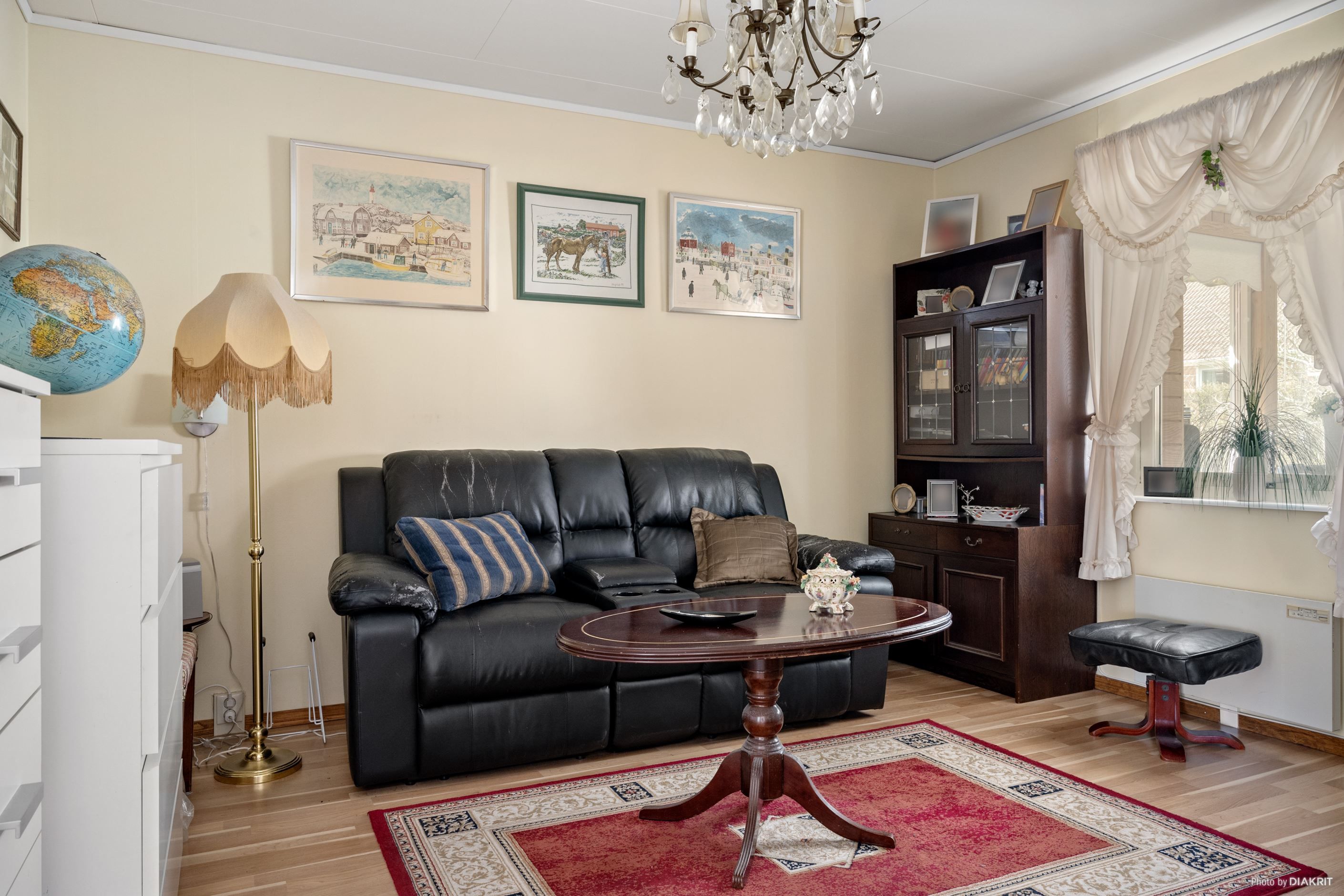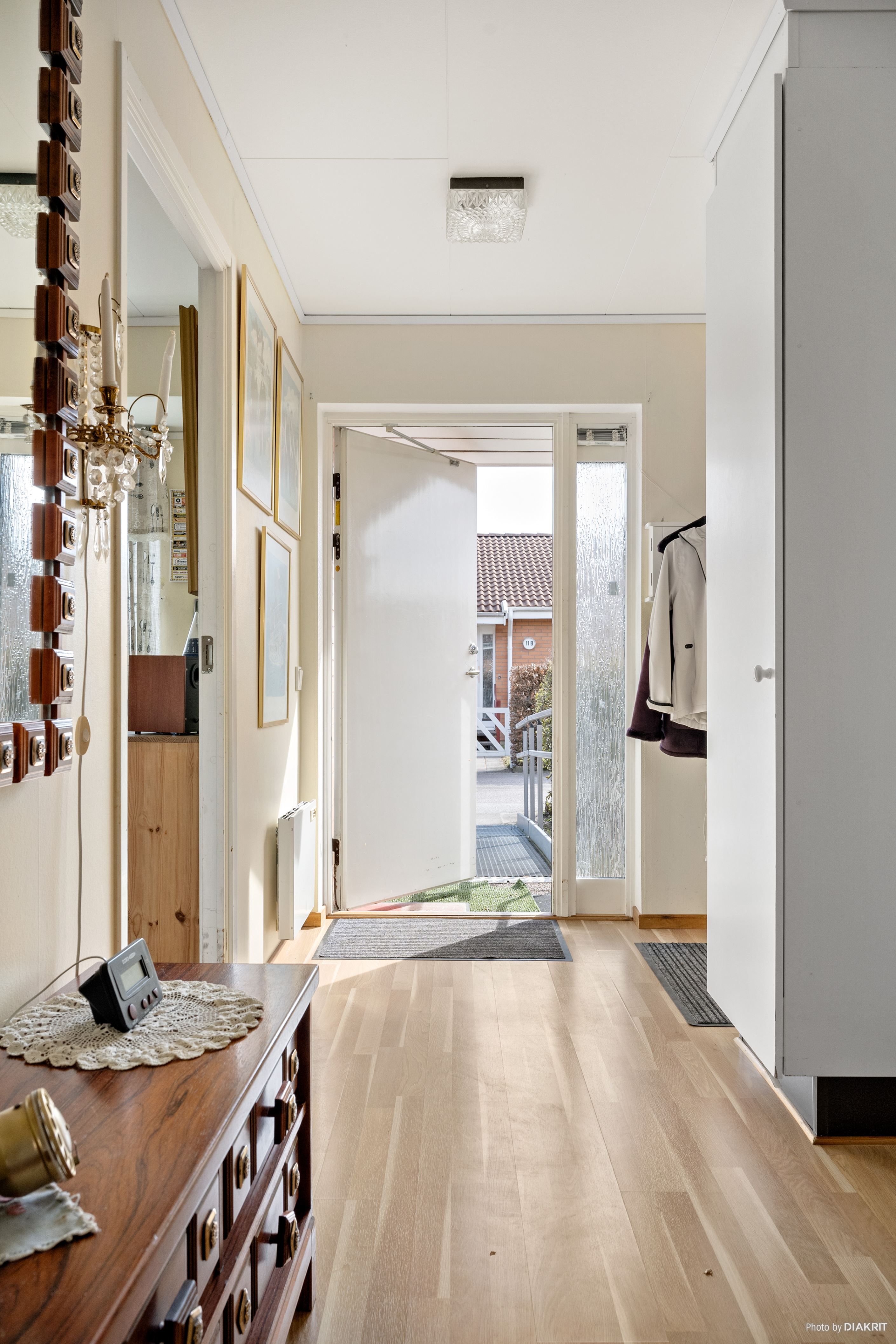 Bostaden har en genomtänkt planlösning med tre rum och kök, varav två sovrum. Skicket är genomgående välhållet och ombonat, med en tidlös standard som ger ett tryggt och bekymmersfritt boende från första dagen. Vardagsrummet har utgång till ett inglasat uterum som förlänger säsongen och blir en naturlig plats för både vardag och umgänge. Härifrån når du även den egna lilla trädgårdstäppan – lagom stor och lättskött, perfekt för odling, grill eller avkoppling i solen. På tomten finns dessutom ett praktiskt redskapsskjul.
