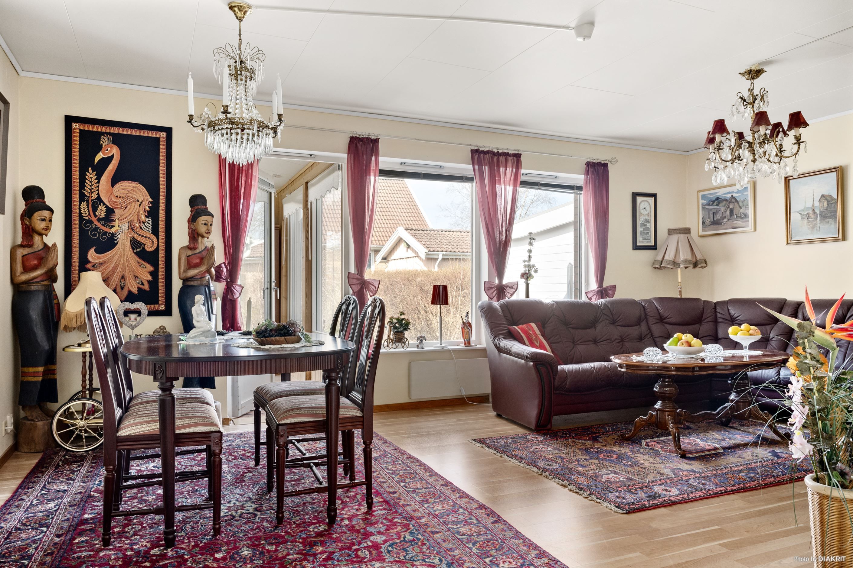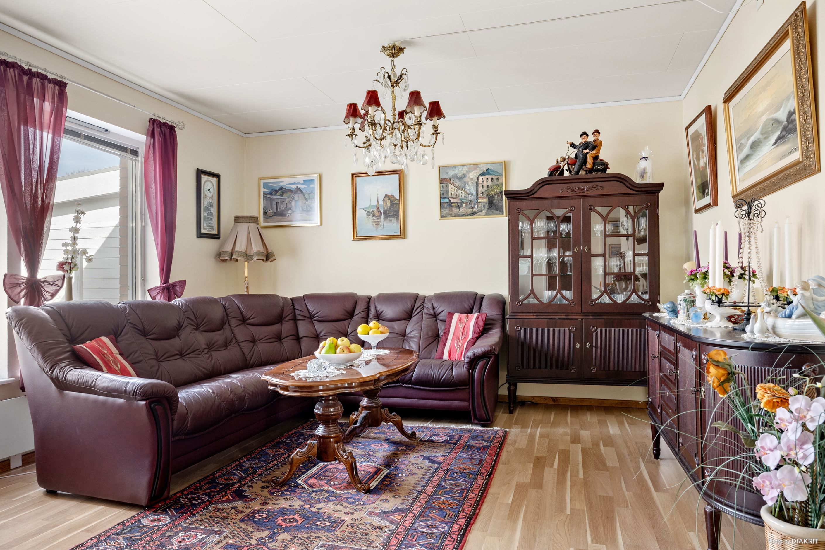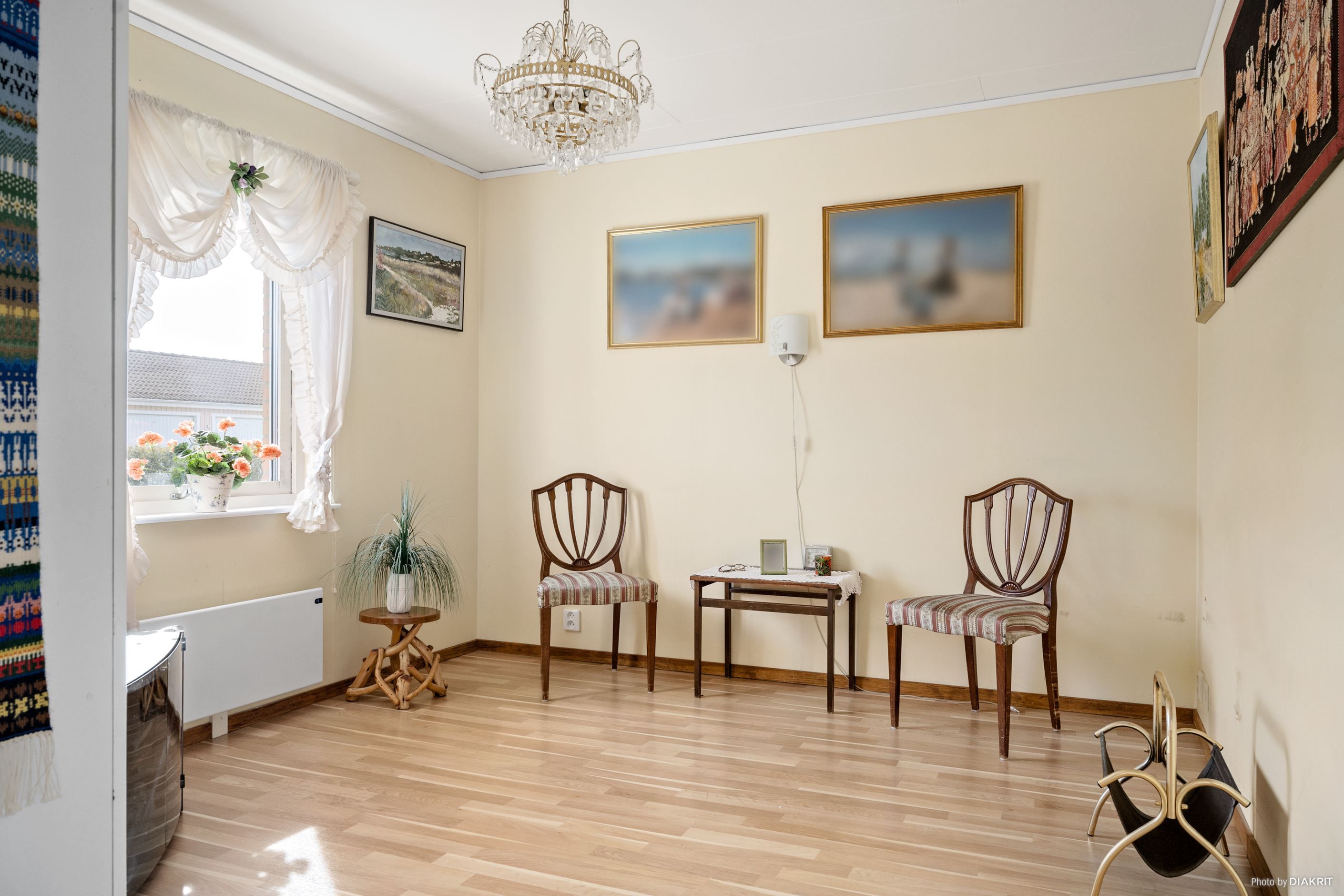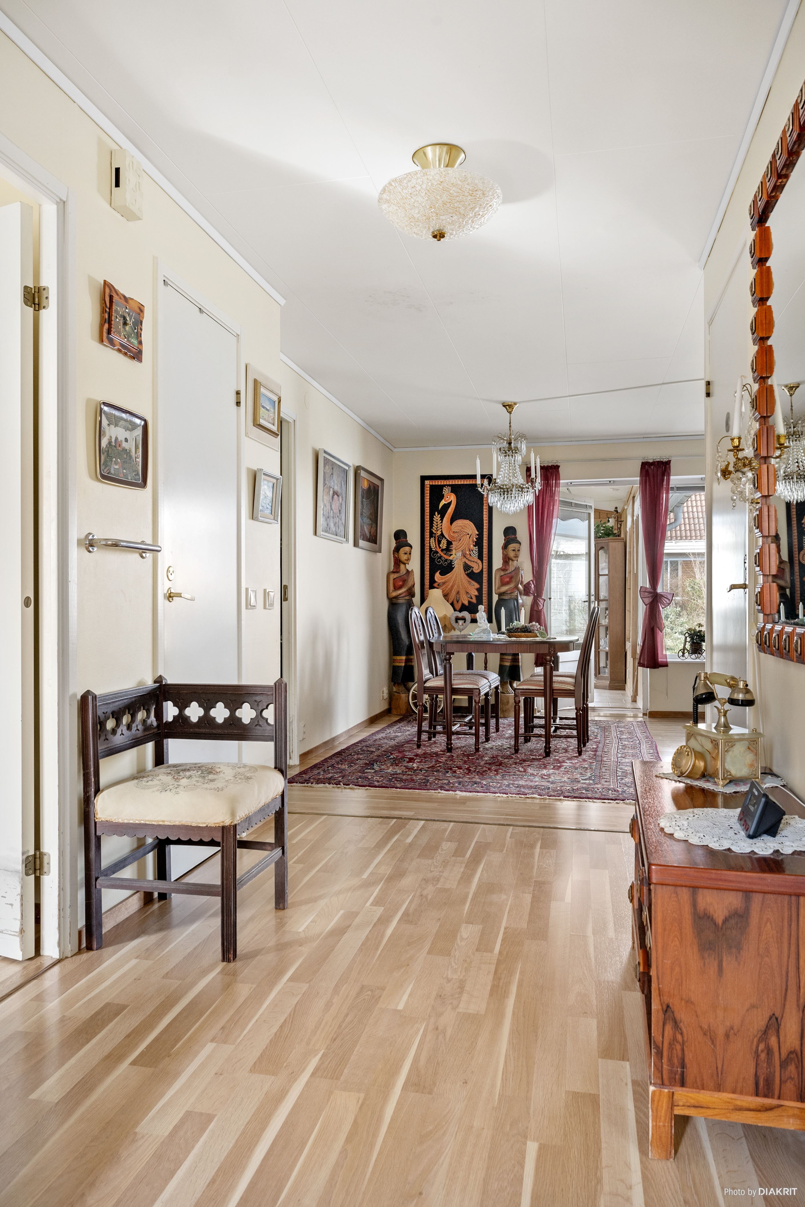 Bostaden har en genomtänkt planlösning med tre rum och kök, varav två sovrum. Skicket är genomgående välhållet och ombonat, med en tidlös standard som ger ett tryggt och bekymmersfritt boende från första dagen. Vardagsrummet har utgång till ett inglasat uterum som förlänger säsongen och blir en naturlig plats för både vardag och umgänge. Härifrån når du även den egna lilla trädgårdstäppan – lagom stor och lättskött, perfekt för odling, grill eller avkoppling i solen. På tomten finns dessutom ett praktiskt redskapsskjul.