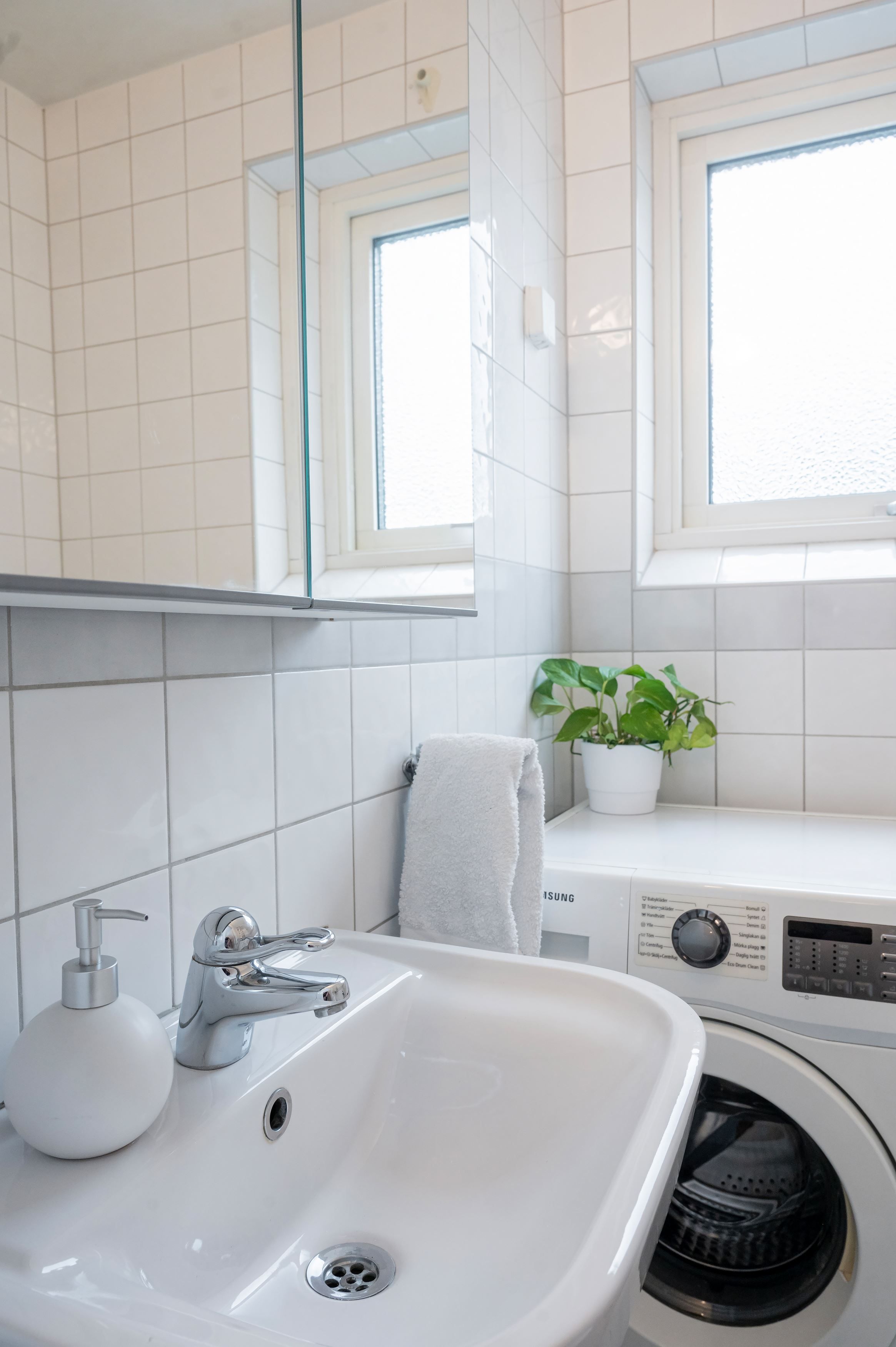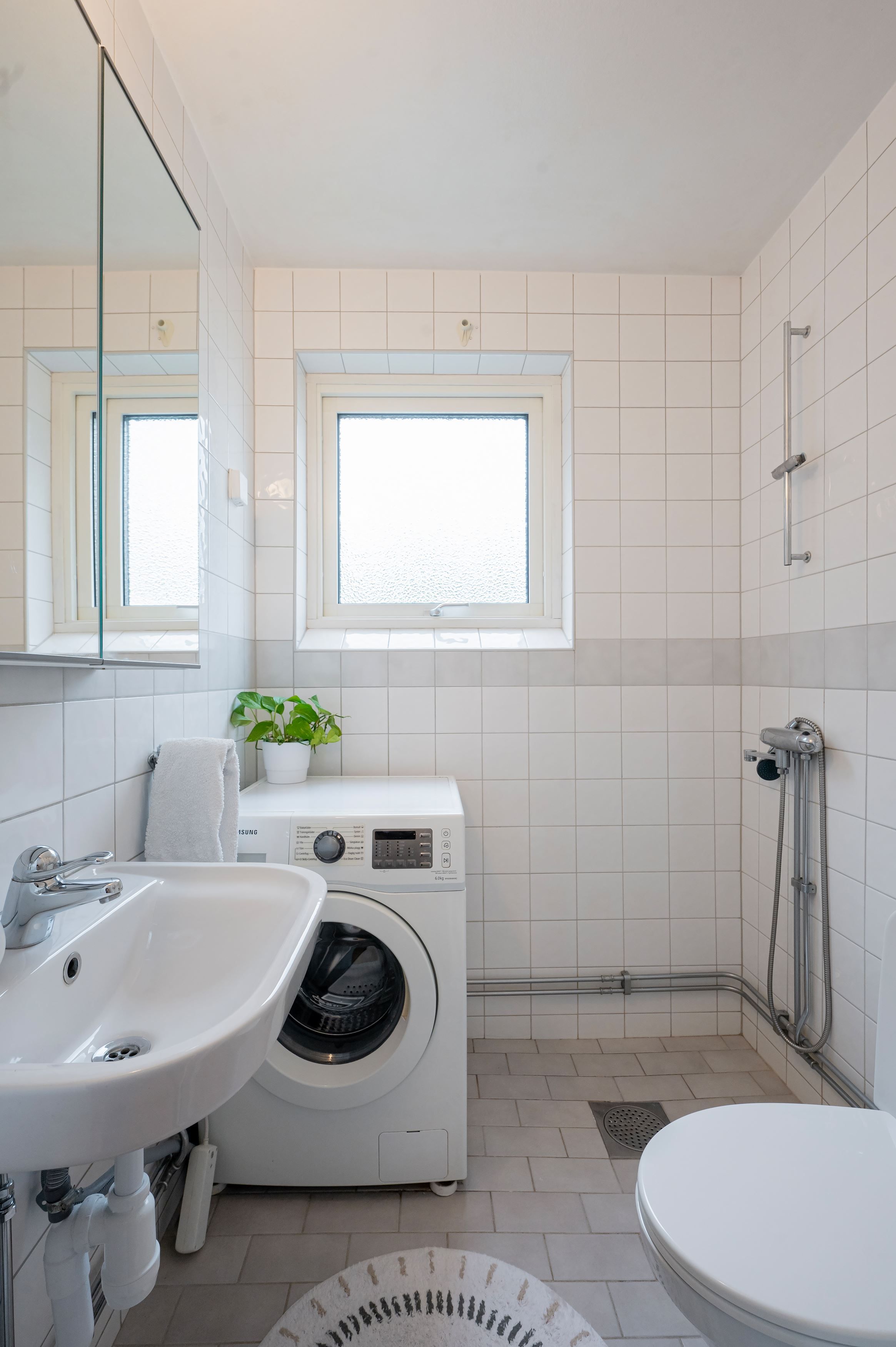 Badrummet är stambytt och håller en hög standard med golvvärme, dusch, wc, handfat samt en kombinerad tvättmaskin och torktumlare. Här finns även ett fönster som ger rummet ett naturligt ljusinsläpp och en extra känsla av rymd.
