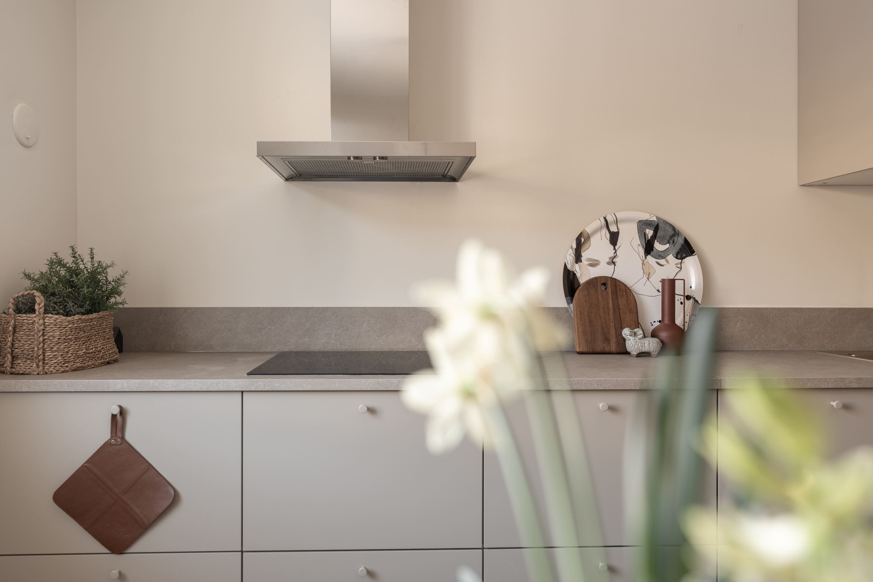 Köket är utrustat med komplett och noggrant utvalda vitvaror som gör matlagningen till ett nöje för hemmakocken. Planlösningen har byggts om för att skapa ett öppnare och luftigare intryck. Genom att öppna upp ingången har man fått en mer social atmosfär utan att kompromissa med funktion eller förvaring, perfekt för både vardag och middagar med vänner.