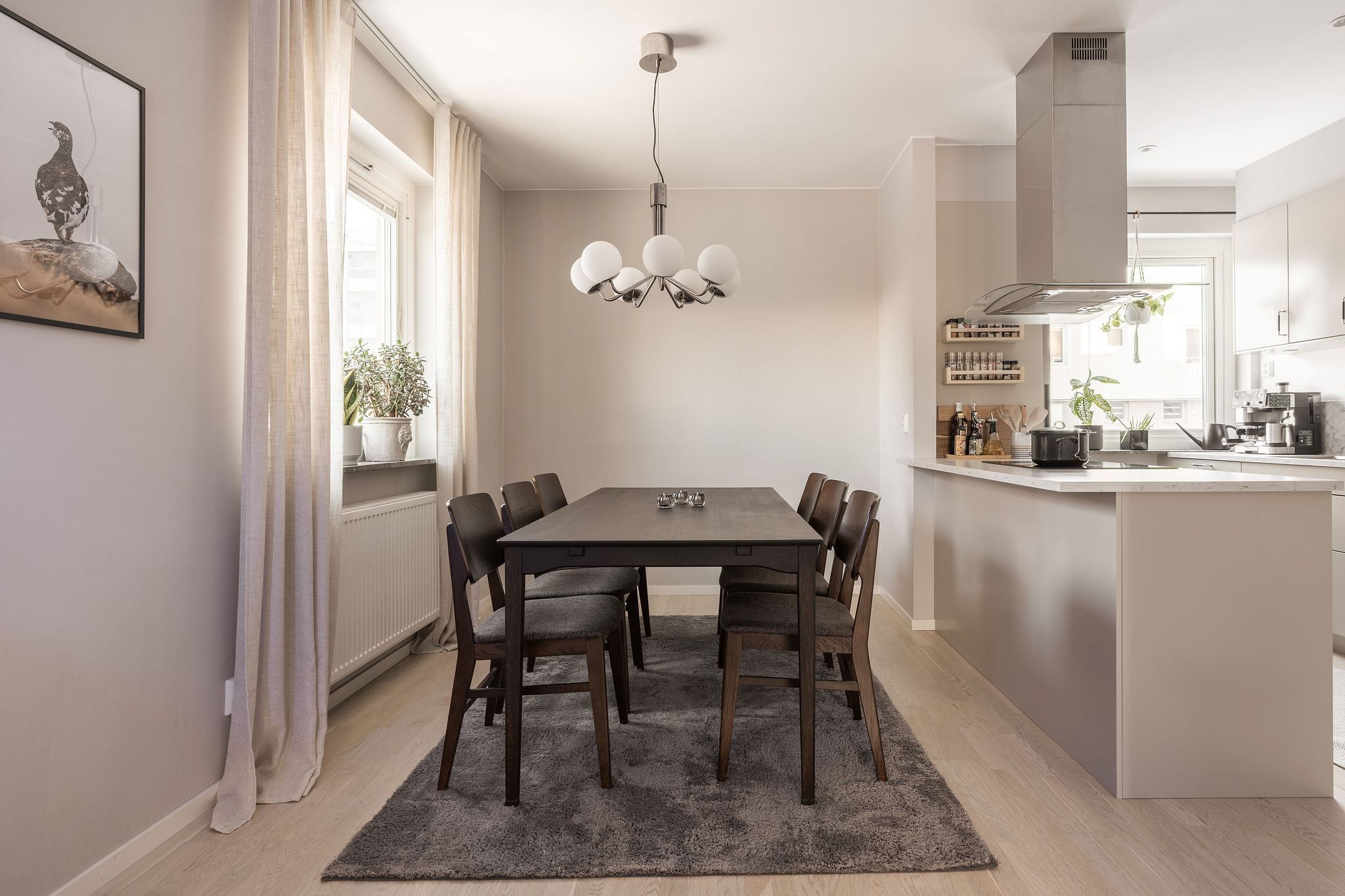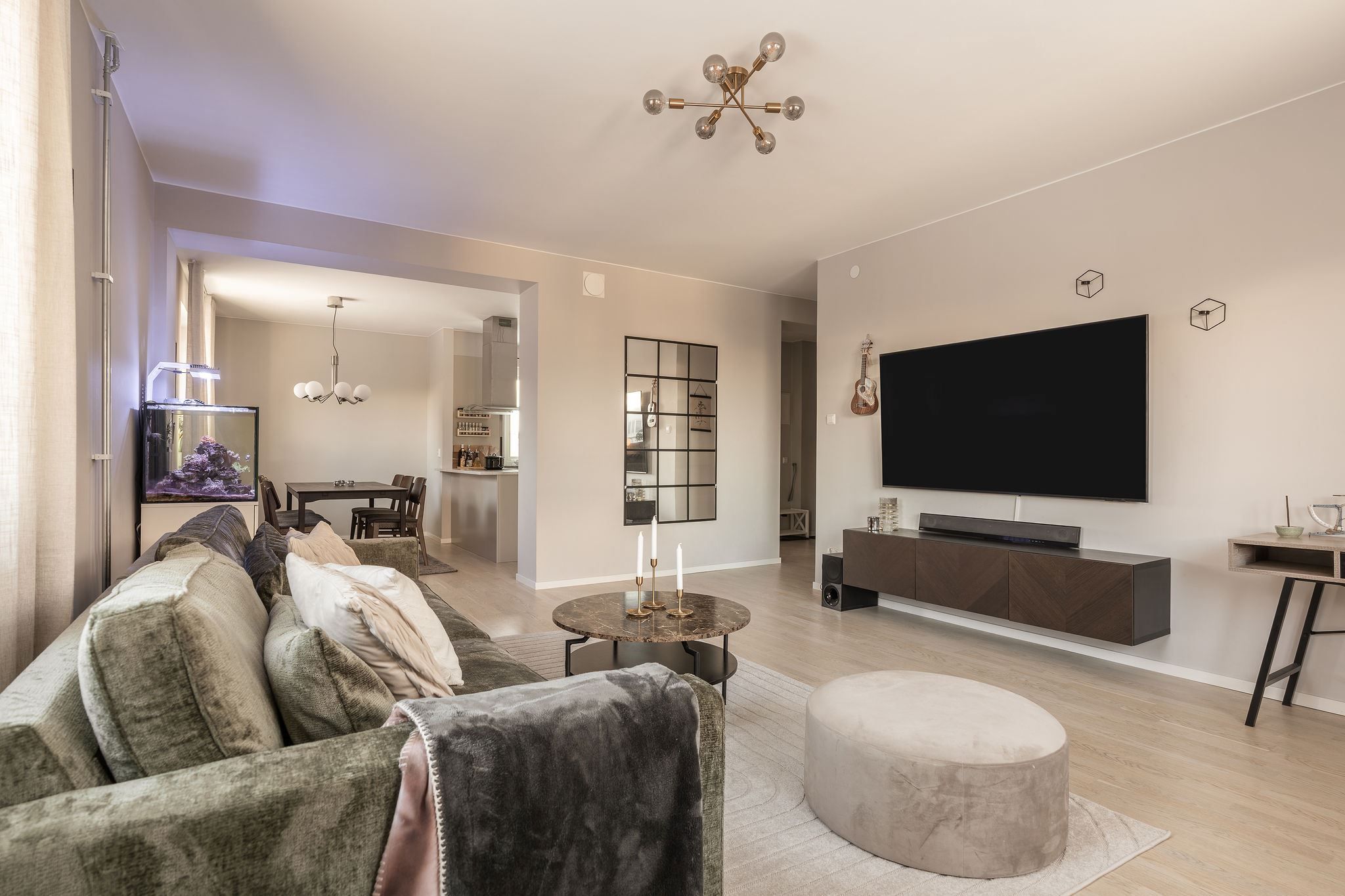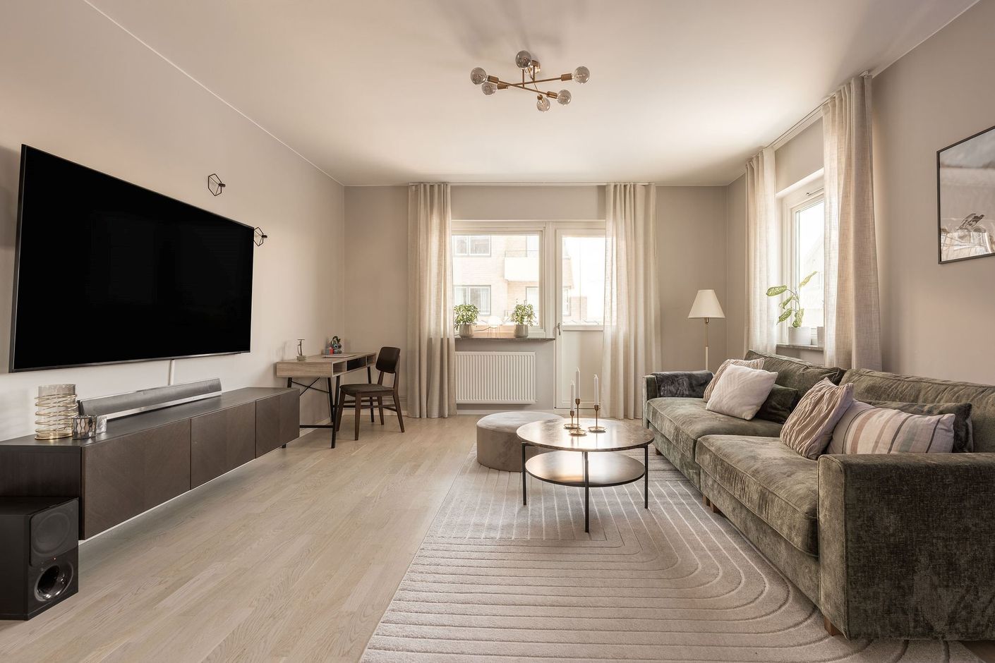 Bostaden erbjuder en social och trivsam planlösning där varje kvadratmeter är optimalt utnyttjad. Vardagsrummet är luftigt och inbjudande med generösa ytor och har en öppen planlösning med hemmets matplats och kök – en naturlig samlingspunkt för såväl vardag som fest. Ljuset flödar in och skapar en varm och välkomnande atmosfär.