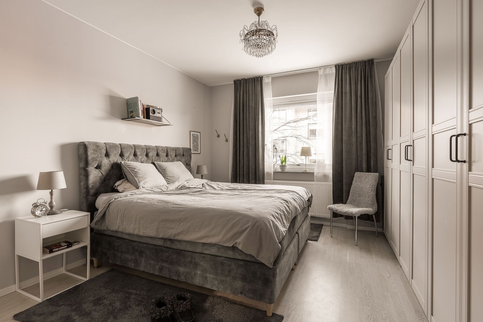 Det rymliga sovrummet erbjuder en harmonisk och rofylld miljö med en hel garderobsvägg som ger utmärkta förvaringsmöjligheter. Utöver detta finns även en egen klädkammare – en uppskattad detalj som förenklar vardagen och skapar ordning och reda.