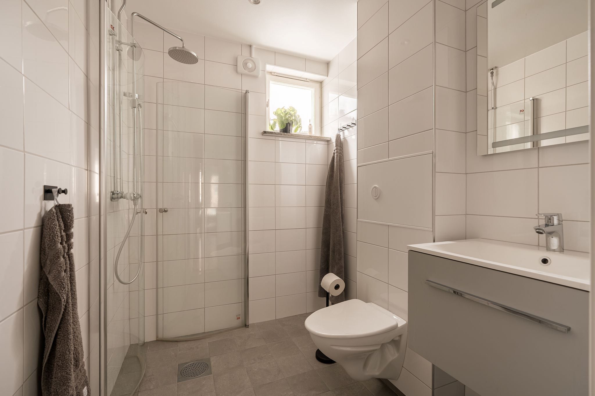 samt ett stilrent badrum med vägghängd wc, kommod, dusch och fönster som ger naturligt ljus.