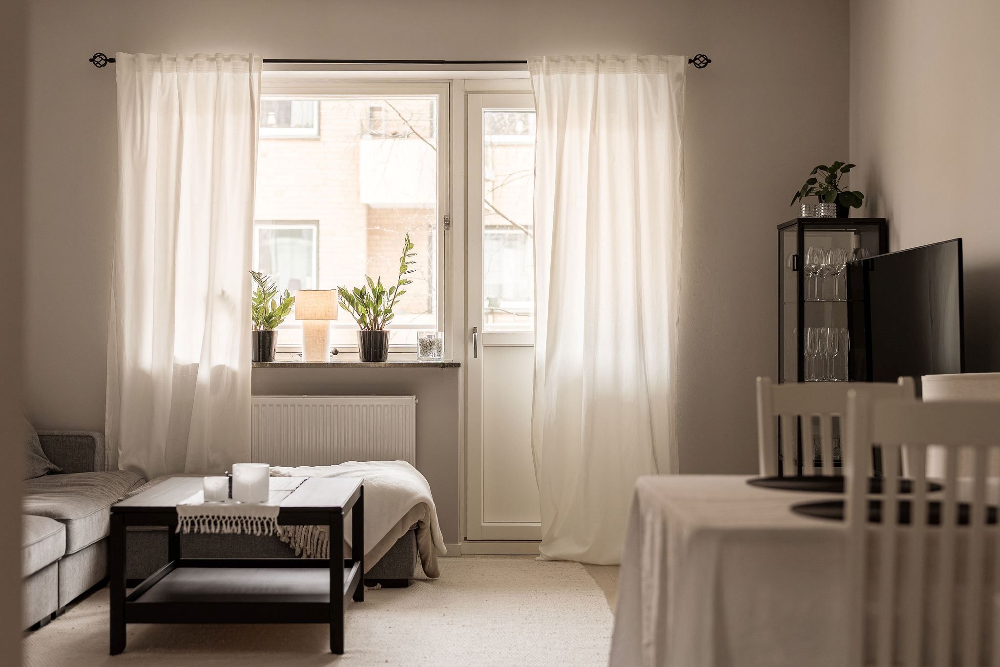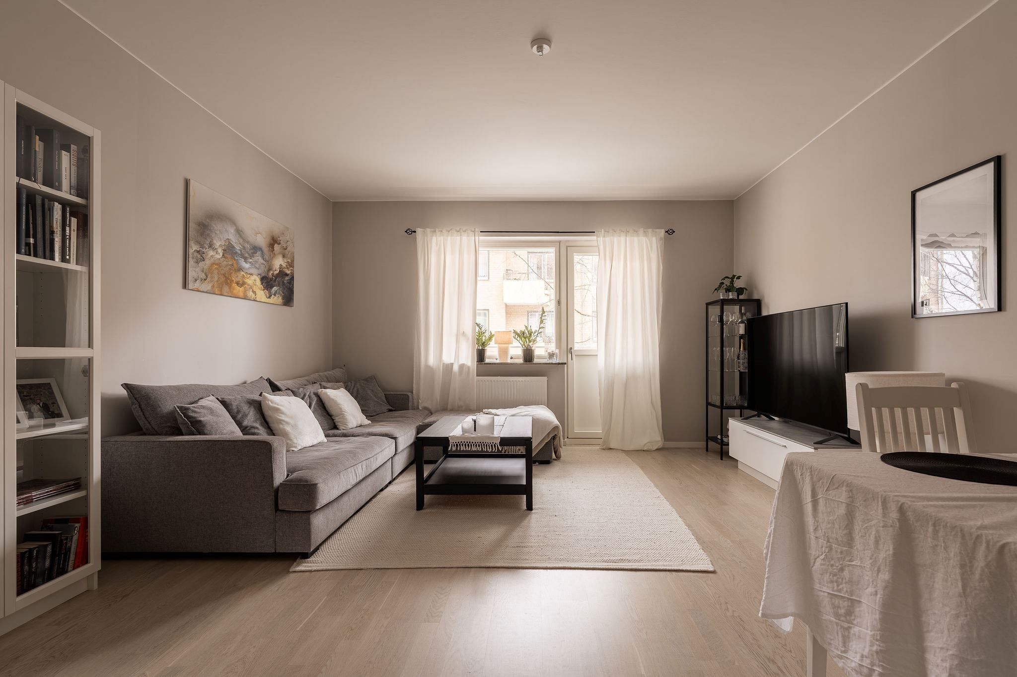 Planlösningen är både luftig och funktionell. Det generösa, ljusa vardagsrummet har direkt utgång till balkongen, en härlig förlängning av rummet under årets varmare månader.