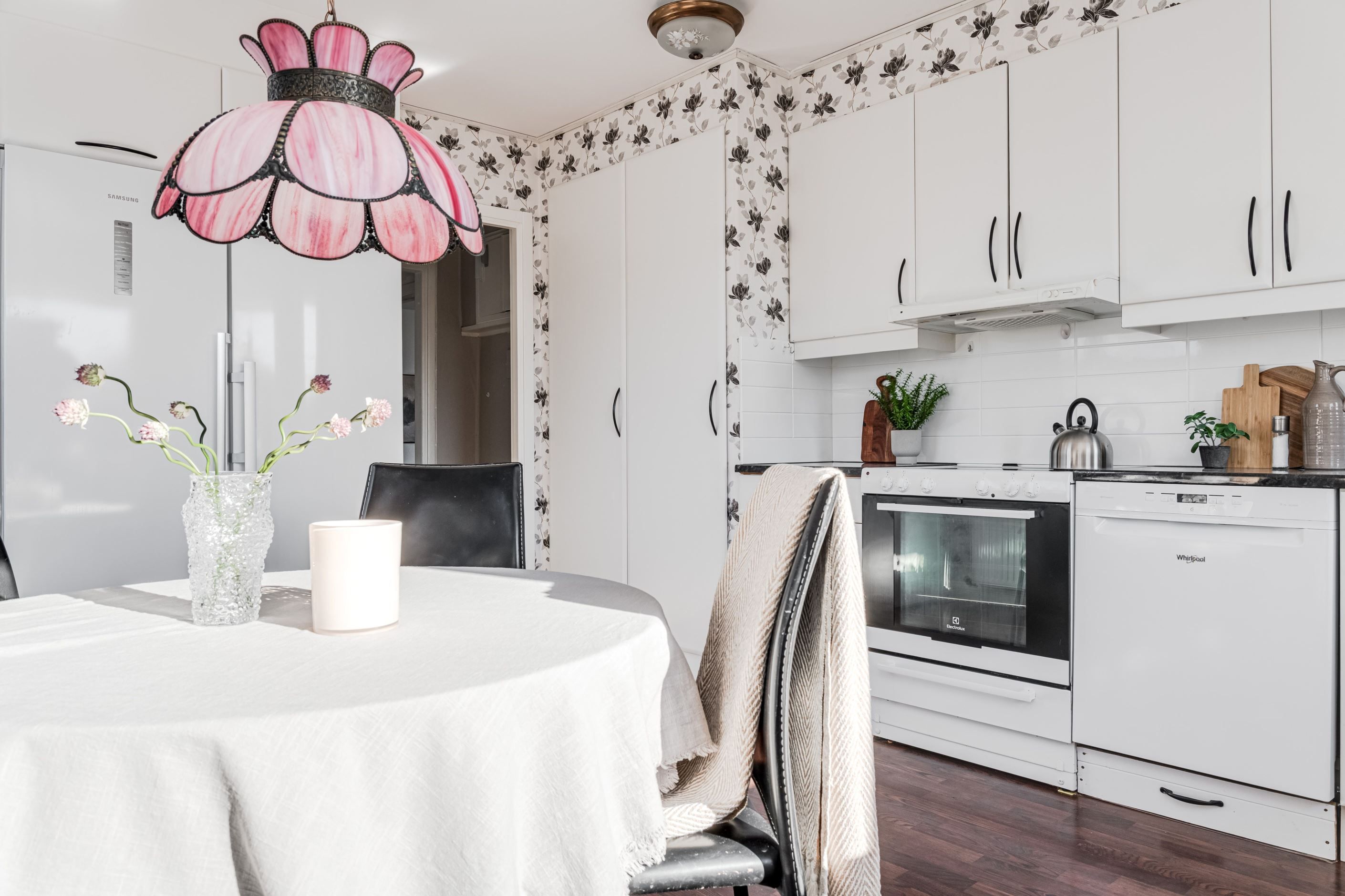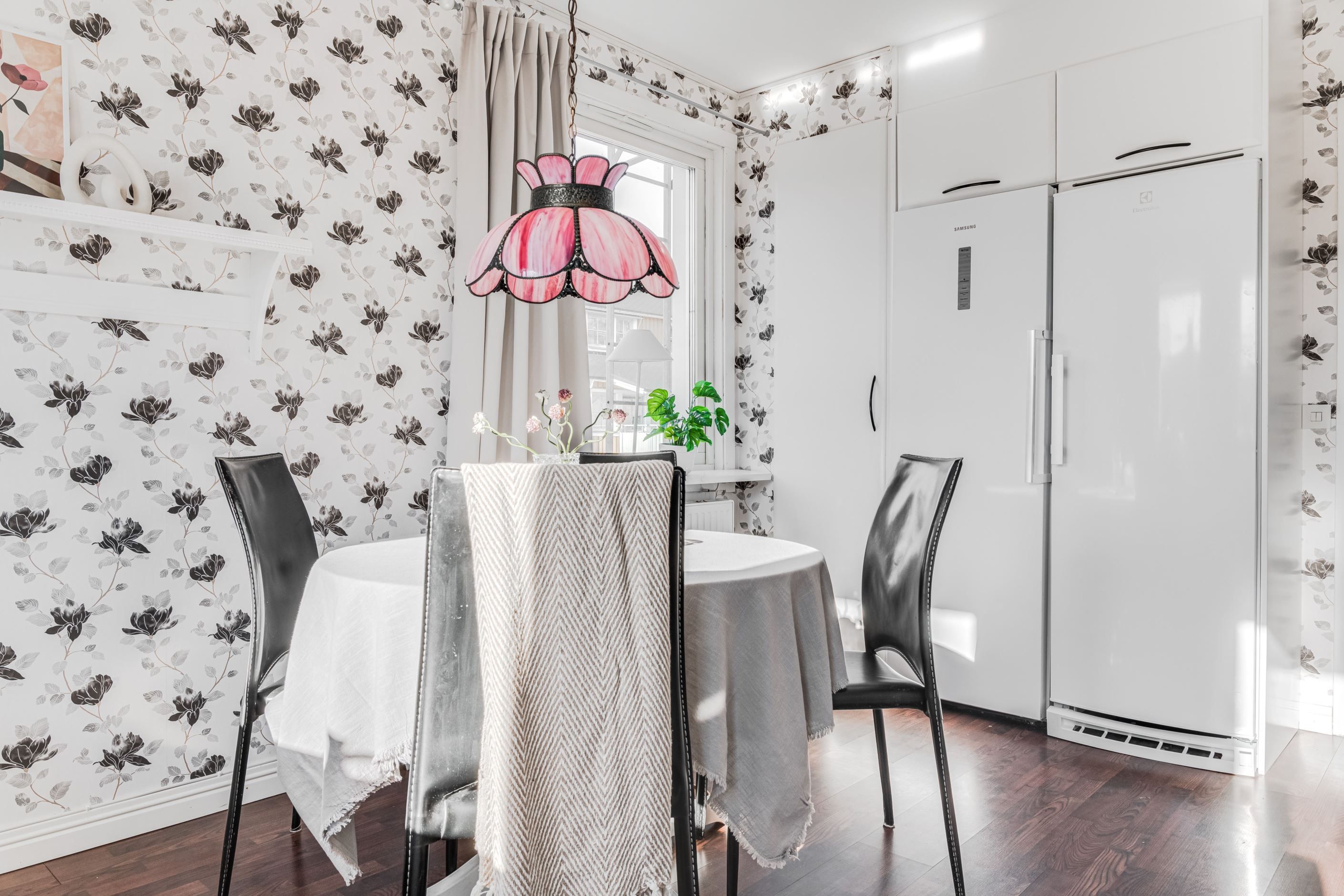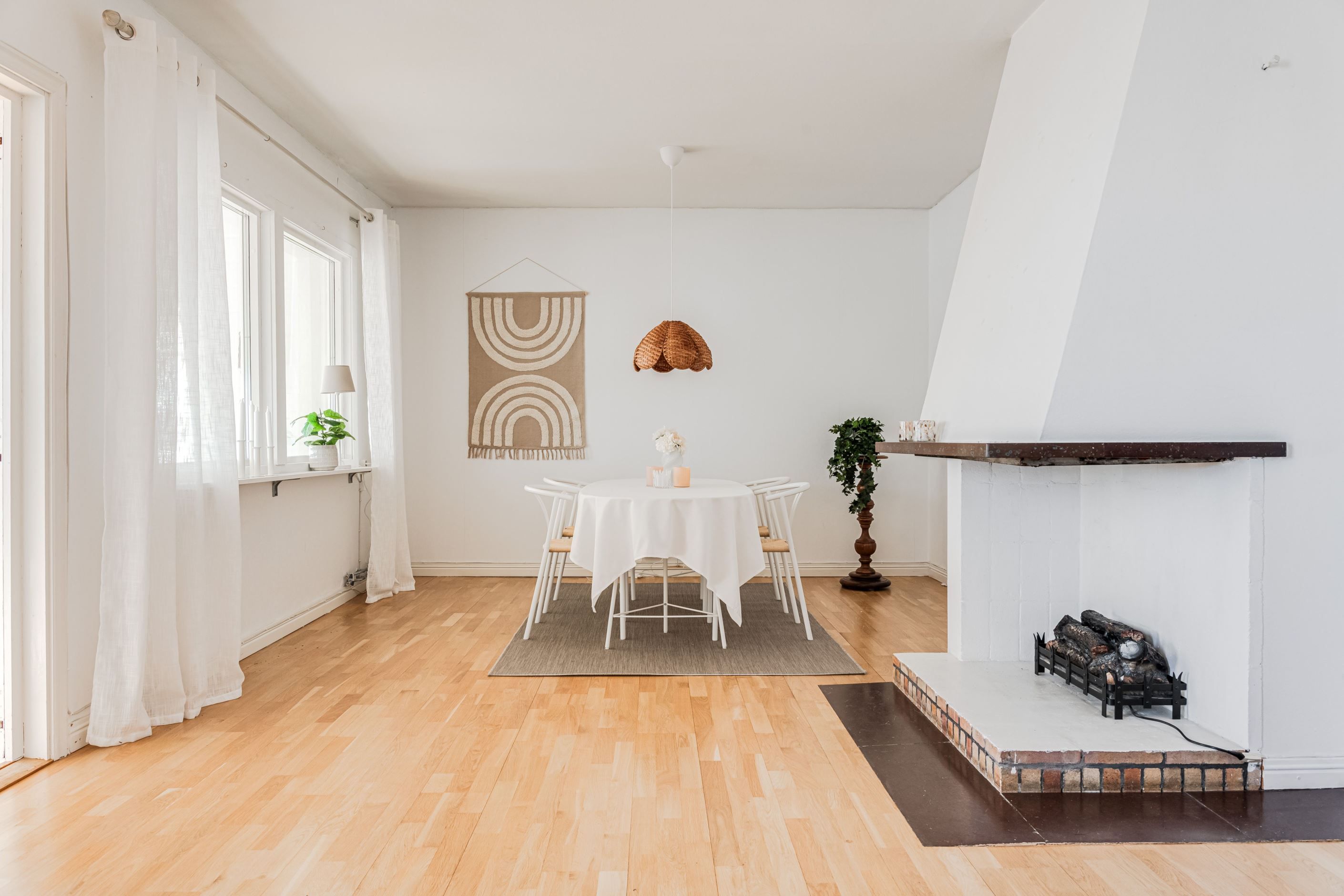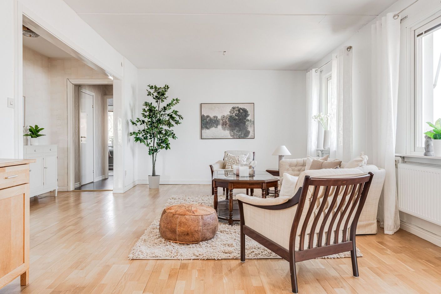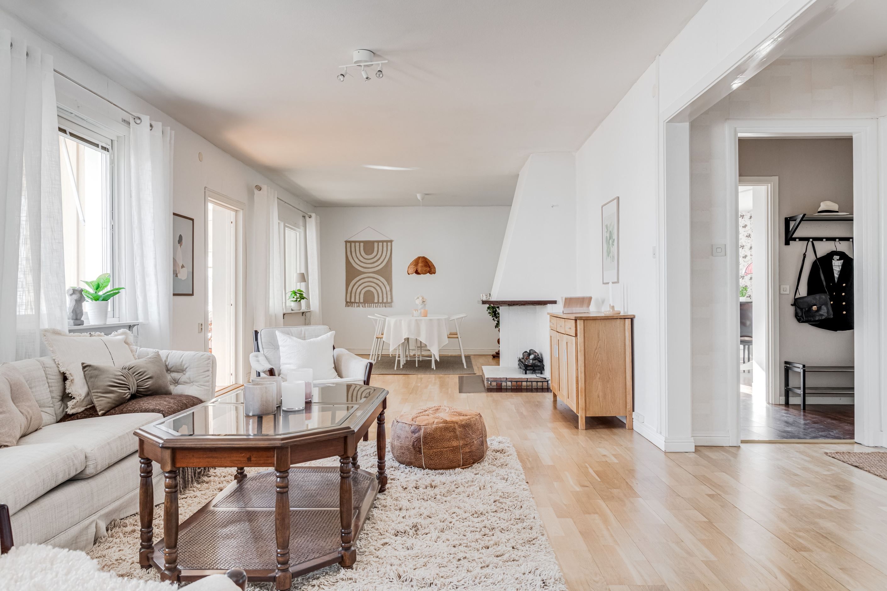 Lägenheten utgör ett helt våningsplan om 110 kvadratmeter boarea samt ett stort varmisolerat, uppvärmt, uterum om cirka 12 kvadratmeter.