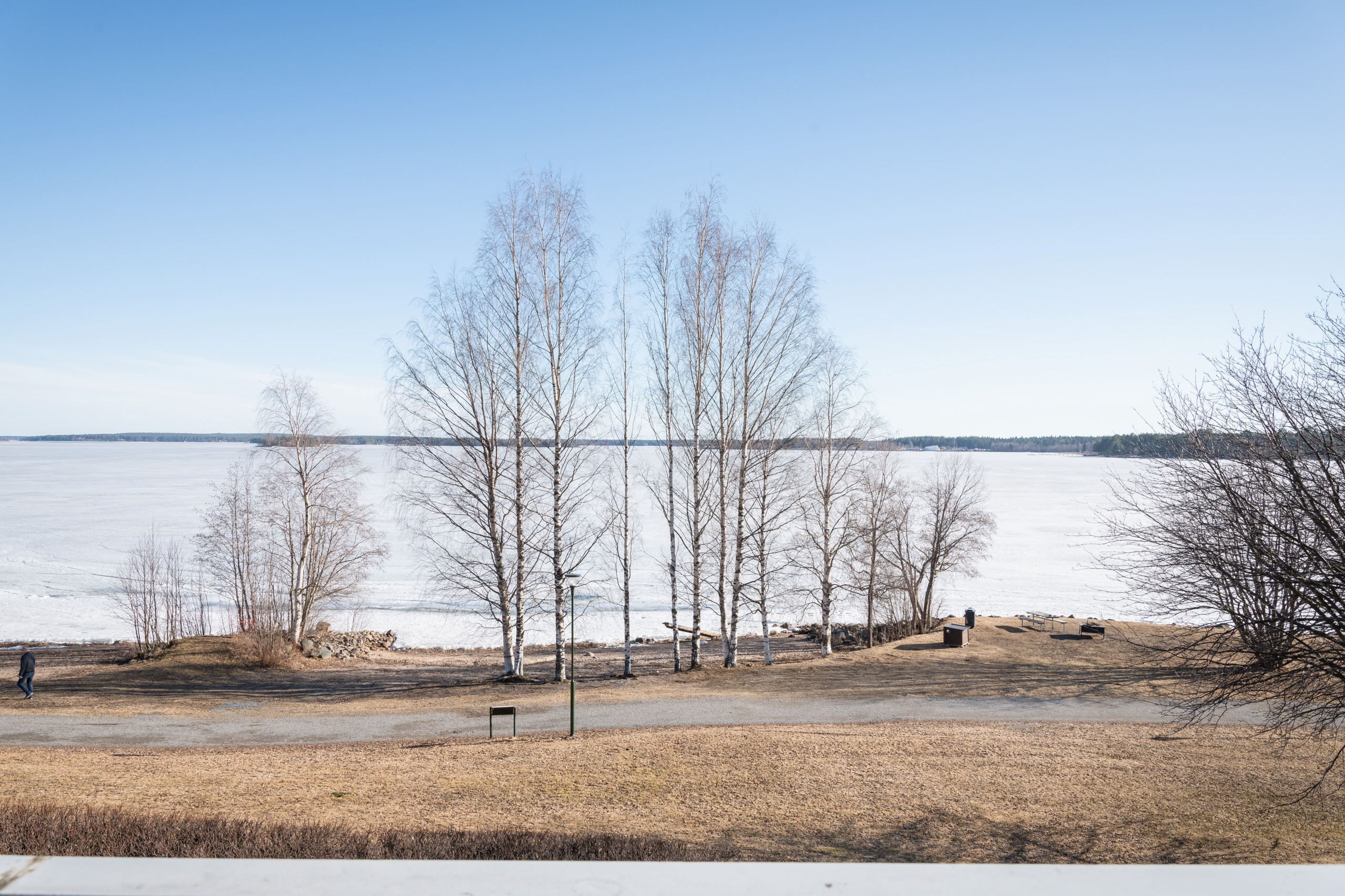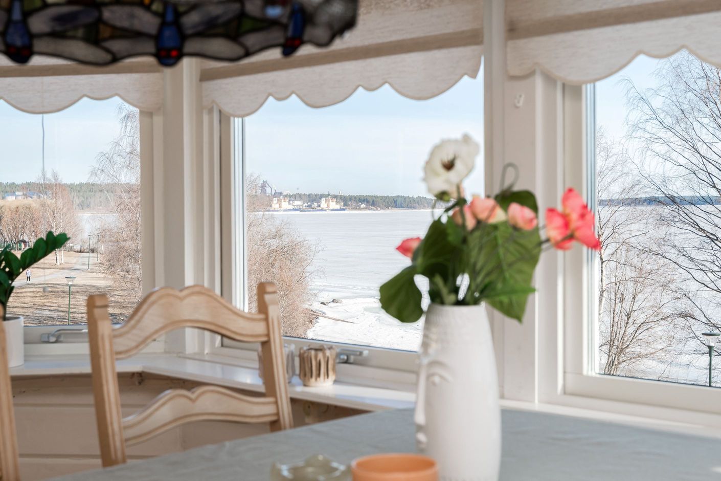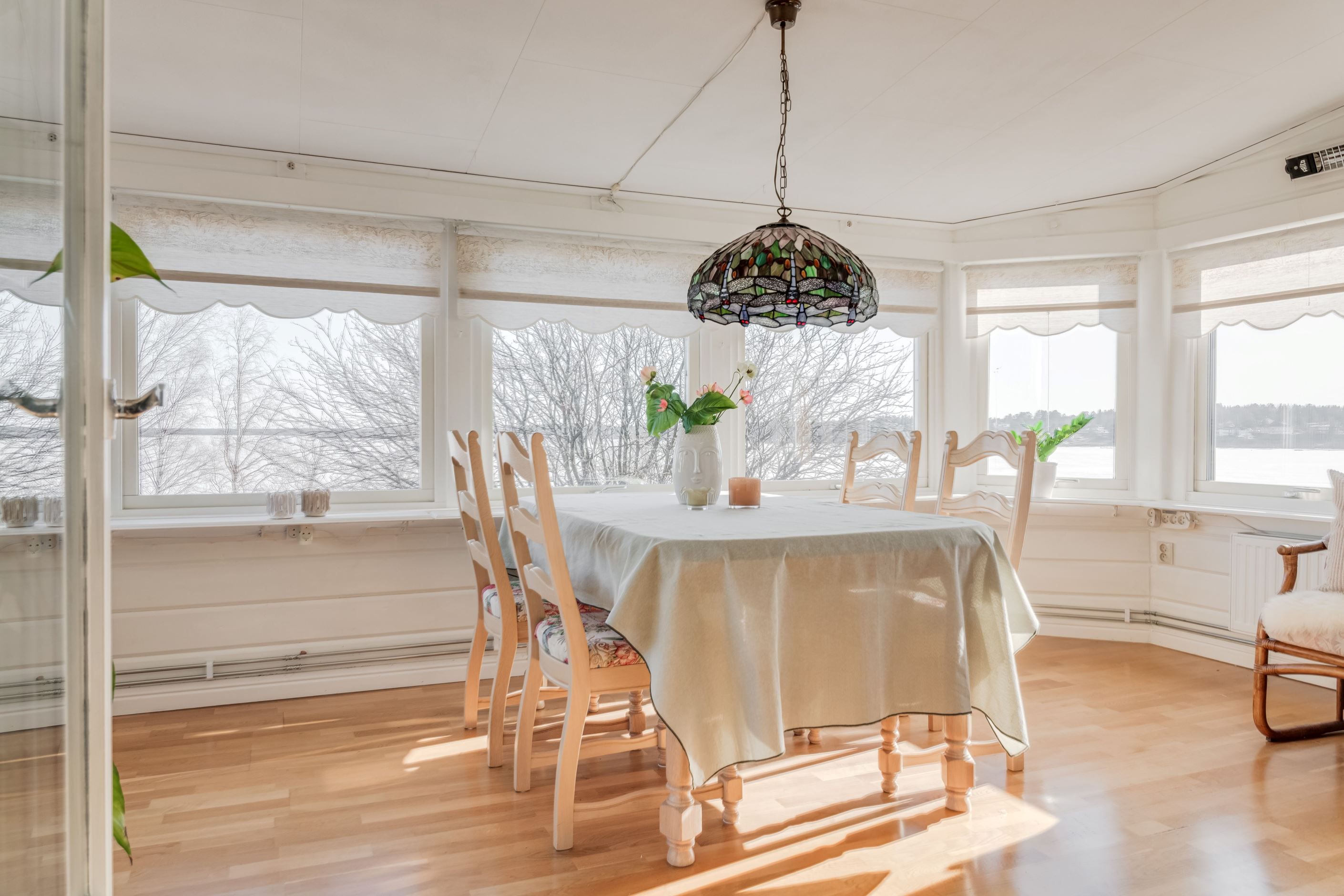 Vardagsrummet är mycket stort och har en dekorativ öppenspis, parkettgolv och tapetserade väggar. Rummet ger plats för såväl vardagsrumsmöblemang som matplatsmöbler om så önskas. Från vardagsrummet nås det stora varmisolerade och uppvärmda uterummet som ger en underbar utsikt mot vattnet. Köket är välutrustat och har gott om utrymme för det stora sällskapet. Köksinredningen är väl tilltagen och får ett fint ljusinsläpp tack vare fönster i två väderstreck.