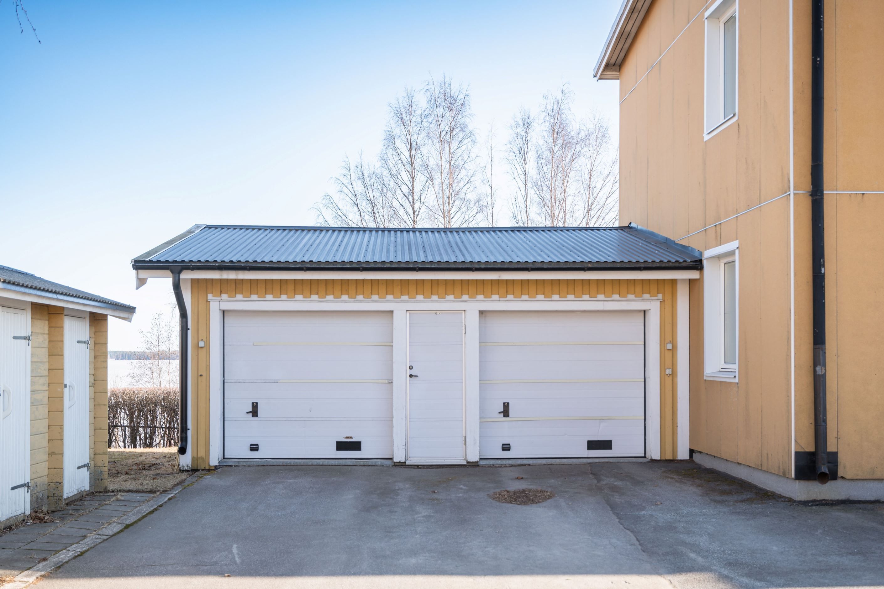 Tillhörande lägenheten finns ett varmgarage samt möjlighet att parkera ytterligare en bil på uppfarten framför garaget. I källarplan finns två ”normalstora” förråd, samt ett mycket stort förråd som ger massor av plats för förvaring eller kan användas som hobbyrum, musikrum eller gästrum.