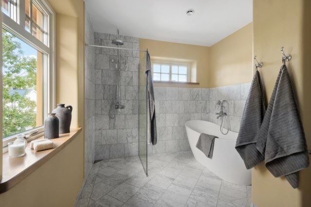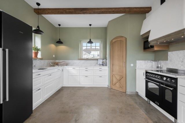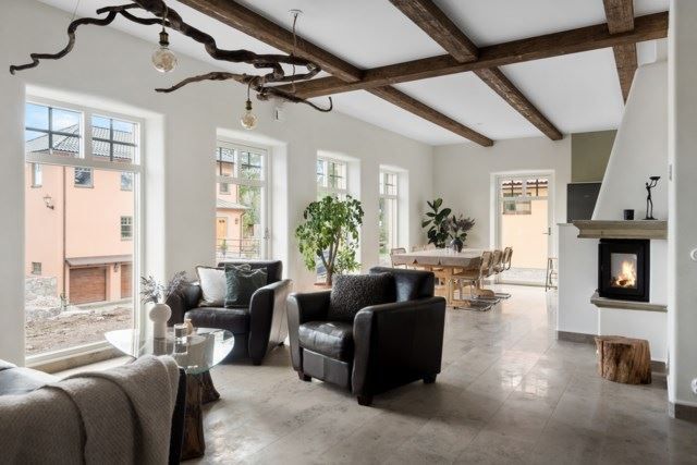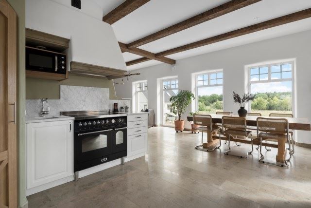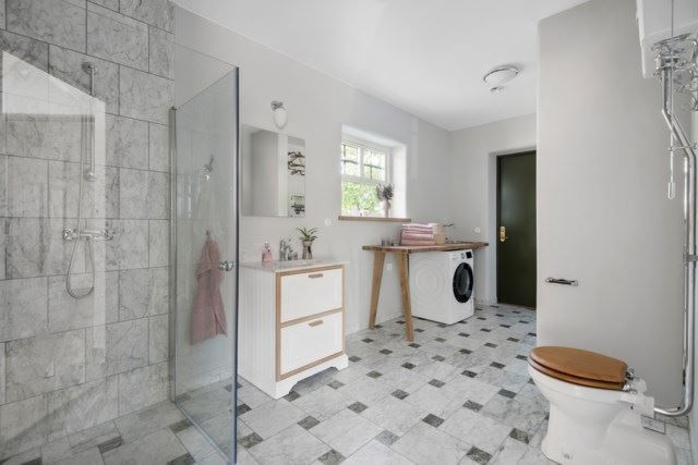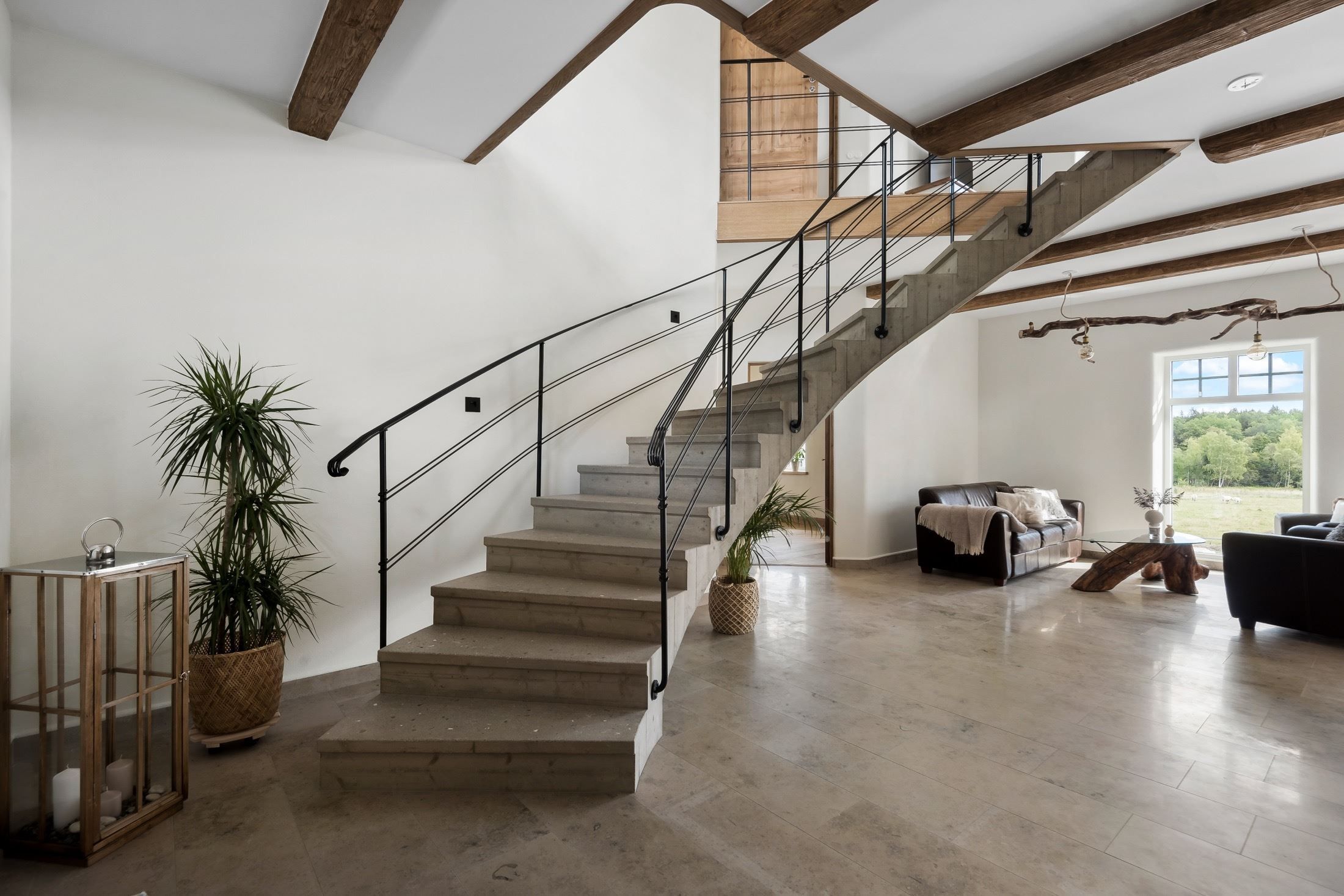 När ni kommer in i byggnaden genom huvudentrén och entréhallen, når ni direkt husets stora sällskapsdel med murad öppen spis med insats samt med öppen planlösning mot det öppna köket som kommer från Ballingslöv. Det här våningsplanet har också sovrum, gäst wc, dusch-/tvättavdelning med golv i natursten samt en magnifik entré med en svängd platsgjuten trappa som leder upp till husets övervåning.