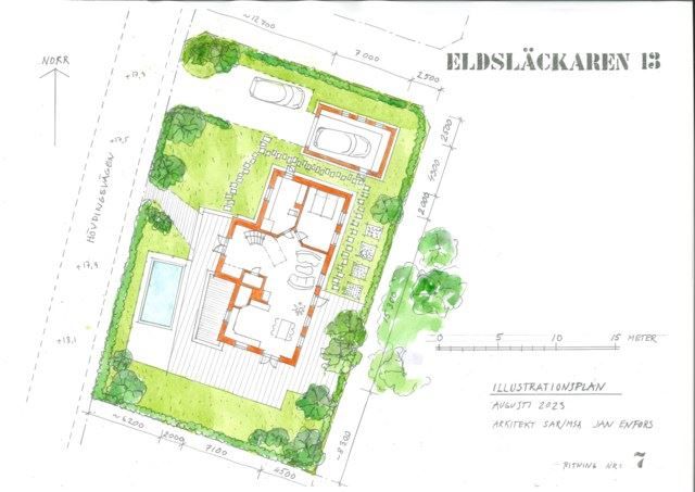 Fastigheten säljs endast med byggnation av illustrerat hus. Vissa anpassningar kommer att kunna göras vad gäller färgval och utrustning.