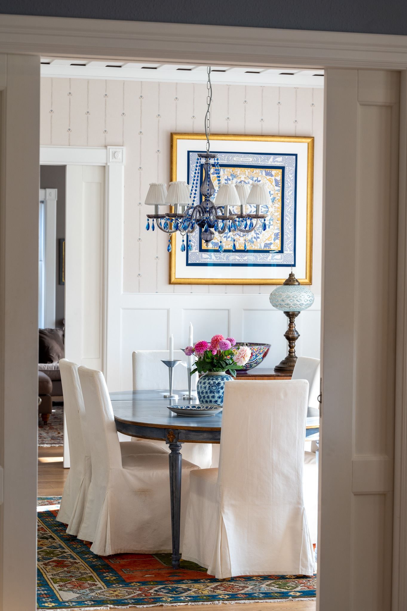Matsal med vacker utsikt och fint ljusinsläpp. Plats för en stor matgrupp och annan önskad möblering. Trägolv och väggar med en ljus mönstrad tapet samt vita bröstpaneler med spegel.