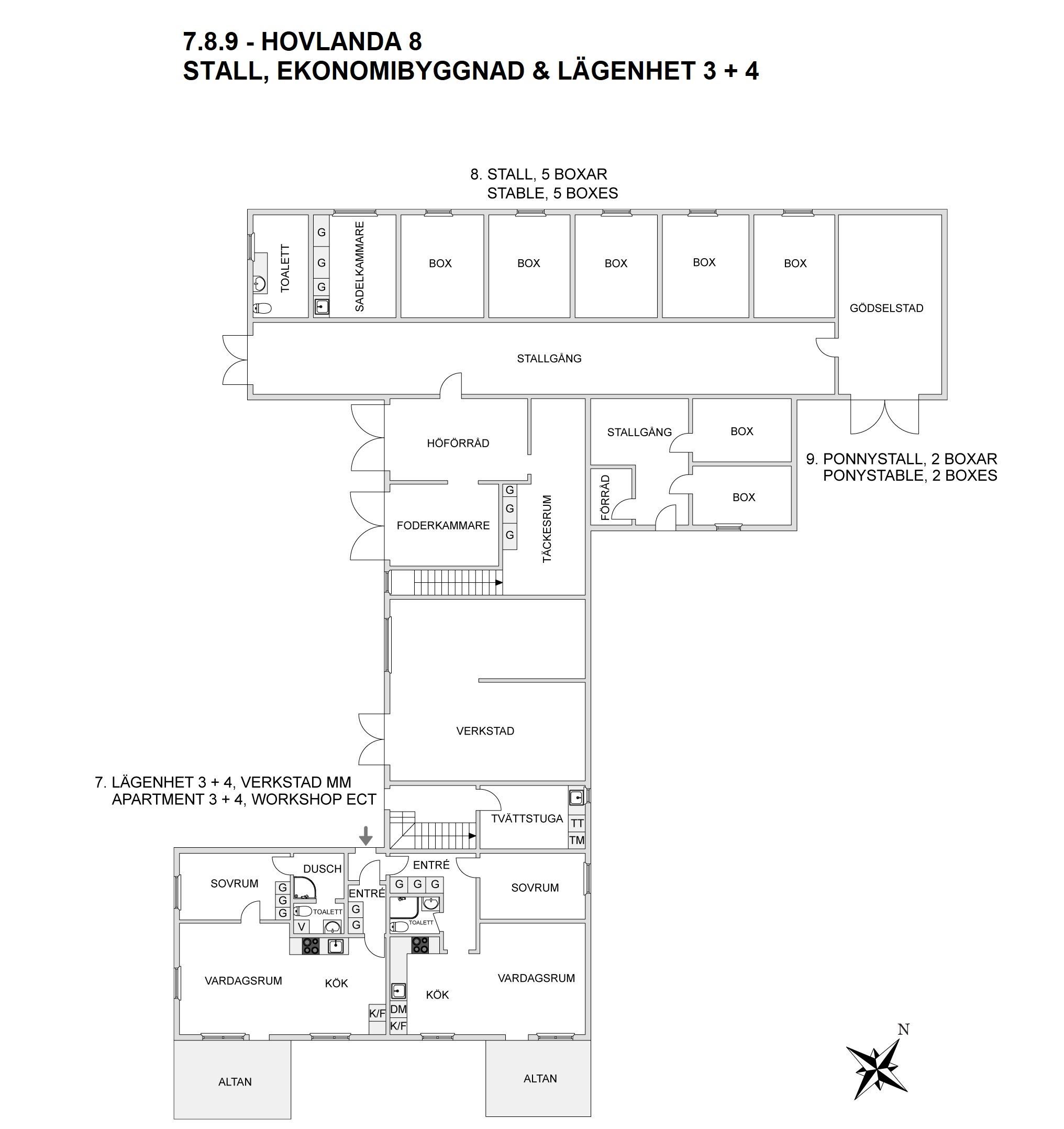 Stallet byggdes 2014 med 5 stora boxar med magnifika Baryardfronter av vackert trä och ramar i en mörkgrön kulör. Stallet inkluderar en foderkammare, en sadelkammare med ett litet pentry och toalett, ett torkrum, en sluten gödselstad och en separat förvaringslokal för täcken. På baksidan finns även ett separat sommarstall med två mindre boxar. Stallet har anslutning till en befintlig byggnad med en murad vägg emellan. Vidare finns en verkstad/garage, en äldre byggnad med träkonstruktion och gjuten platta. En trappa leder upp till ett isolerat utrymme som för närvarande inrymmer en tvårumslägenhet men kan omvandlas till fyra lägenheter. På entréplanet finns två tvårumslägenheter om ca 45 kvm styck samt en gemensam nybyggd tvättstuga.