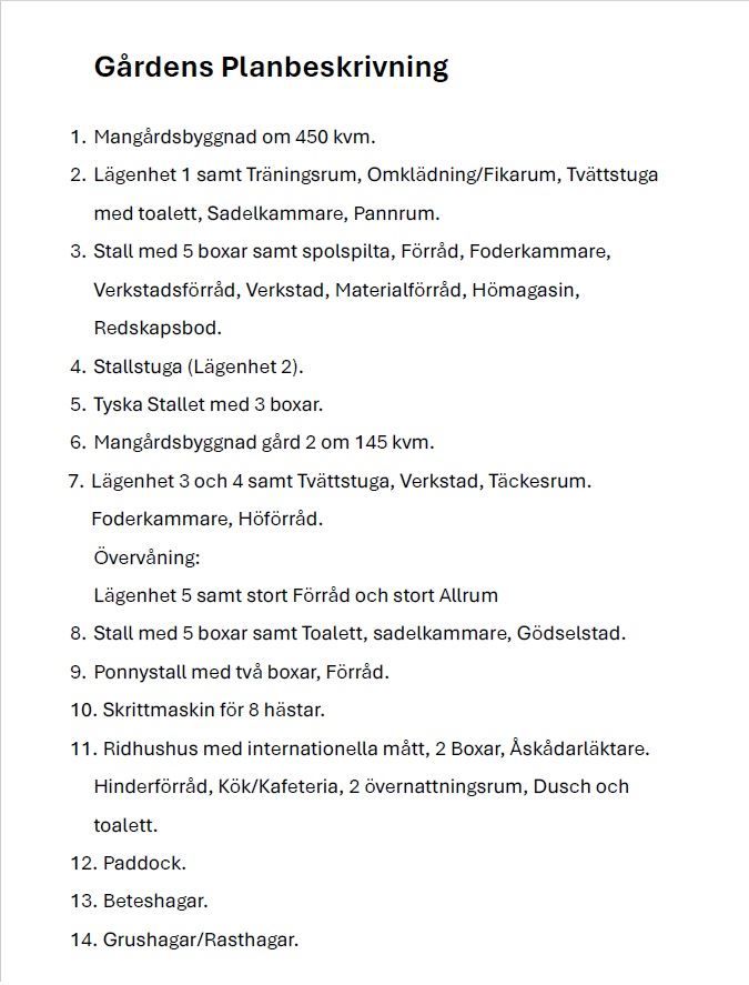 Gårdarna innefattar 2 boningshus, 5 lägenheter, 3 stall plus ett sommarstall, plats för 15 hästar, ekonomibyggnader, ridhus, skrittmaskin, terrängbanor, betesmarker och paddockar.