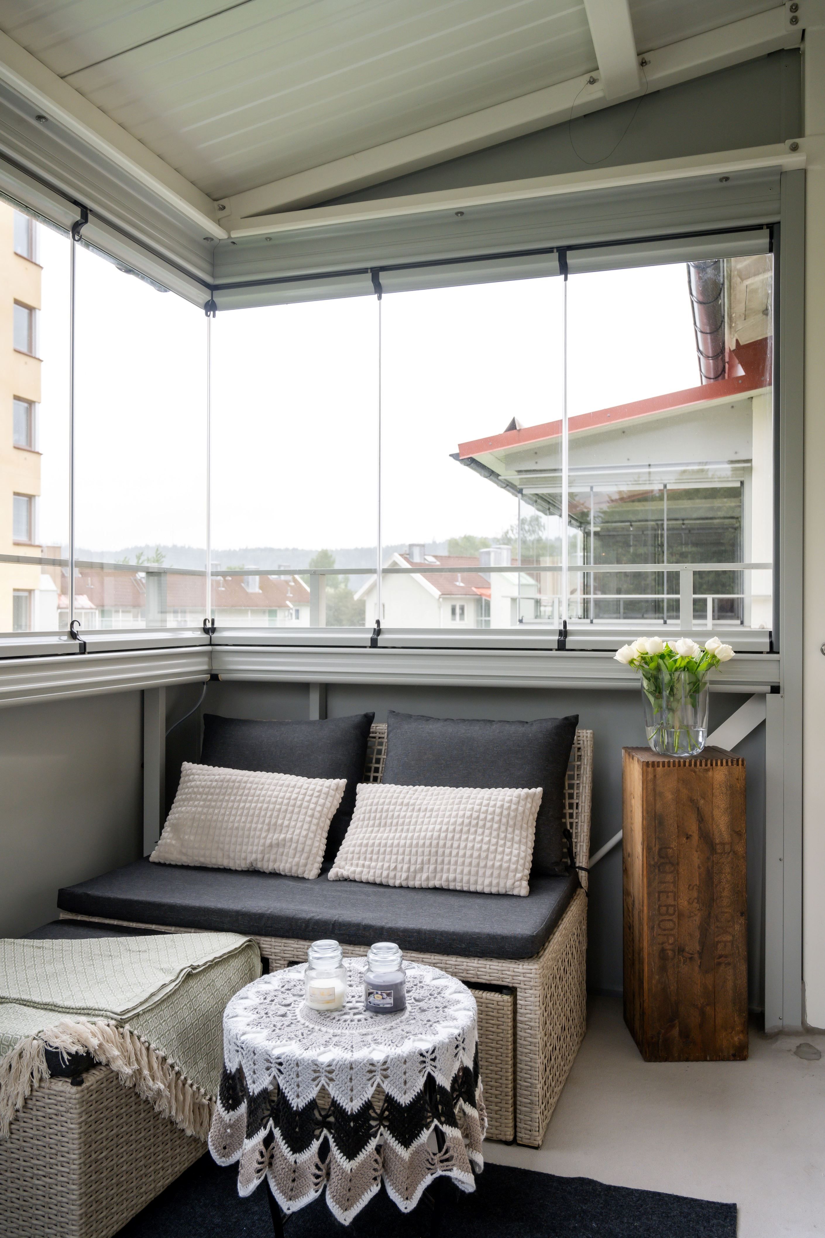 Från vardagsrummet nås en go inglasad balkong som vetter mot sydväst. Det blir en ljus förlängning av rummet, härifrån har du fin utsikt över området och naturen, med sol som trevligt sällskap från förmiddag till sen kväll.
