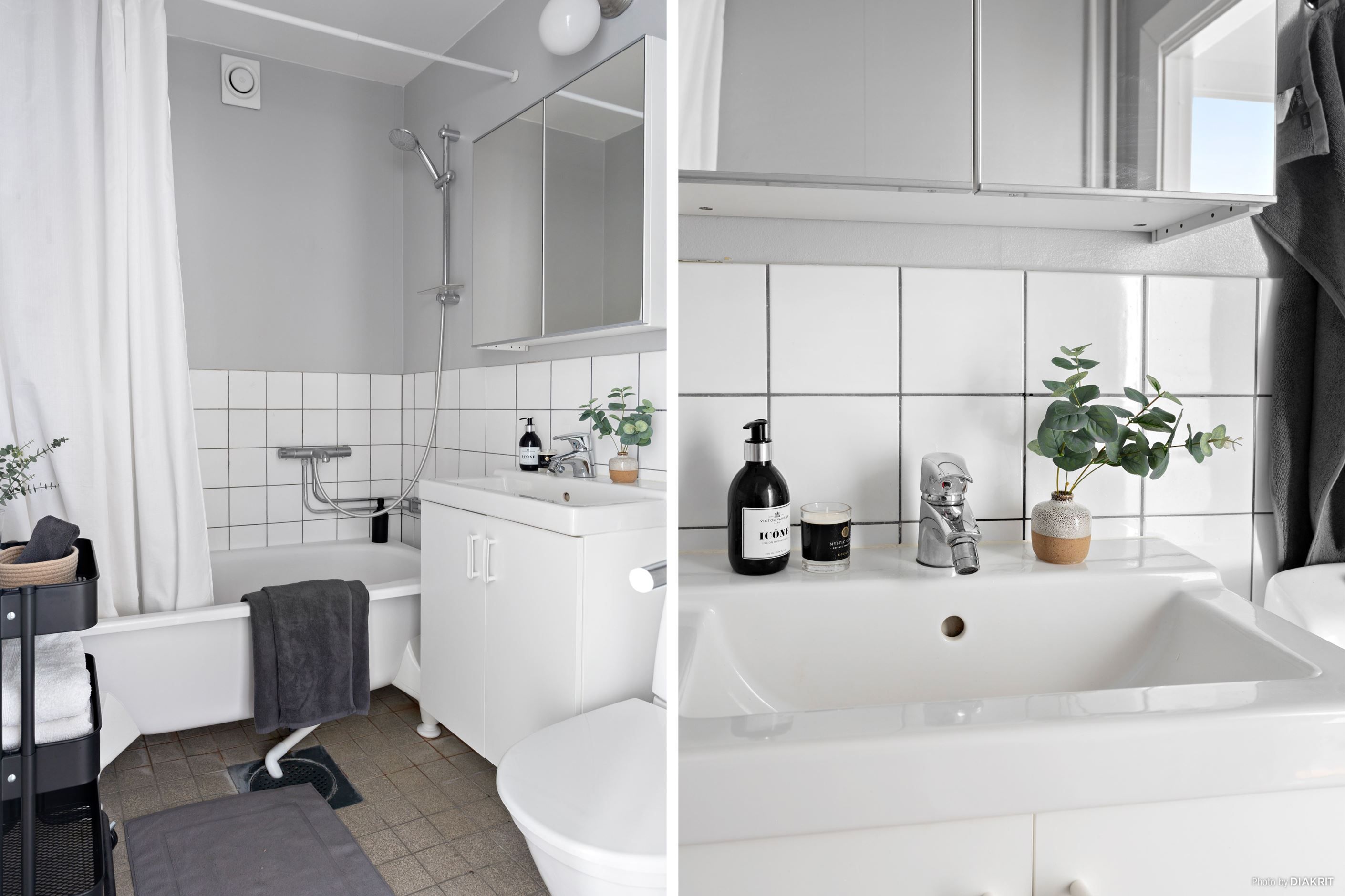 Badrummet är praktiskt utformat med helkaklade väggar och slitstarkt golv. Här finns badkar med duschmöjlighet, handfat med kommod, spegelskåp samt wc, en funktionell och lättskött lösning för vardagens behov.