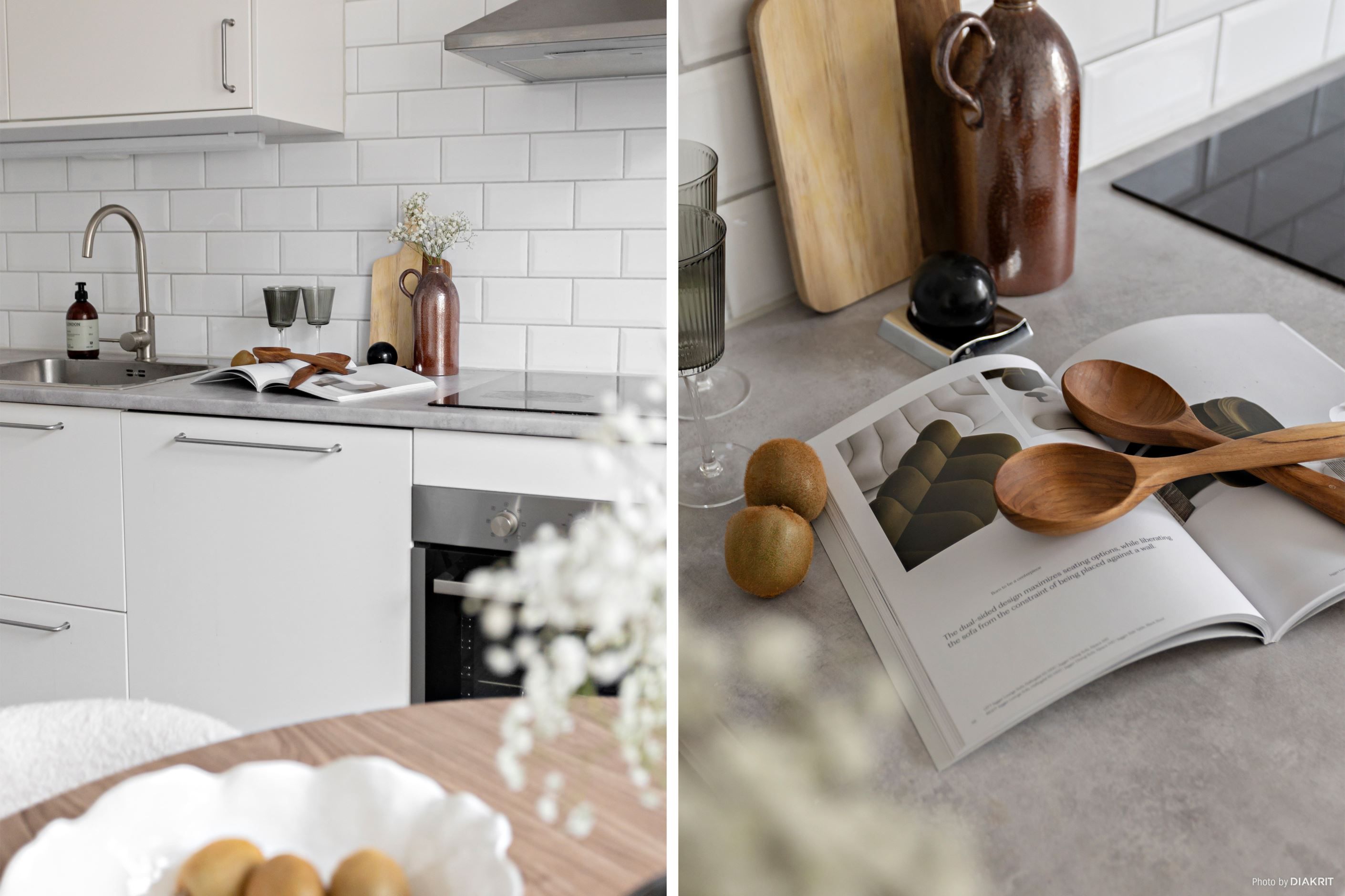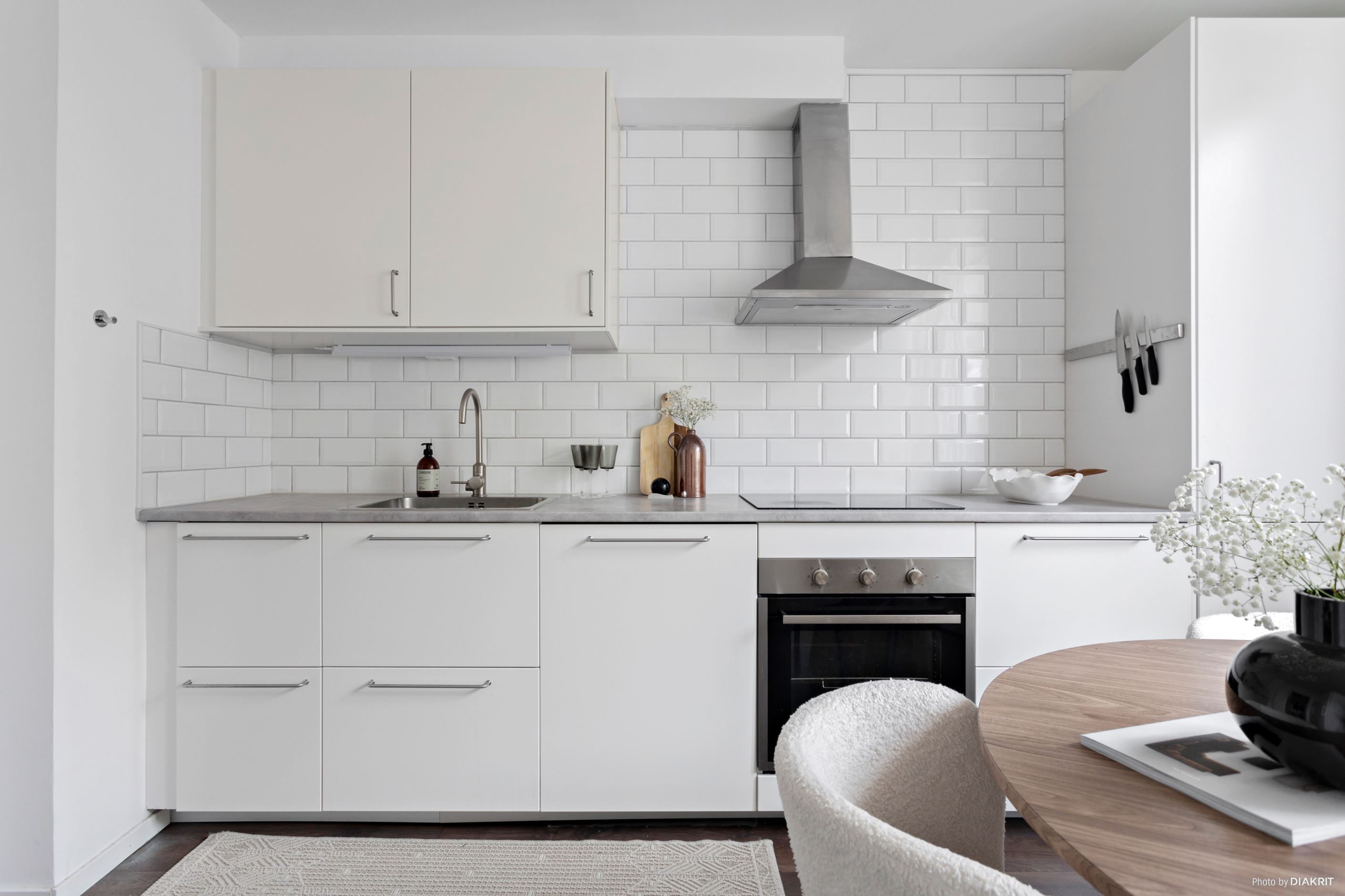 Köket är stilrent och funktionellt med goda arbetsytor och förvaring bakom ljusa skåpsluckor. Här finns induktionshäll, ugn, diskmaskin samt integrerad kyl och frys, vilket skapar en enhetlig och modern helhet. Planlösningen ger även plats för matgrupp och gör köket till en trivsam del av bostaden.