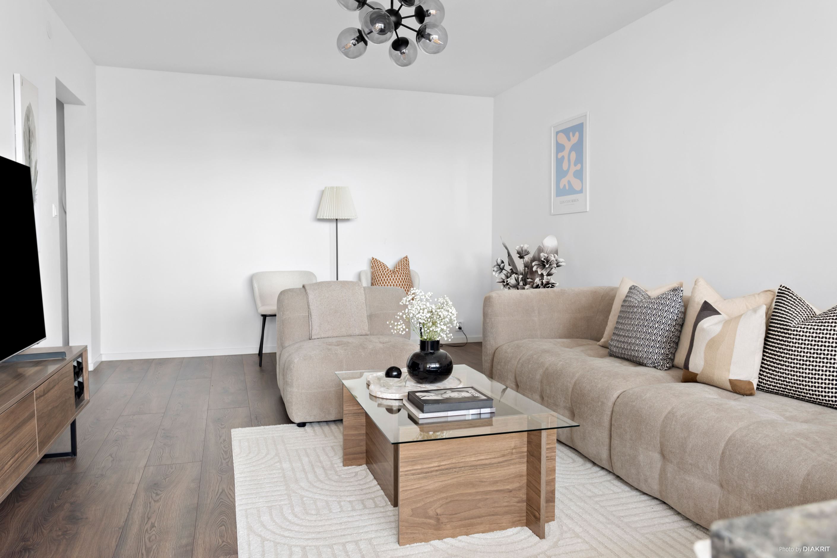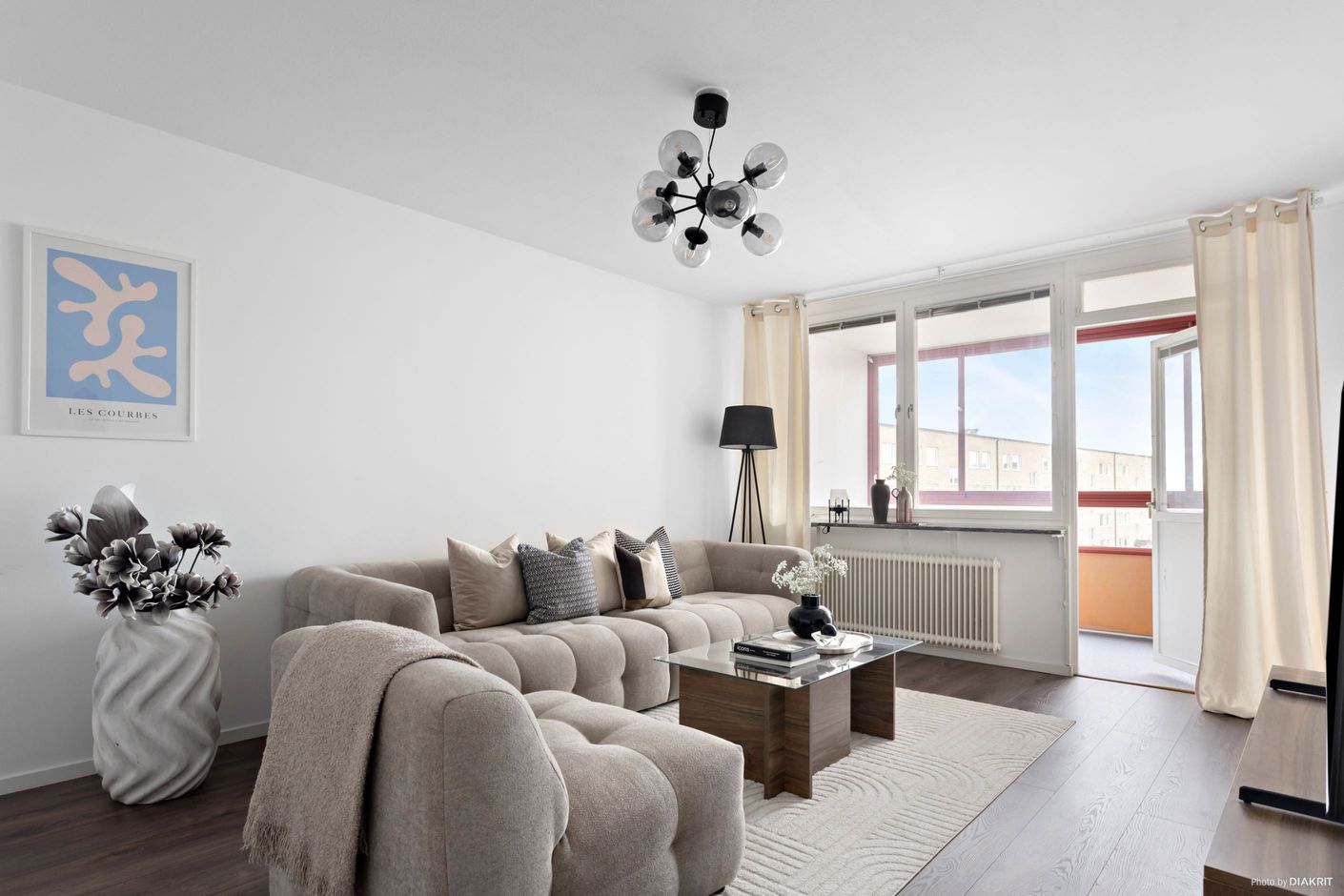 Vidare in öppnar vardagsrummet upp sig med generösa ytor och ett härligt ljusinsläpp från stora fönsterpartier. Här finns gott om plats för både soffgrupp och övrigt möblemang, vilket gör rummet till en naturlig samlingspunkt för både vardag och umgänge. Från vardagsrummet nås även den inglasade balkongen, som blir en naturlig förlängning av sällskapsytan och bidrar till en öppen och luftig atmosfär.