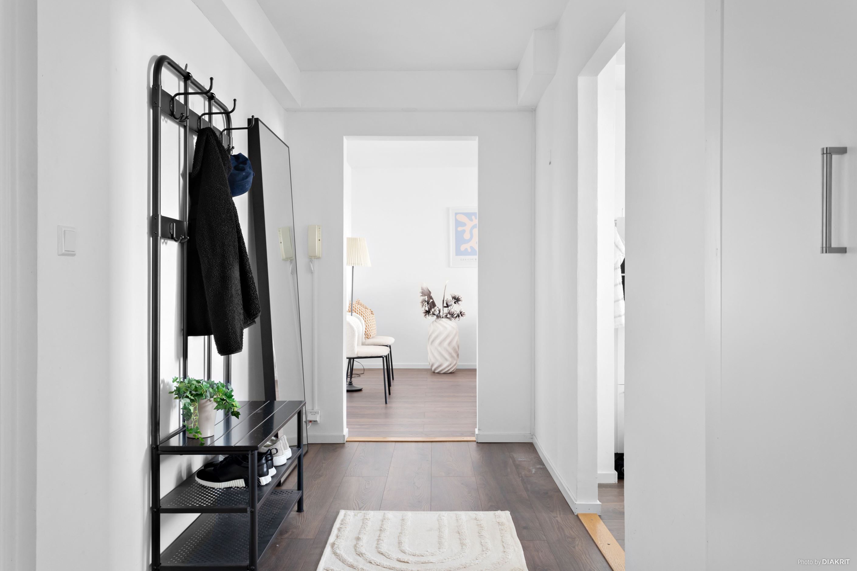 Redan i hallen möts du av ett ljust första intryck med goda avhängningsmöjligheter och plats för enklare förvaring. Den öppna siktlinjen vidare in i bostaden skapar ett fint flöde och förstärker den luftiga känslan.