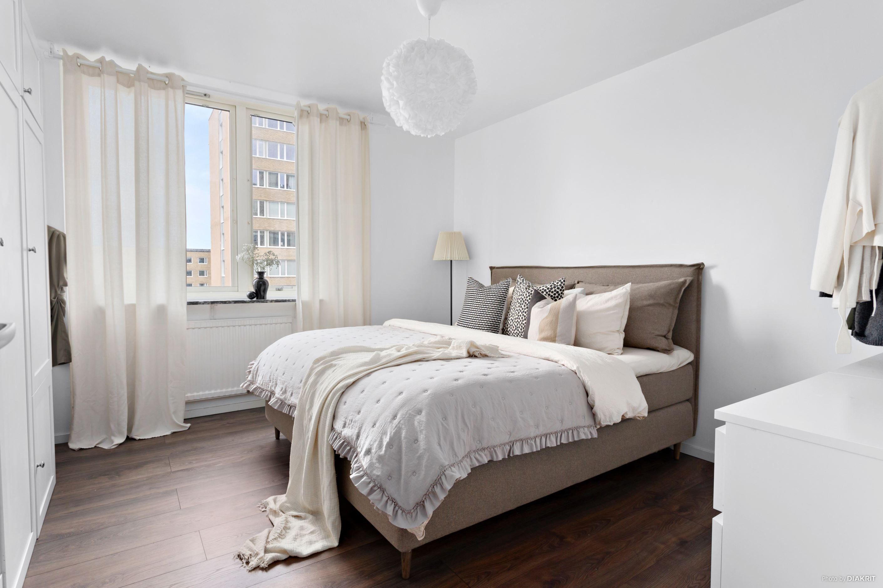 Sovrummet är rofyllt och välplanerat med plats för större säng och tillhörande möblemang. Det fina ljusinsläppet tillsammans med den lugna färgsättningen skapar en harmonisk miljö för vila och återhämtning.