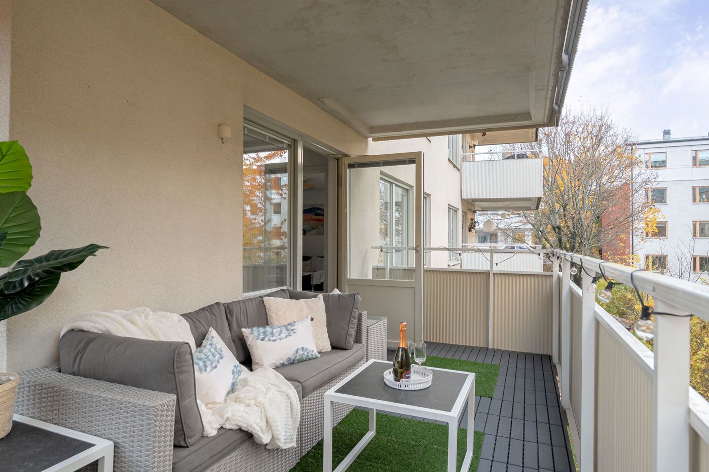 - Stor hörnbalkong i söderläge med sol från förmiddag till kväll mot innergård.