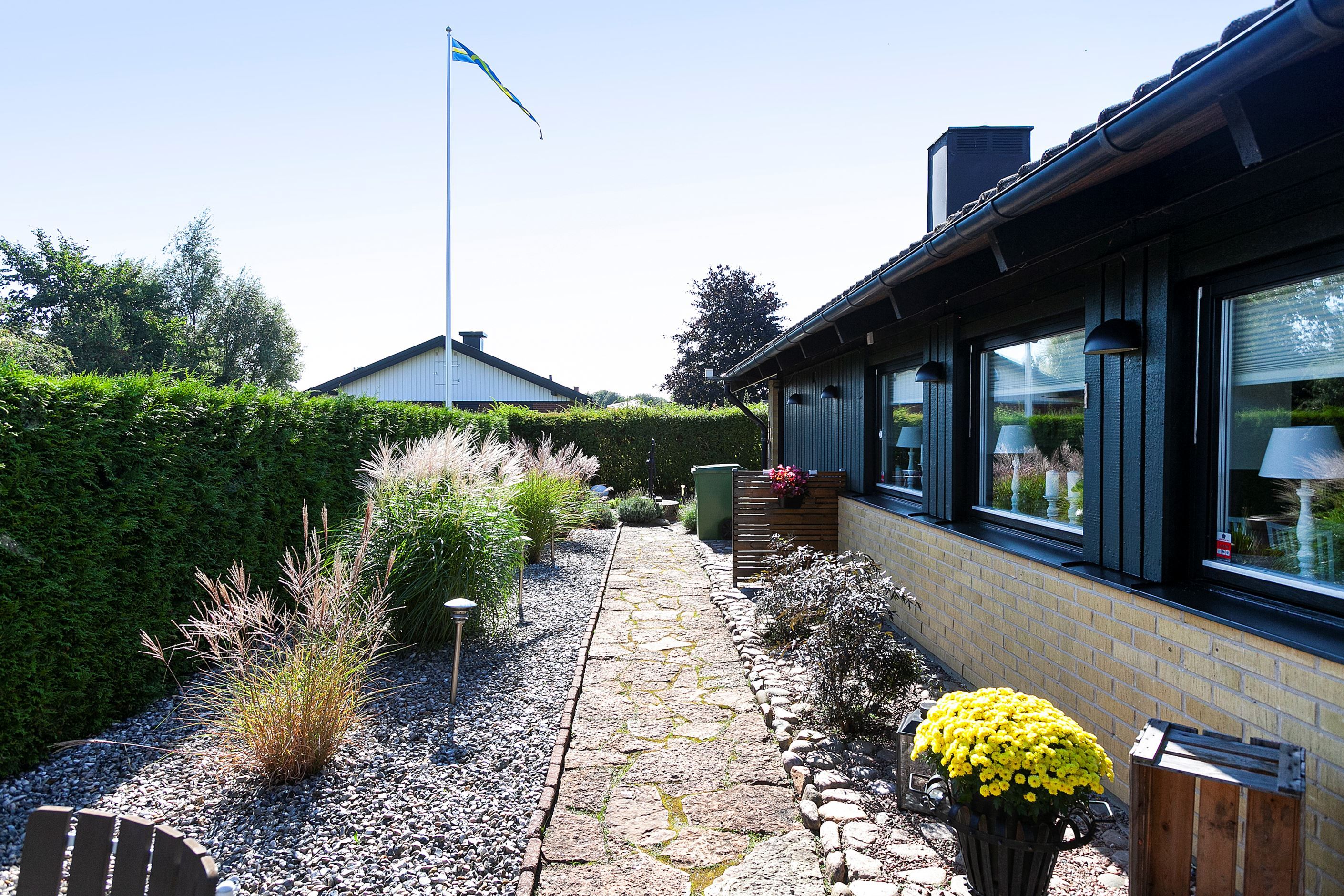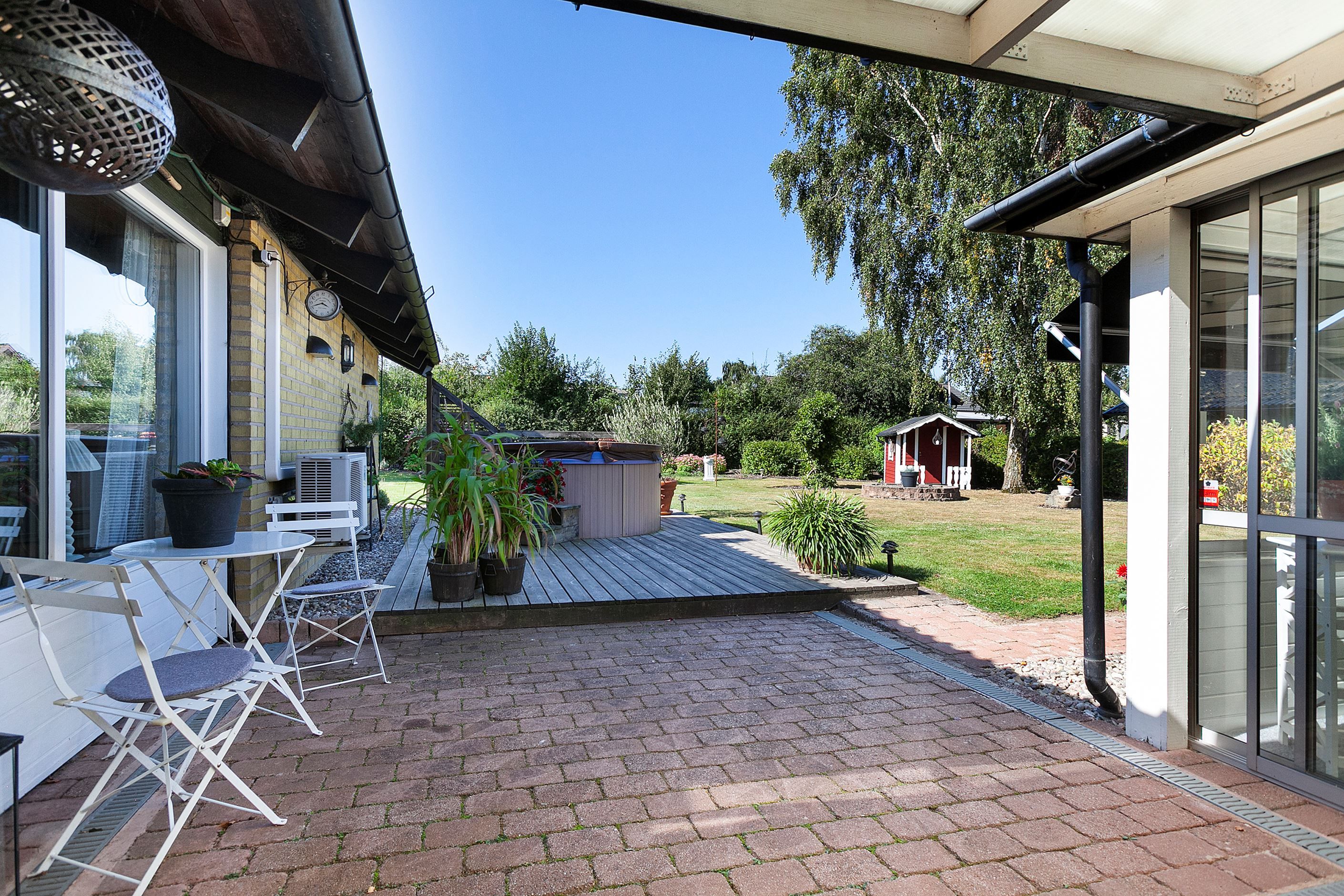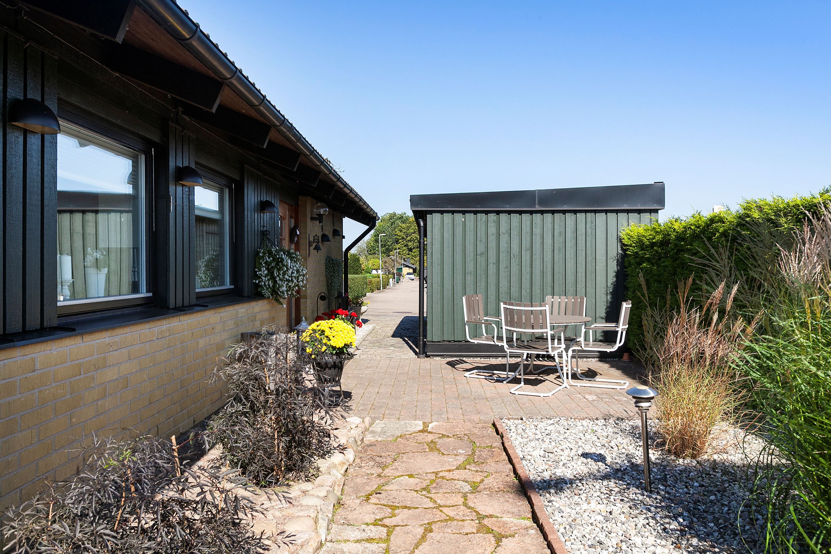 Trädgården är i exceptionellt skick och lämnar inget åt slumpen. Här möts vi av vackra blommor, välansad gräsmatta och mycket stenläggning för att hålla underhållet till ett minimum. Här finns ett mindre odlingsland, växthus och vedskjul.