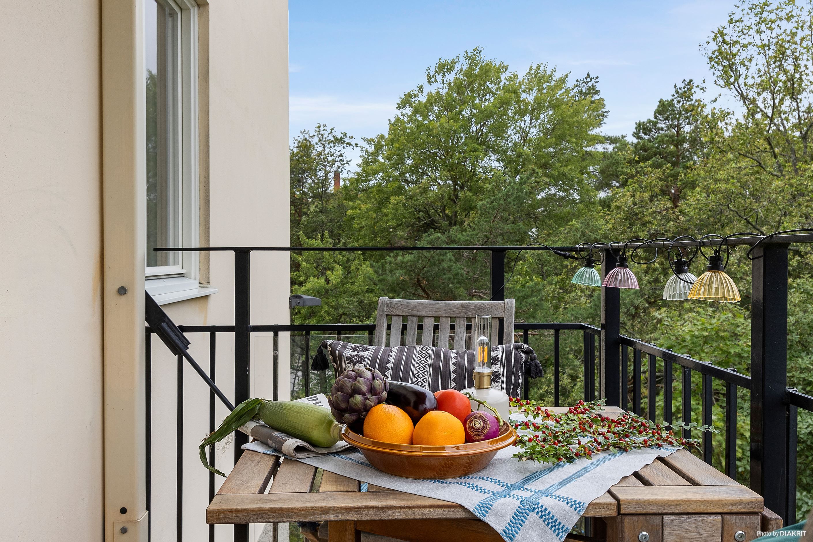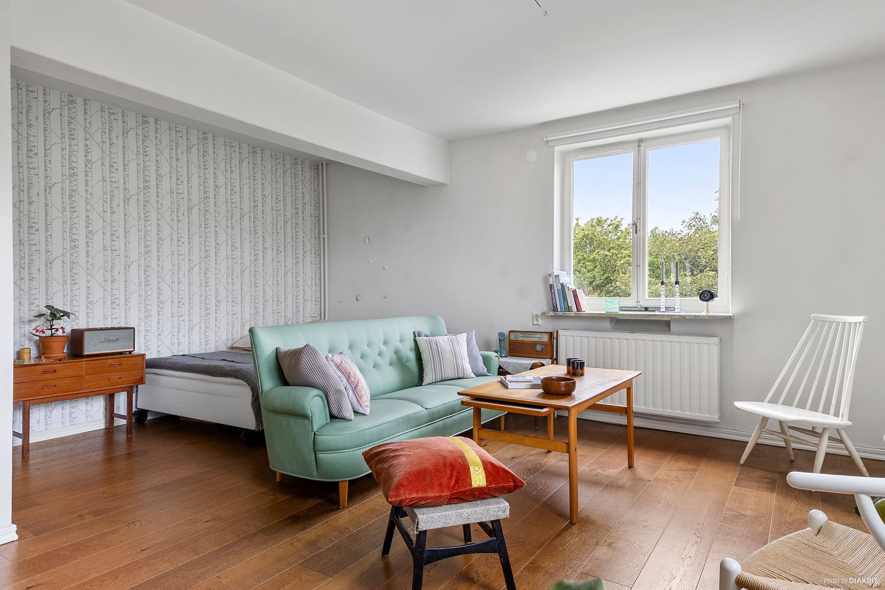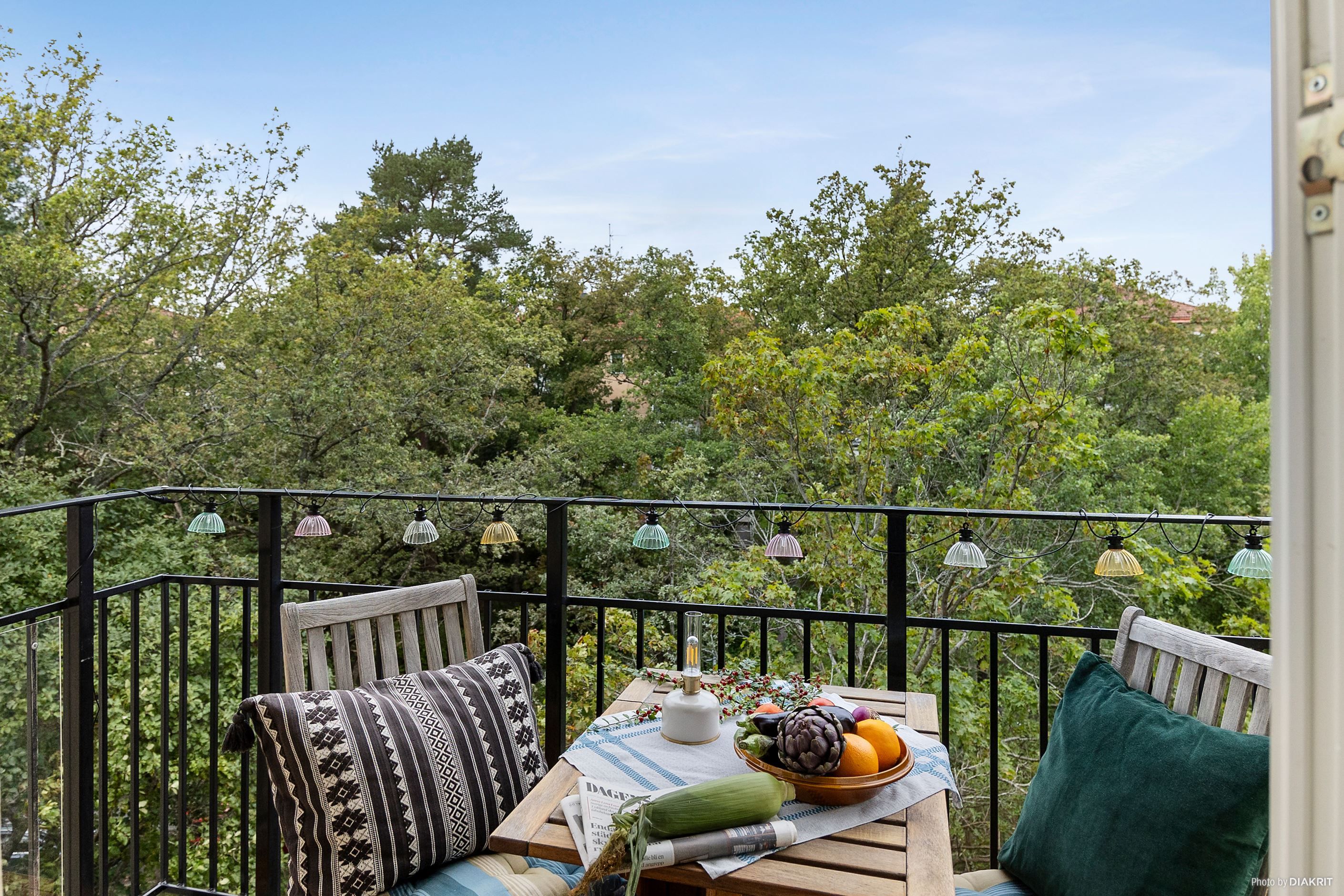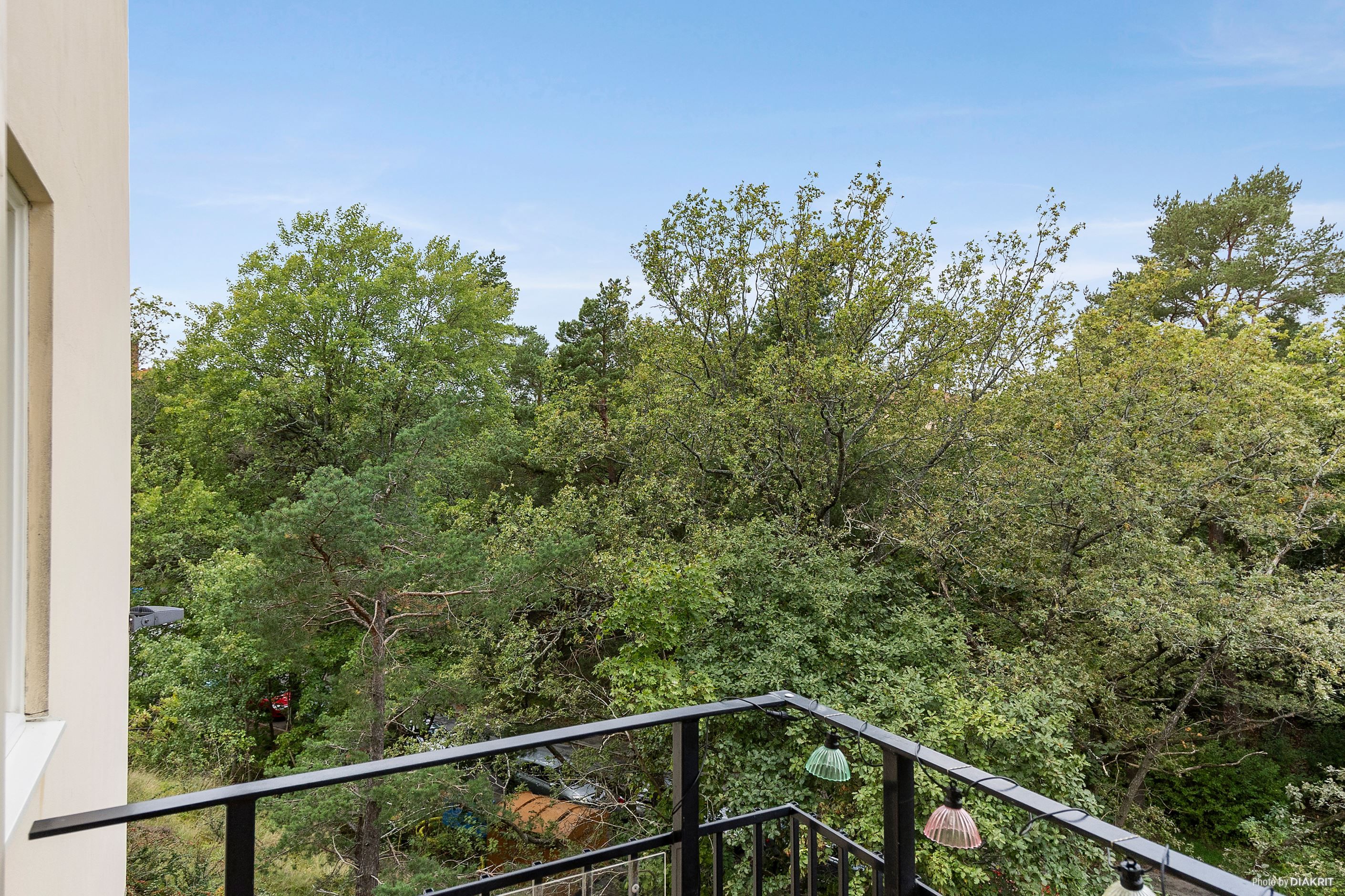 Fantastiskt välbelägen funkislägenhet med ett mysigt och ogenerat gavelläge intill grönska. Fastigheten är belägen på Aspuddens högsta punkt och från lägenheten har man fin utsikt mot Aspudden och staden. Lägenheten erbjuder en stor balkong i ett privat läge och med skön eftermiddags- och kvällssol. Intill skogspartiet utanför kan man ta del av ett sprudlande djurliv. Lägenheten är genomgående i gott skick, har en mycket trivsam planlösning samt mycket fint ljusinsläpp såväl på morgon som kväll. För den som önskar går det även att bygga om lägenheten till en 2:a, genom att öppna upp klädkammaren från hallen och bygga ett mindre sovrum i anslutning till ett av fönstren. Mycket välskött förening som äger marken och nyligen gjorde en större amortering på lånen samt diskuterar ytterligare amortering. Attraktivt läge i charmiga Aspudden med t-bana och bra service. Närhet även till såväl city som naturområden och Mälaren.