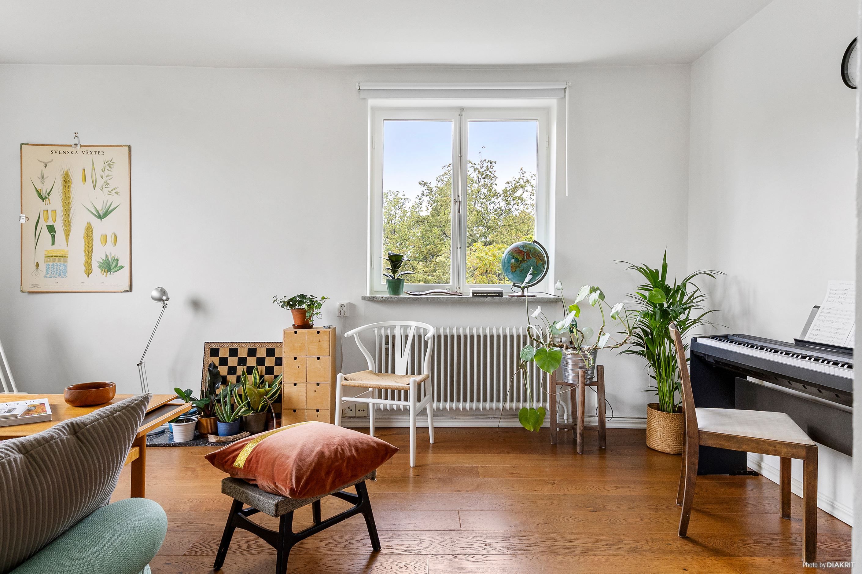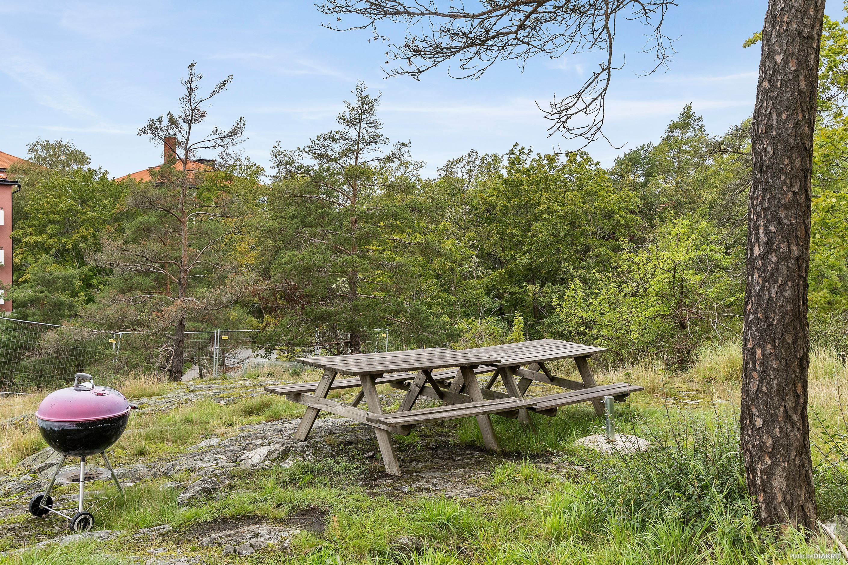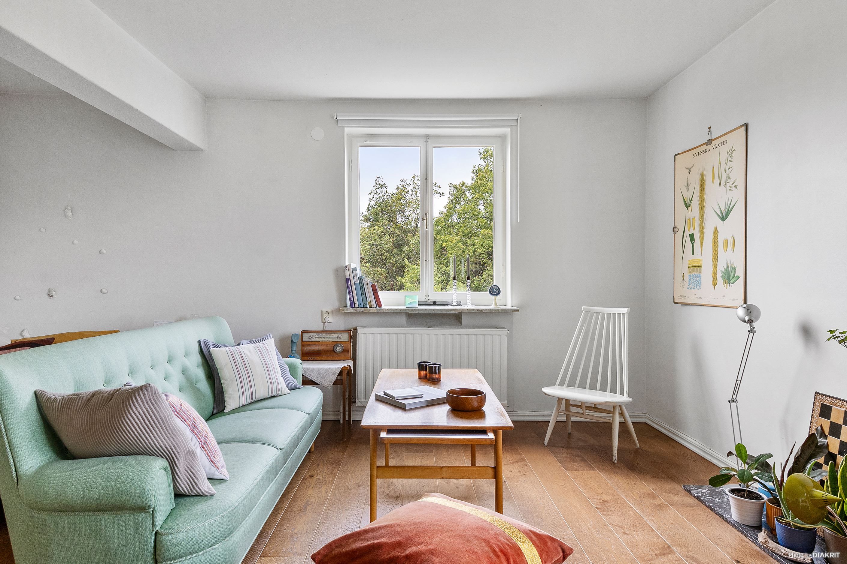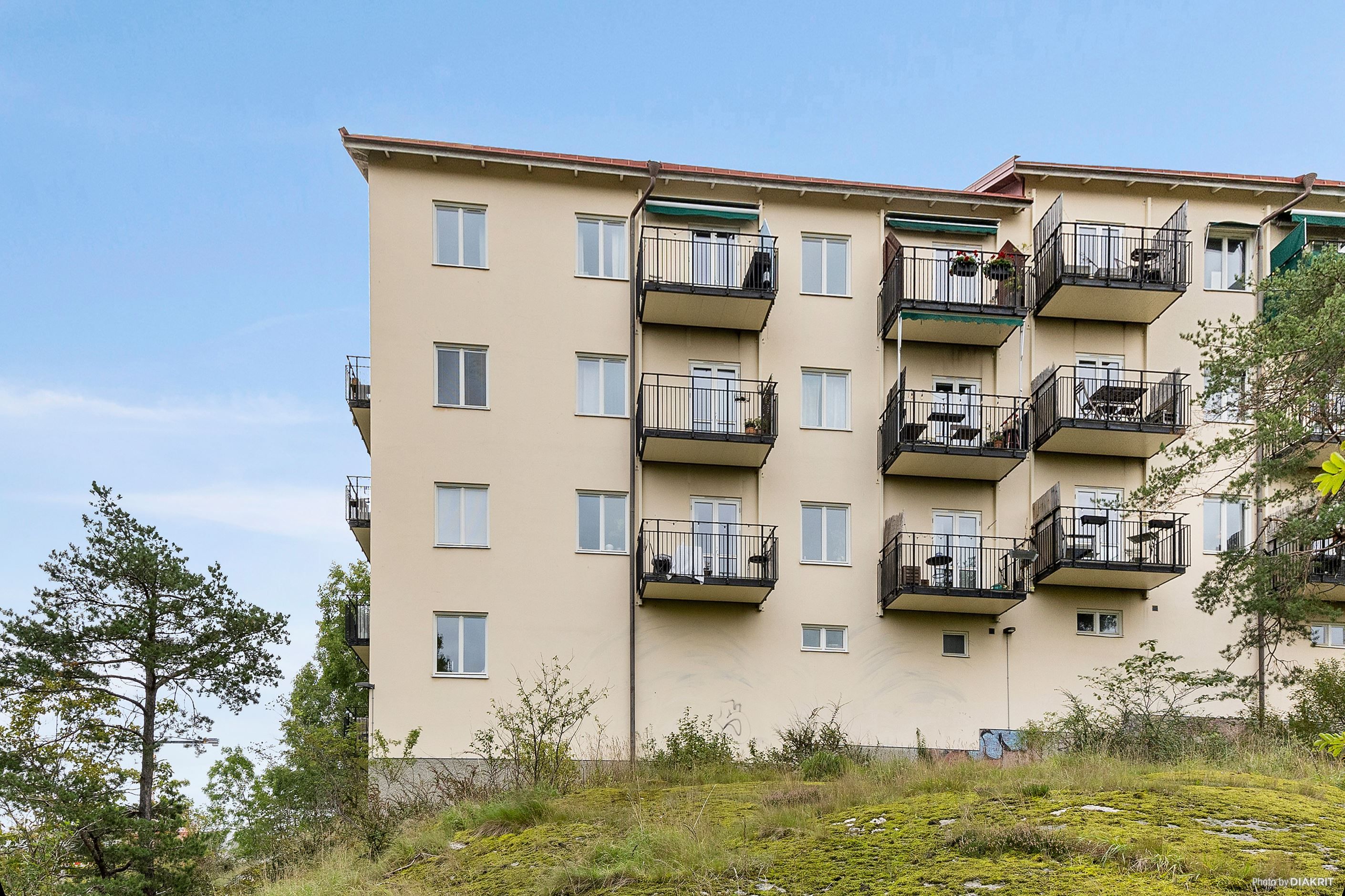 Fantastiskt välbelägen funkislägenhet med ett mysigt och ogenerat gavelläge intill grönska. Fastigheten är belägen på Aspuddens högsta punkt och från lägenheten har man fin utsikt mot Aspudden och staden. Lägenheten erbjuder en stor balkong i ett privat läge och med skön eftermiddags- och kvällssol. Intill skogspartiet utanför kan man ta del av ett sprudlande djurliv. Lägenheten är genomgående i gott skick, har en mycket trivsam planlösning samt mycket fint ljusinsläpp såväl på morgon som kväll. För den som önskar går det även att bygga om lägenheten till en 2:a, genom att öppna upp klädkammaren från hallen och bygga ett mindre sovrum i anslutning till ett av fönstren. Mycket välskött förening som äger marken och nyligen gjorde en större amortering på lånen samt diskuterar ytterligare amortering. Attraktivt läge i charmiga Aspudden med t-bana och bra service. Närhet även till såväl city som naturområden och Mälaren.