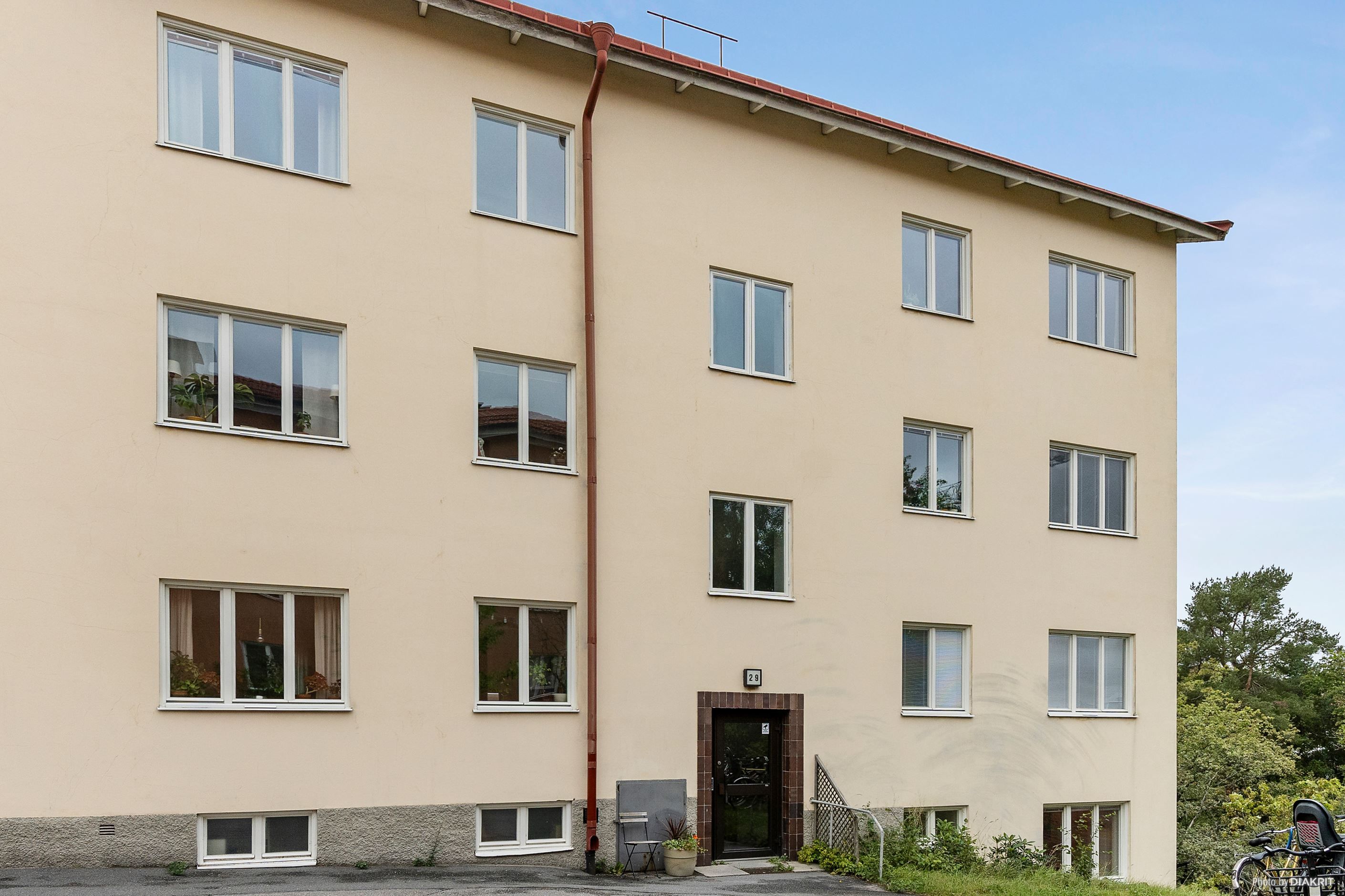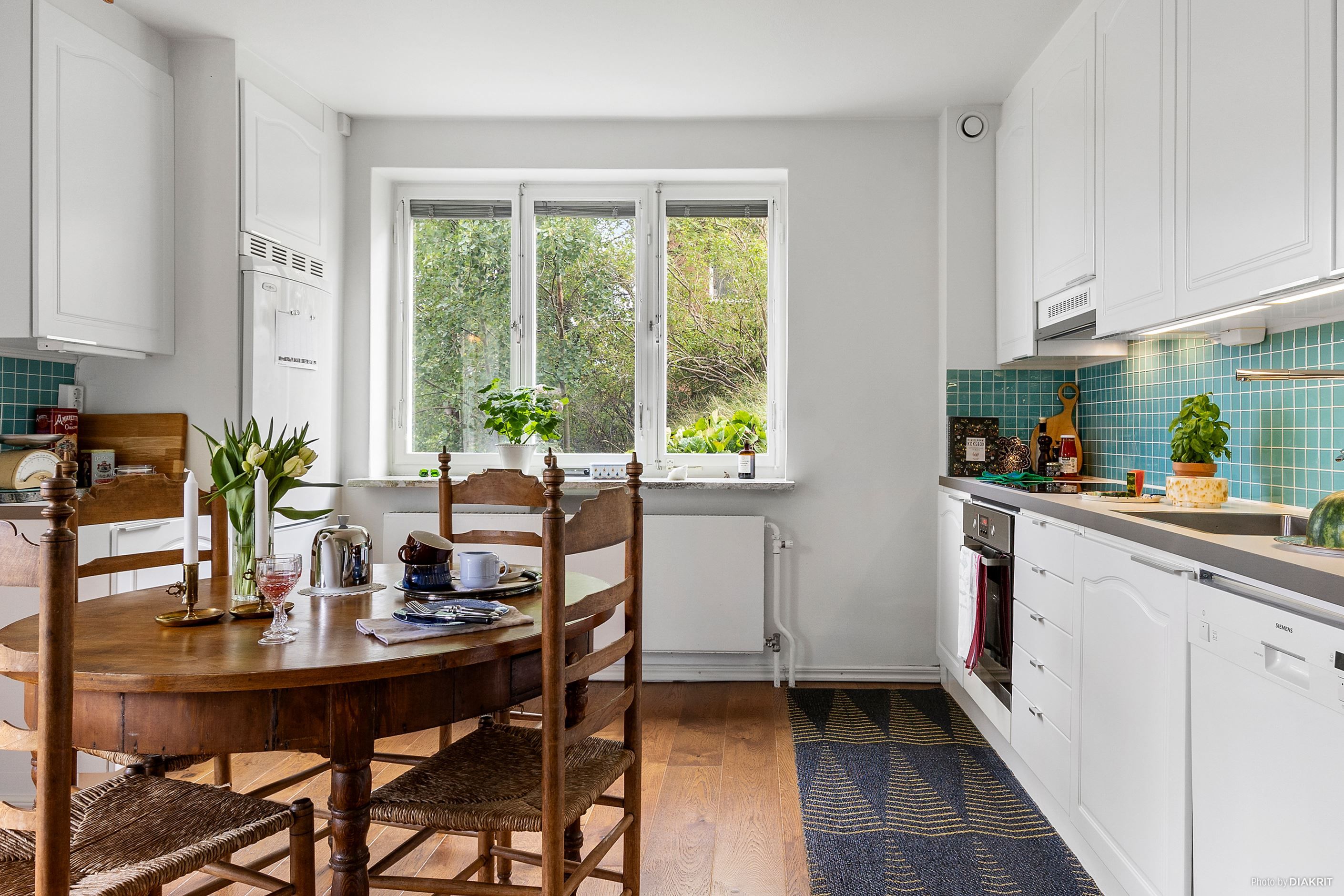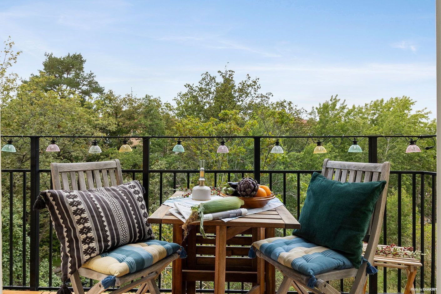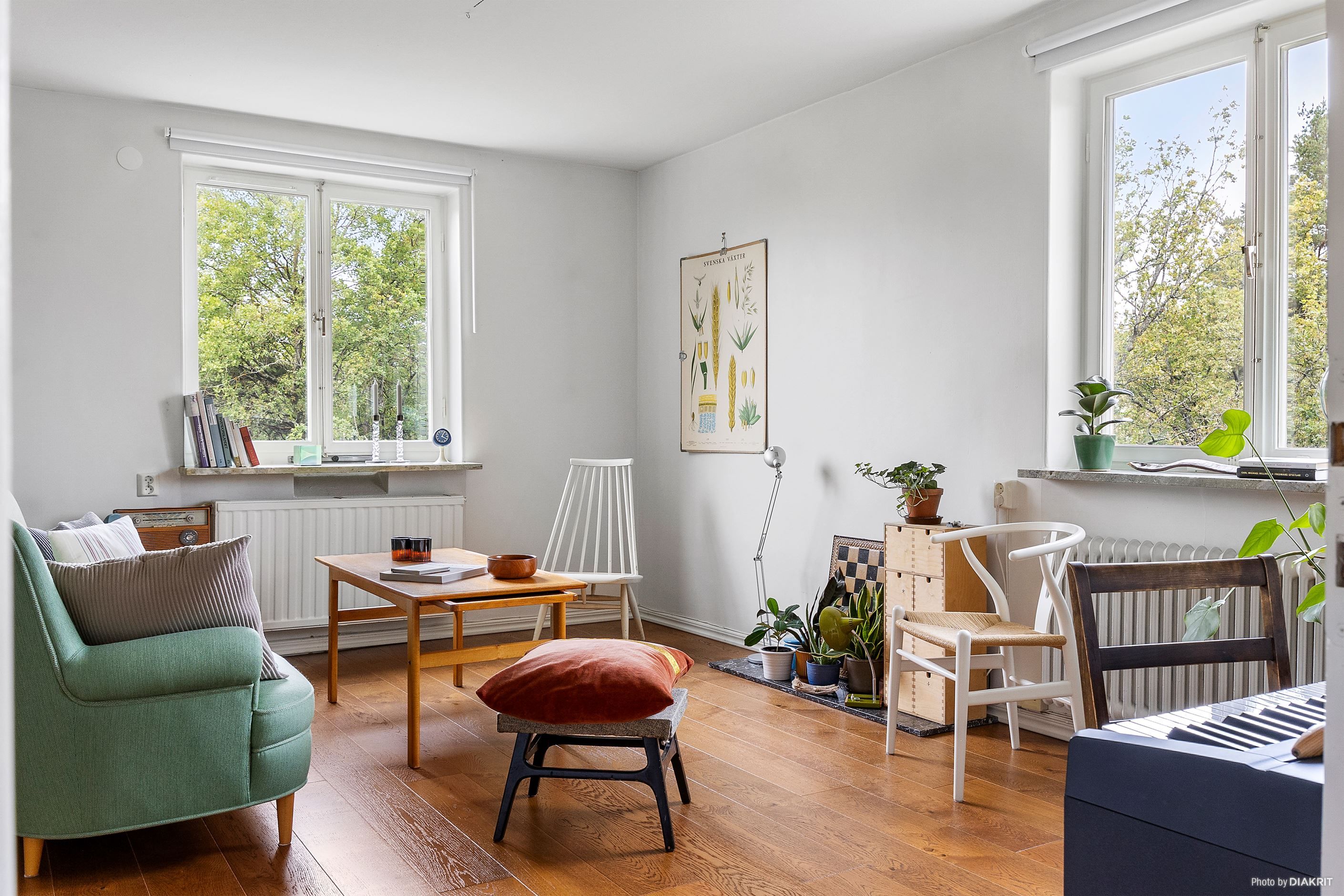 Fantastiskt välbelägen funkislägenhet med ett mysigt och ogenerat gavelläge intill grönska. Fastigheten är belägen på Aspuddens högsta punkt och från lägenheten har man fin utsikt mot Aspudden och staden. Lägenheten erbjuder en stor balkong i ett privat läge och med skön eftermiddags- och kvällssol. Intill skogspartiet utanför kan man ta del av ett sprudlande djurliv. Lägenheten är genomgående i gott skick, har en mycket trivsam planlösning samt mycket fint ljusinsläpp såväl på morgon som kväll. För den som önskar går det även att bygga om lägenheten till en 2:a, genom att öppna upp klädkammaren från hallen och bygga ett mindre sovrum i anslutning till ett av fönstren. Mycket välskött förening som äger marken och nyligen gjorde en större amortering på lånen samt diskuterar ytterligare amortering. Attraktivt läge i charmiga Aspudden med t-bana och bra service. Närhet även till såväl city som naturområden och Mälaren.