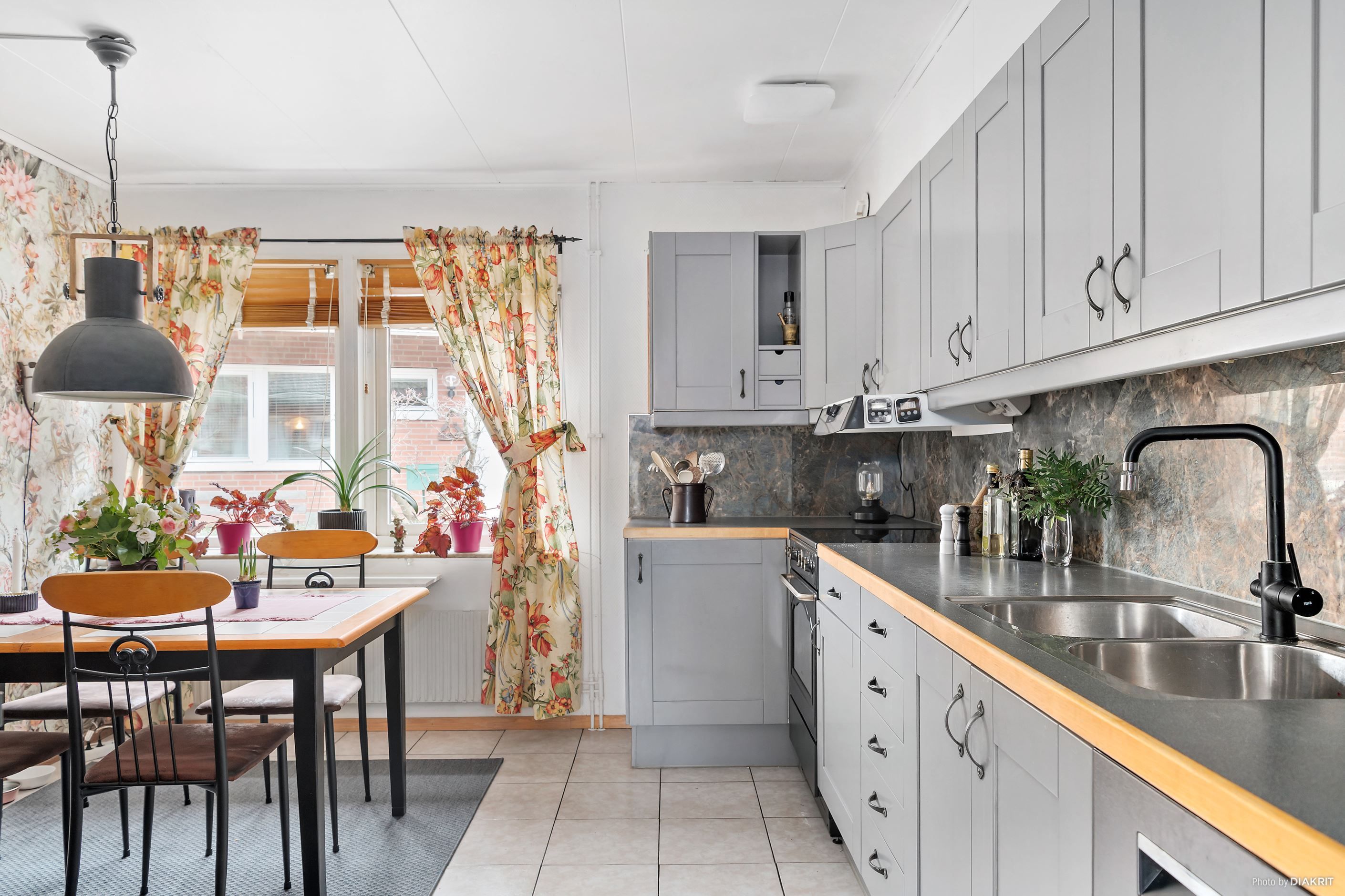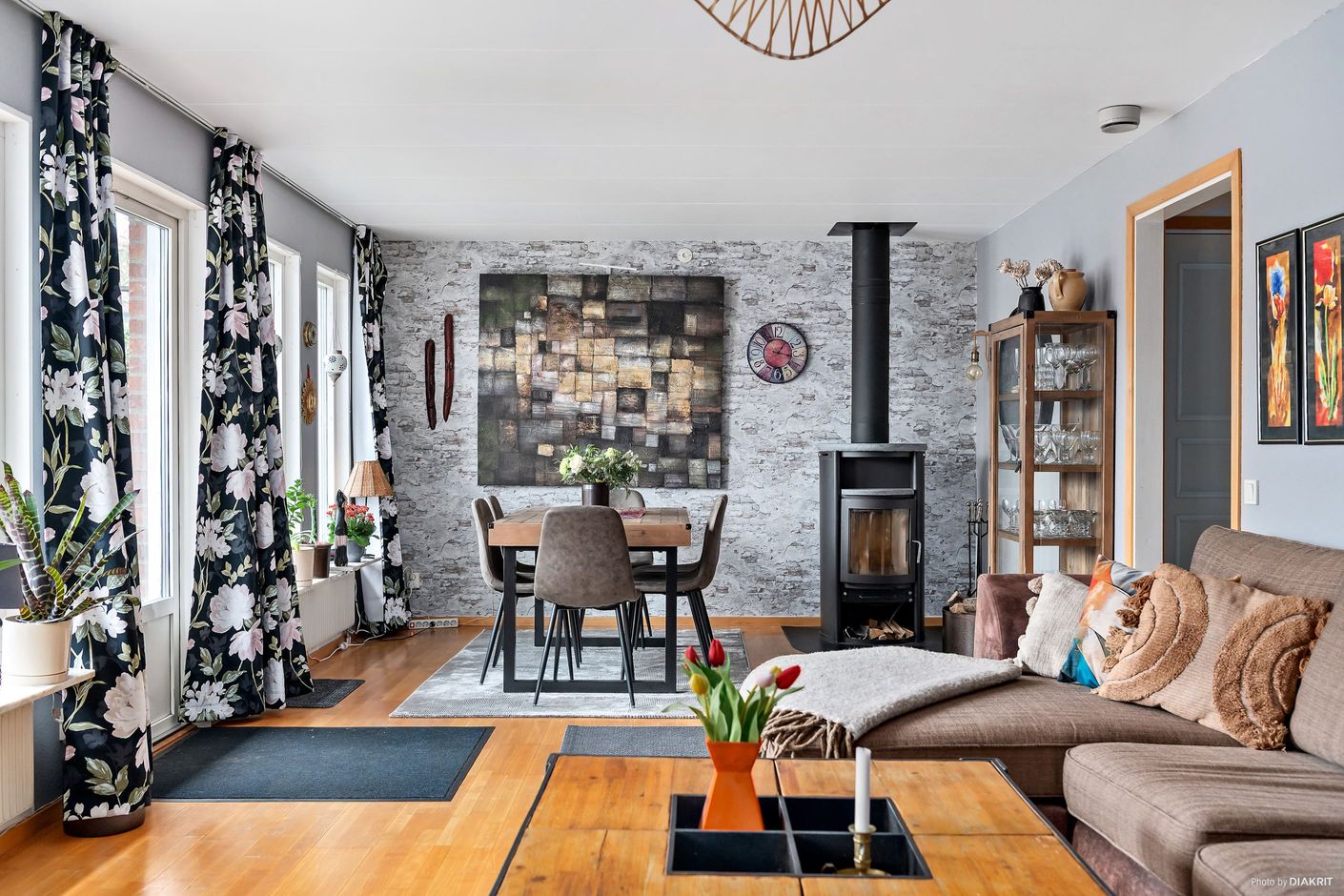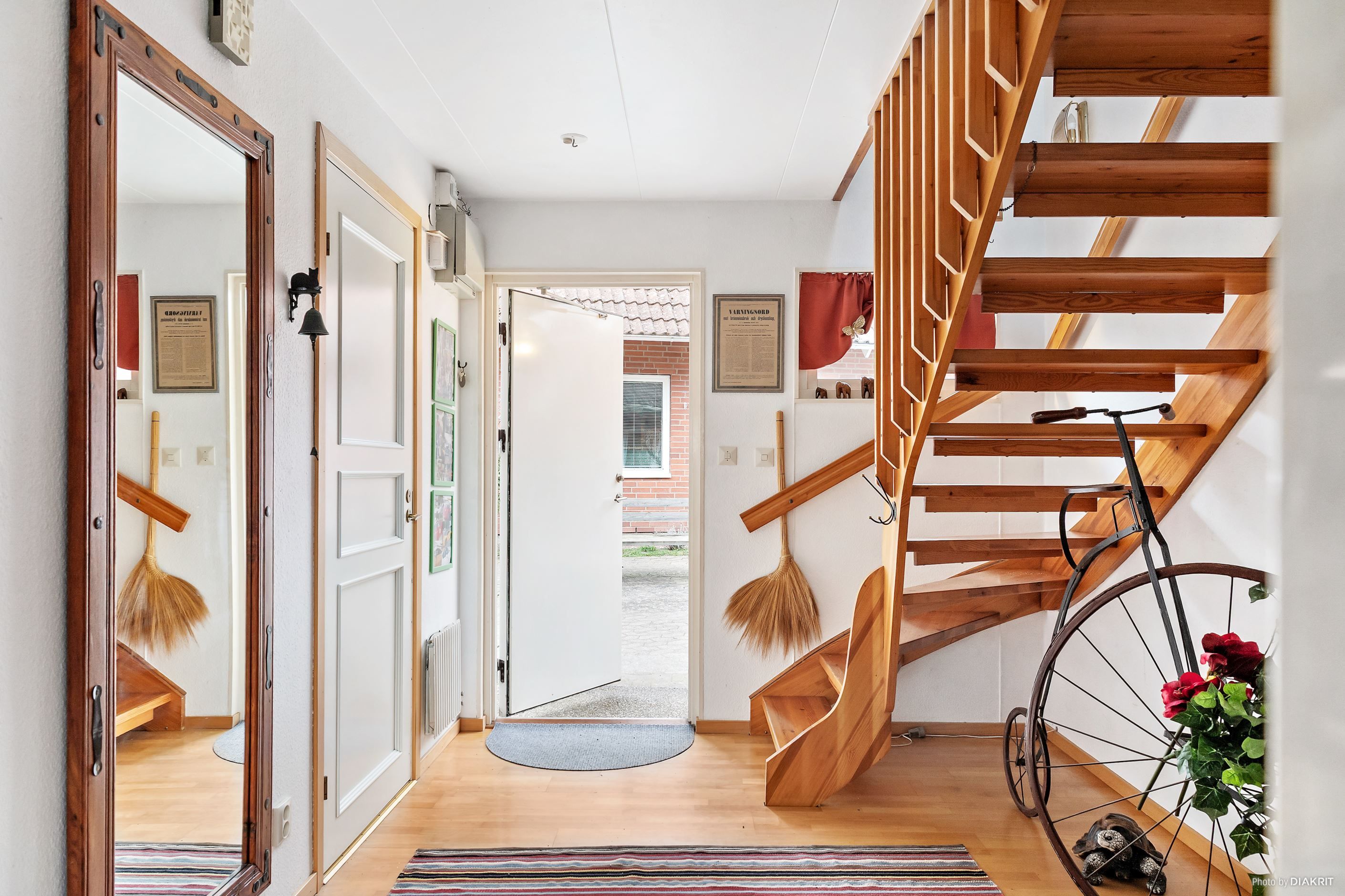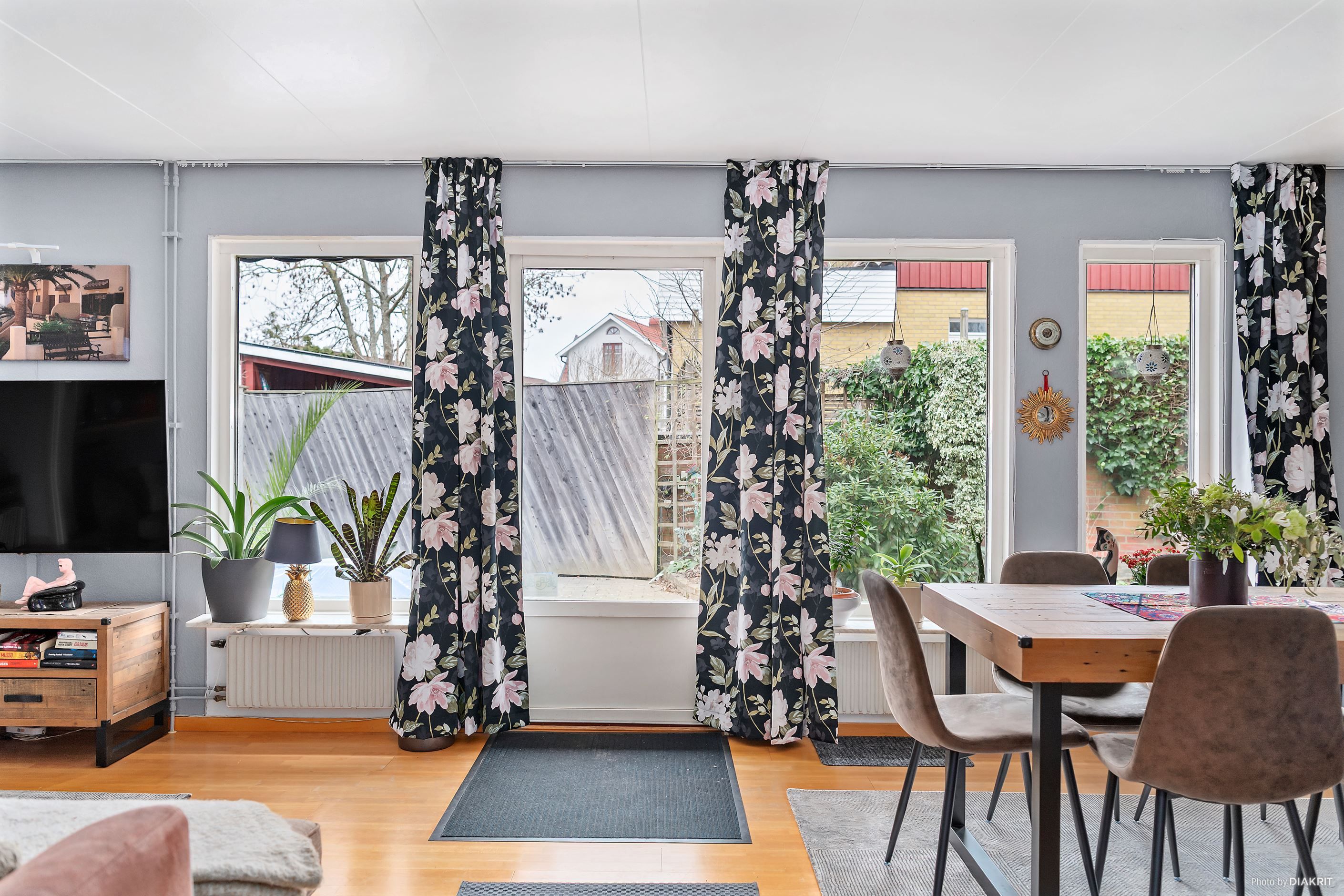 Bostaden disponeras genom en välkomnande hall med helkaklat badrum och tvättstuga. Till väster finner vi ett rymlig kök med matplats, där samtliga vitvaror byttes ut 2023. Vardagsrummet ger plats åt ytterligare matplats och soffgrupp med härligt ljusinsläpp från fönster mot den insynsskyddade trädgården.