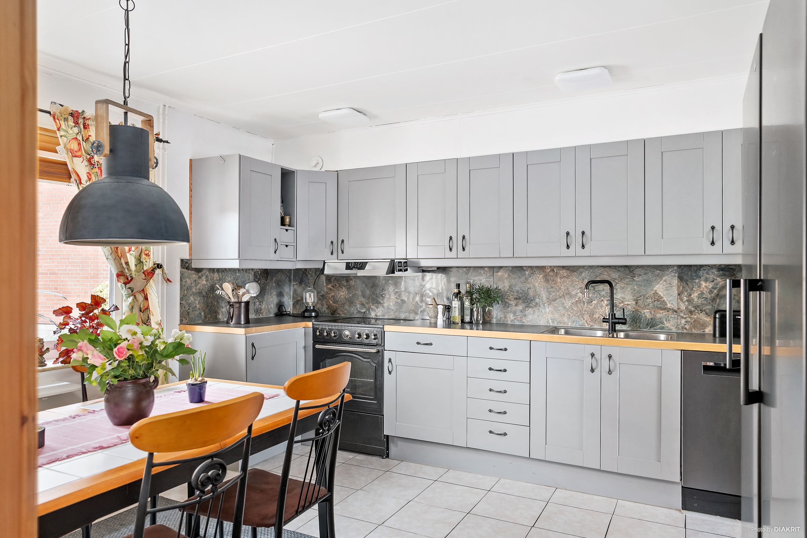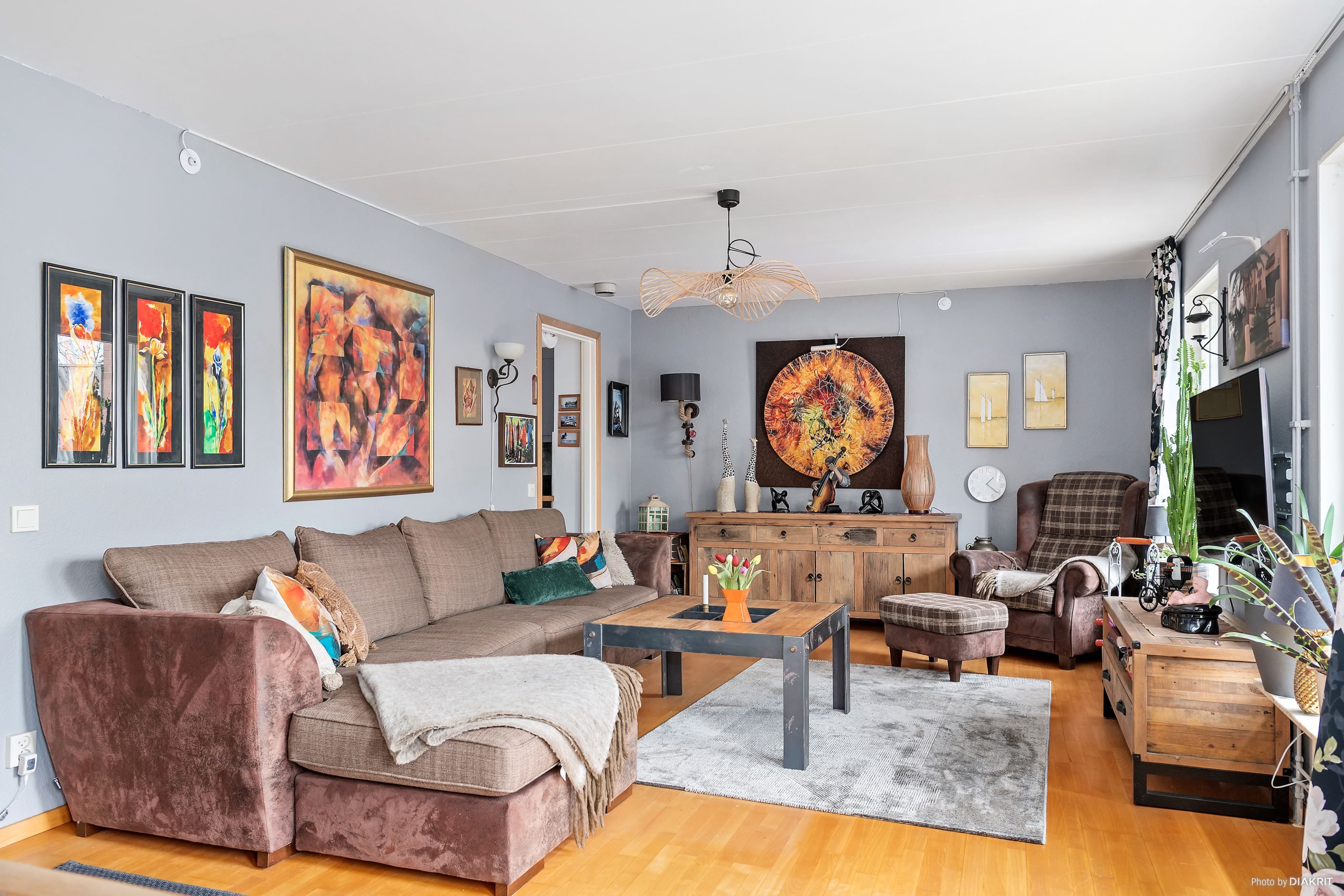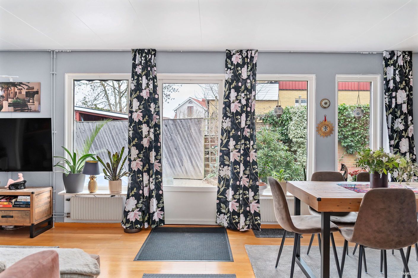 Bostaden disponeras genom en välkomnande hall med helkaklat badrum och tvättstuga. Till väster finner vi ett rymlig kök med matplats, där samtliga vitvaror byttes ut 2023. Vardagsrummet ger plats åt ytterligare matplats och soffgrupp med härligt ljusinsläpp från fönster mot den insynsskyddade trädgården.