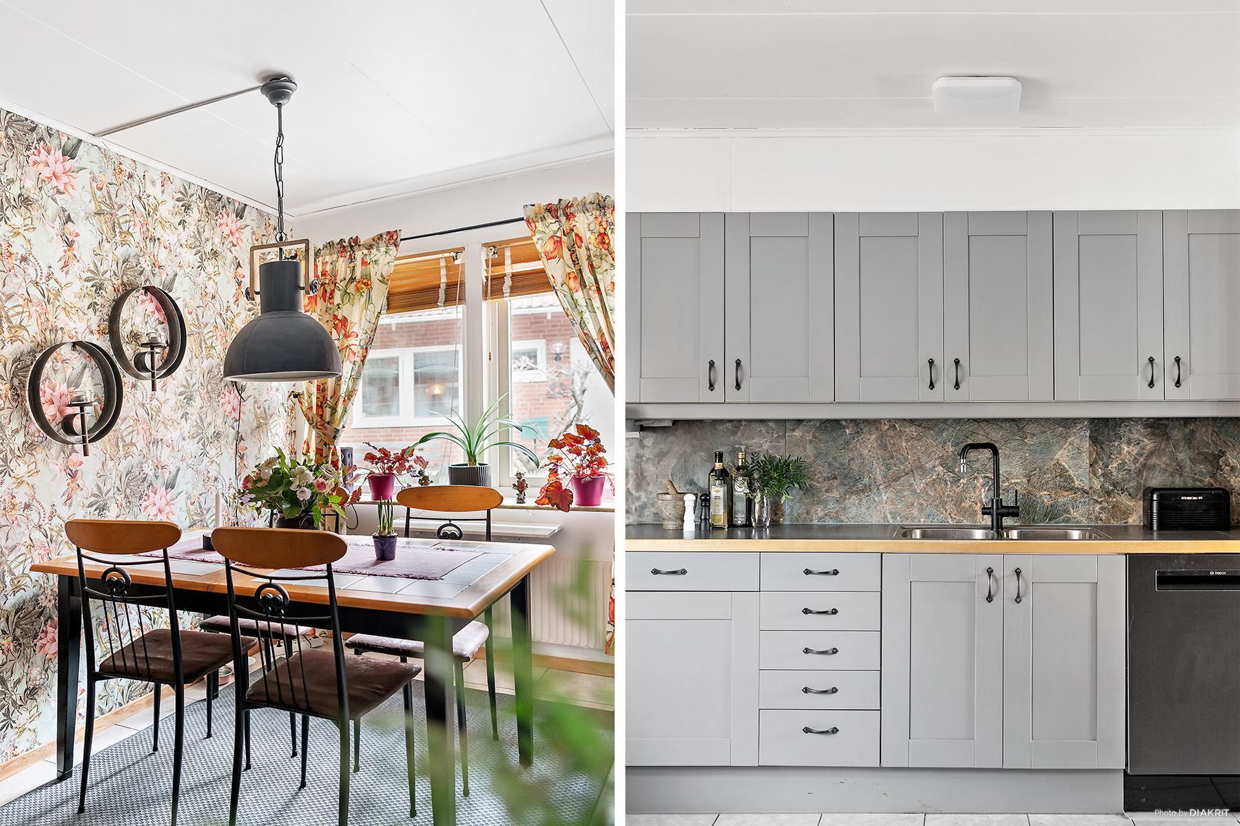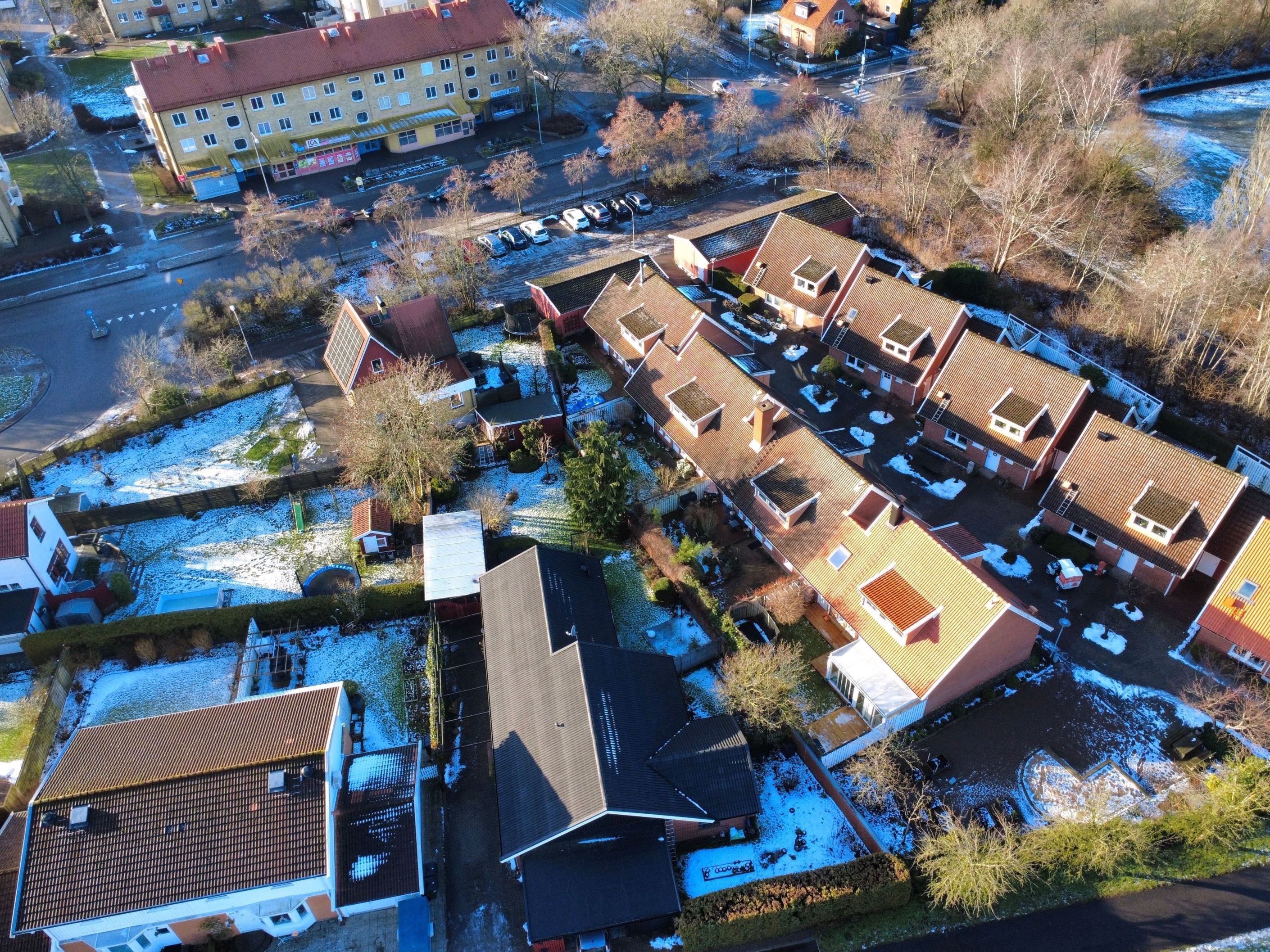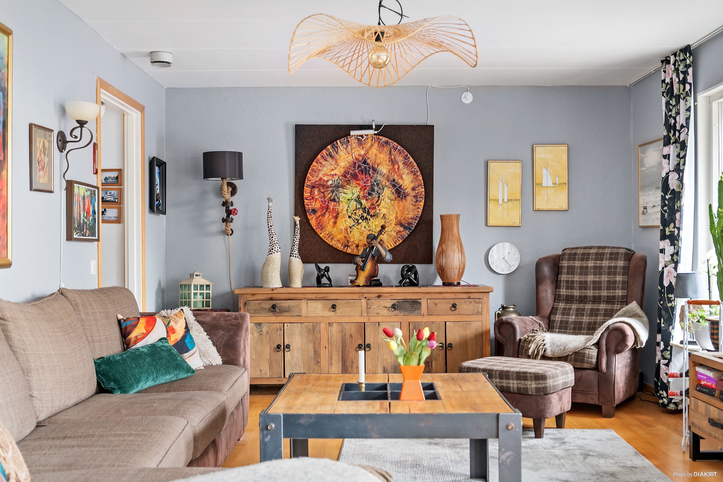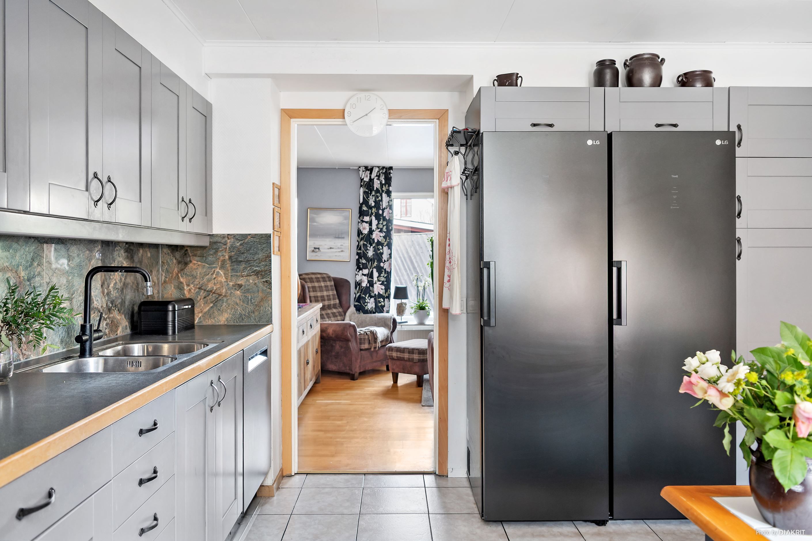 Bostaden disponeras genom en välkomnande hall med helkaklat badrum och tvättstuga. Till väster finner vi ett rymlig kök med matplats, där samtliga vitvaror byttes ut 2023. Vardagsrummet ger plats åt ytterligare matplats och soffgrupp med härligt ljusinsläpp från fönster mot den insynsskyddade trädgården.