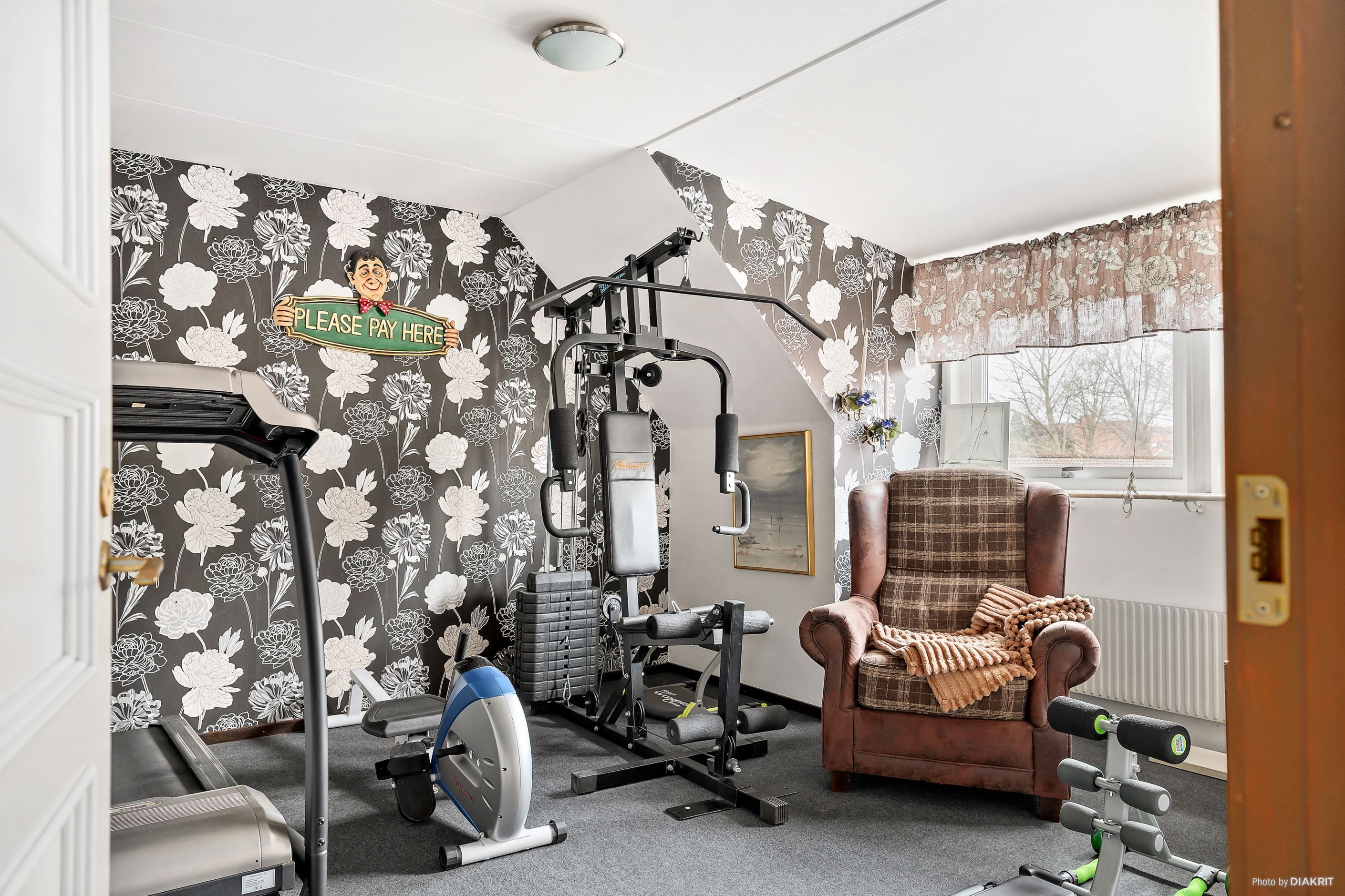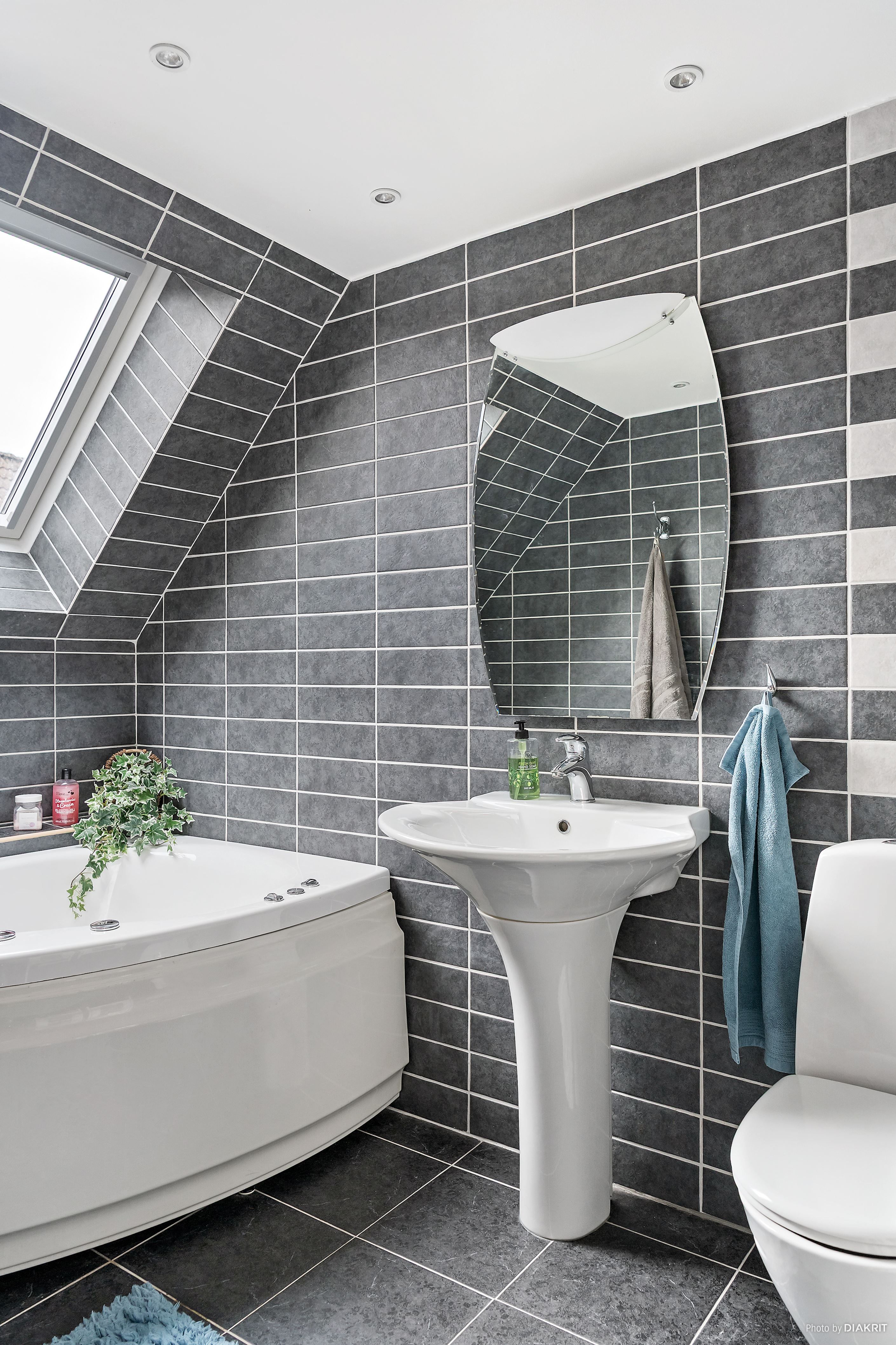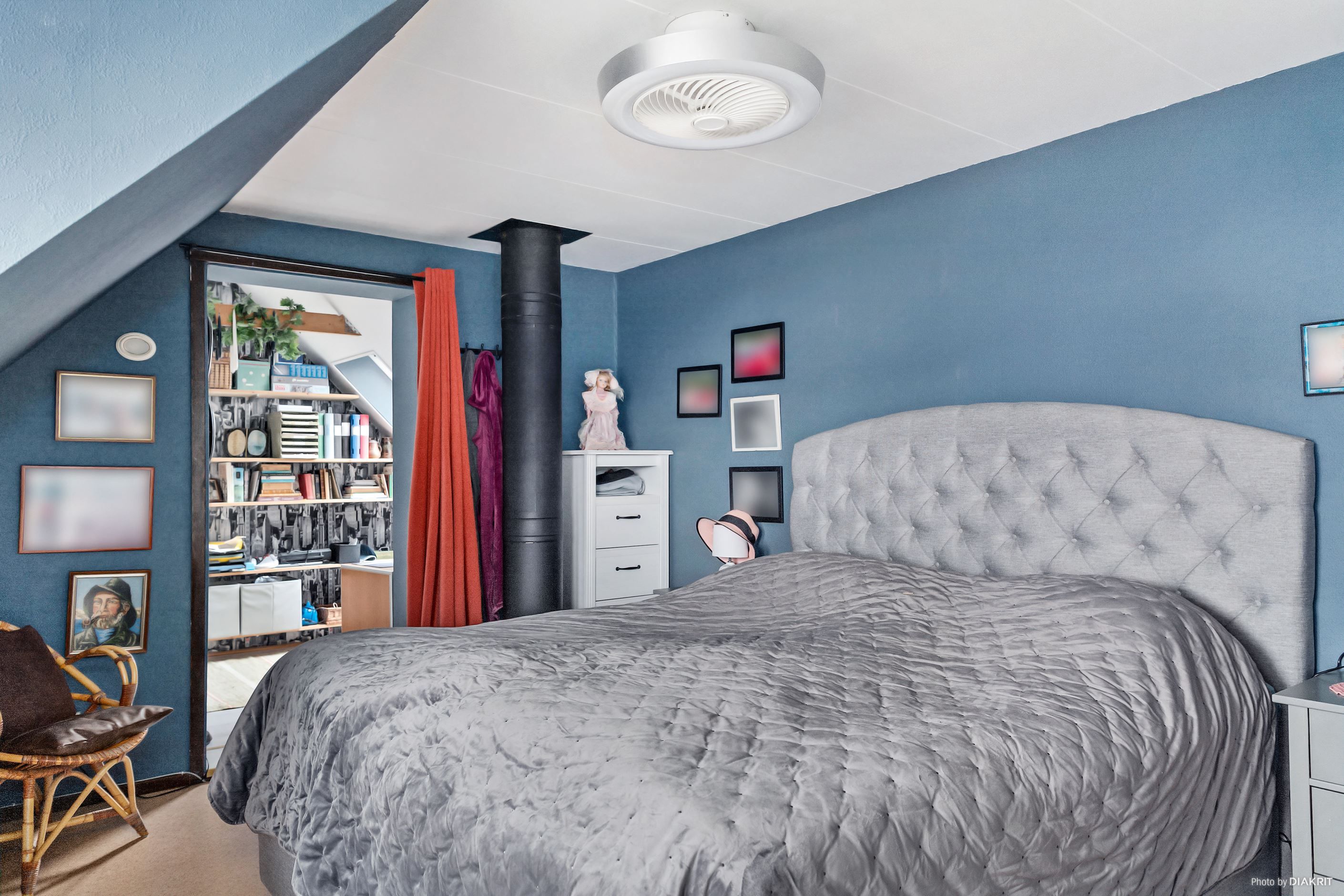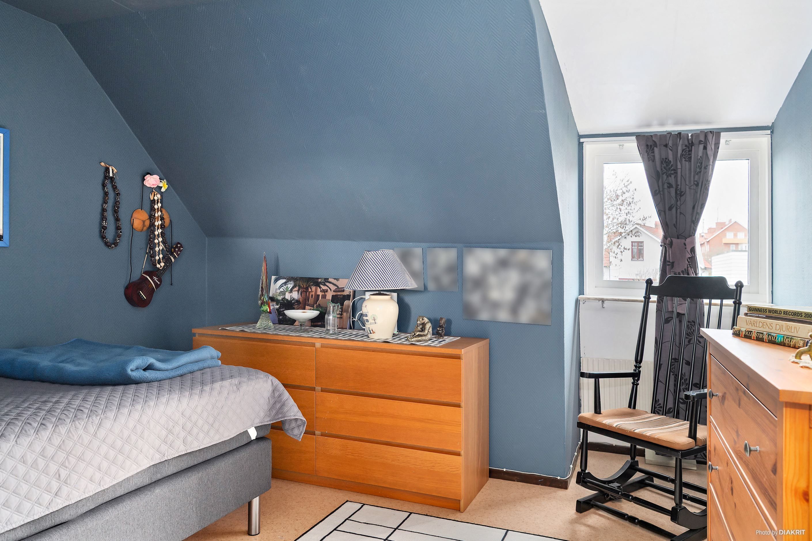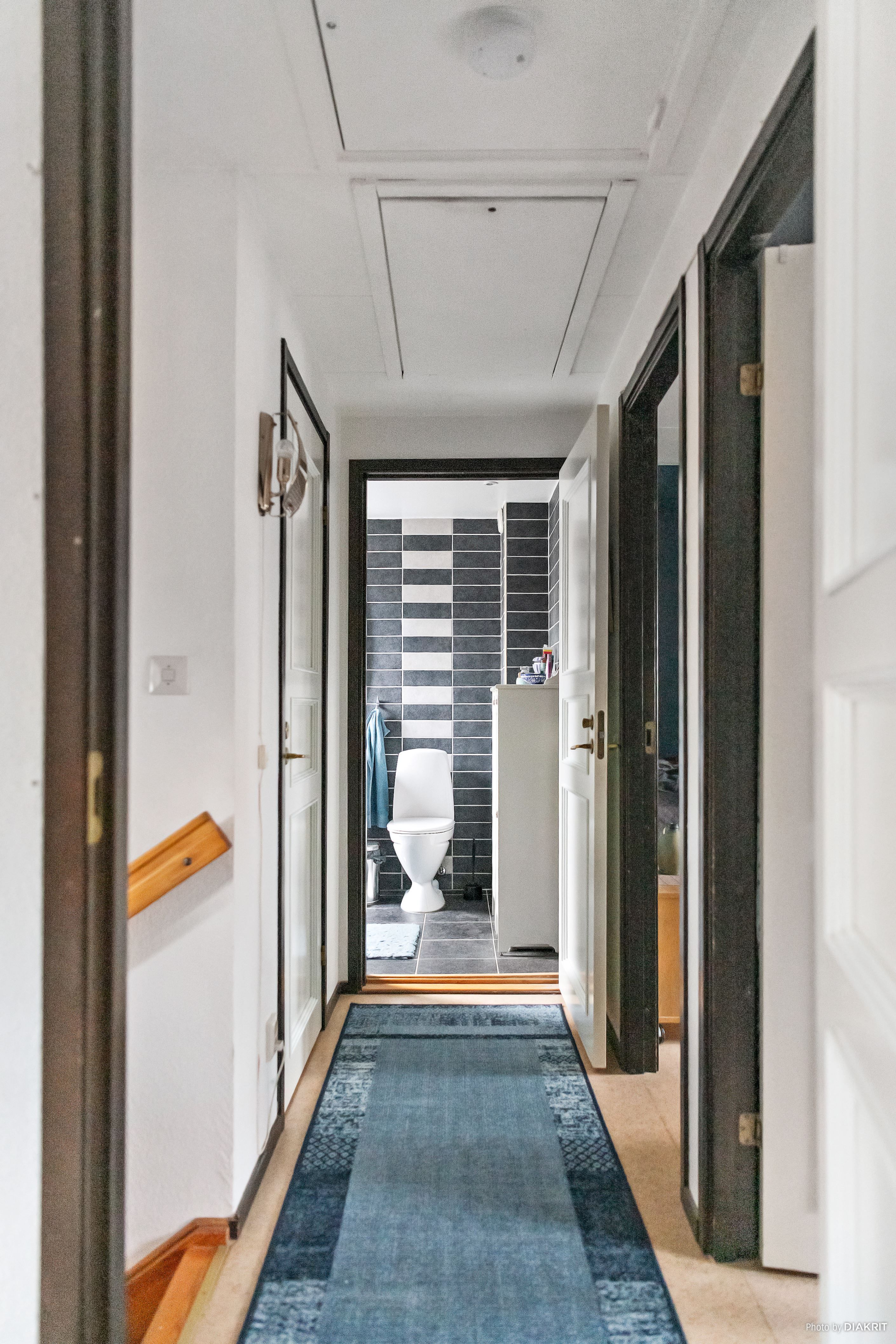 Trappan i hallen leder oss till det övre planet där det idag finns 3 rymliga sovrum samt ytterligare ett rum som är utbyggt på förrådsdelen. Denna yta är perfekt som barnkammare, walk-in closet eller hemmakontor. Från hallen når vi även en klädkammare samt ytterligare ett helkaklat badrum som dessutom byggdes ut för att göras rymliga vid senaste renoveringen.