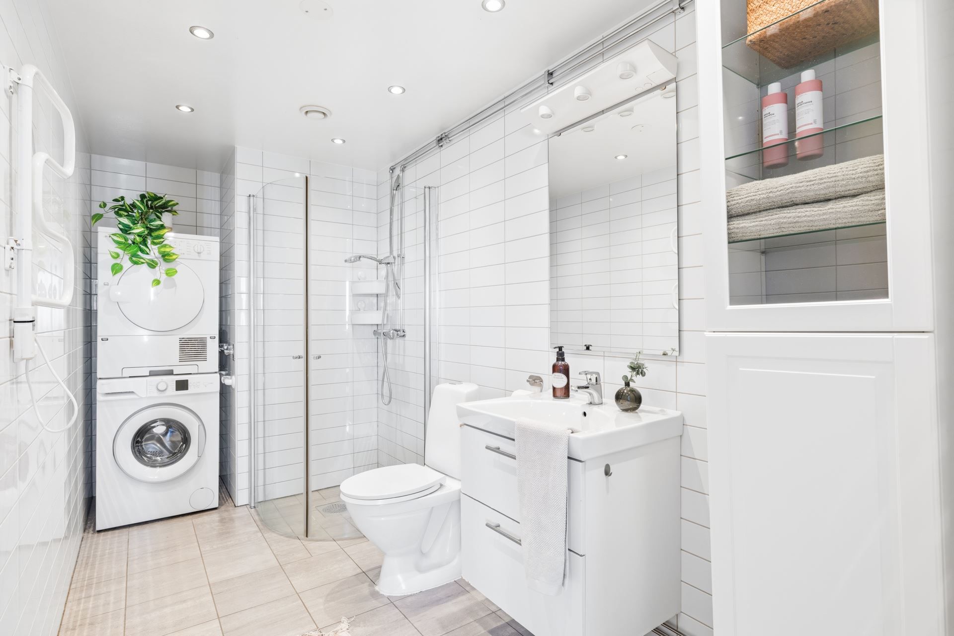 Badrummet är stort och helkaklat med klinkergolv samt utrustat med tvättmöjligheter – en bekväm lösning som gör vardagen smidig.