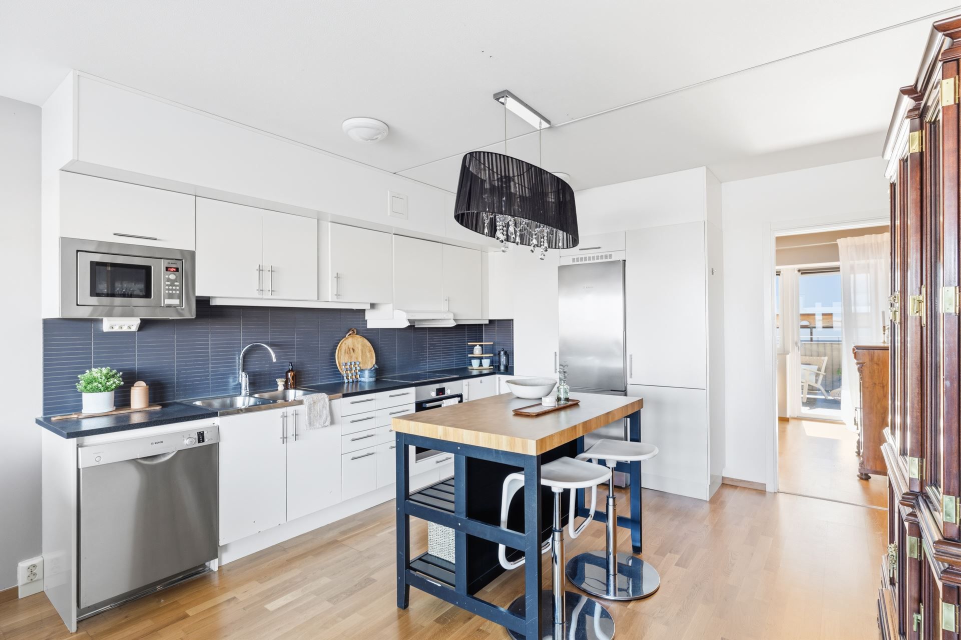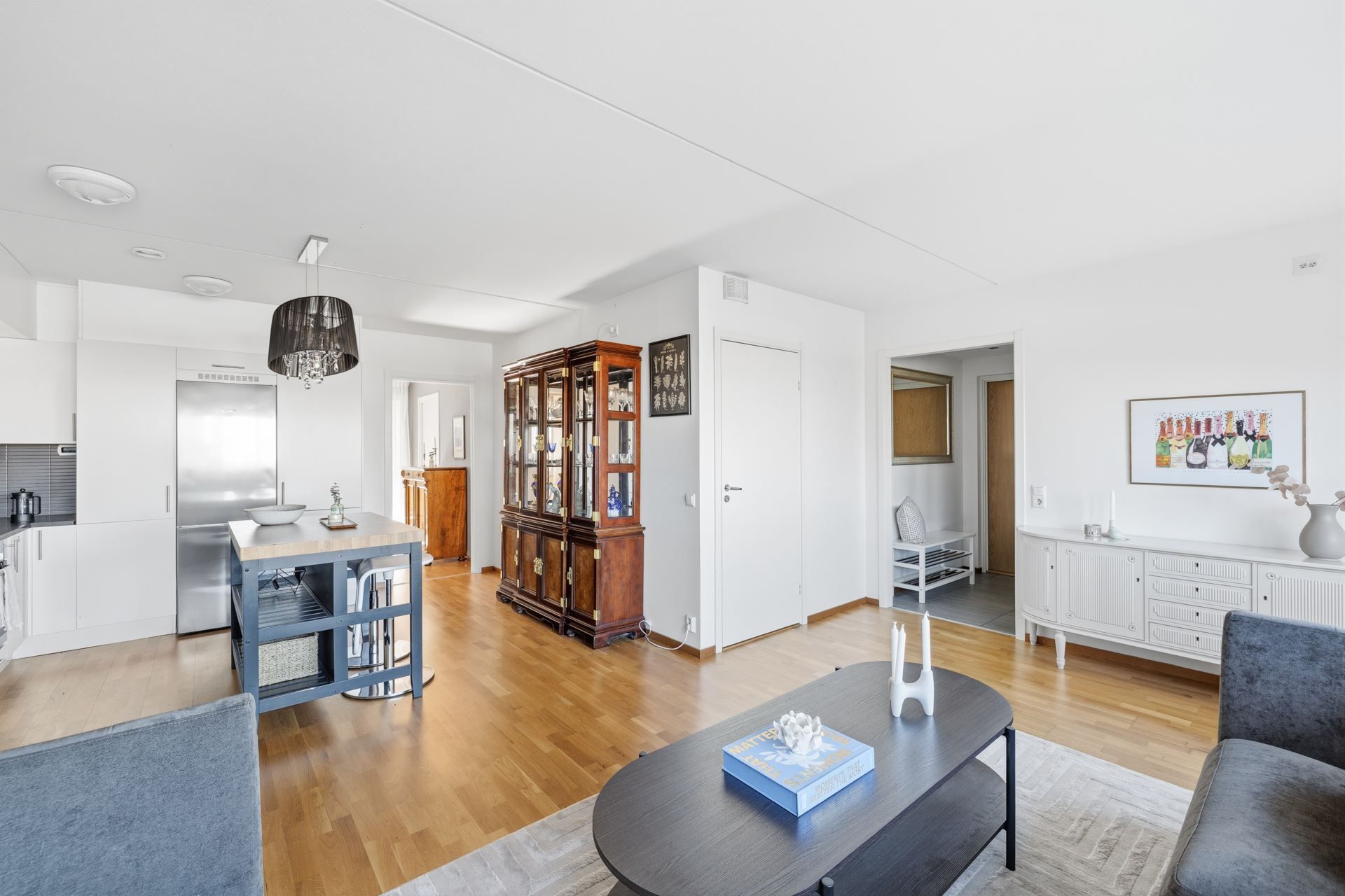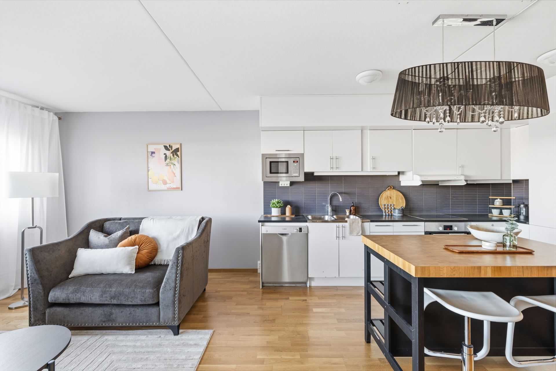 Köket håller modern standard med bra arbetsytor och praktiska lösningar. Vardagsrummet erbjuder stora ytor för umgänge och avkoppling.