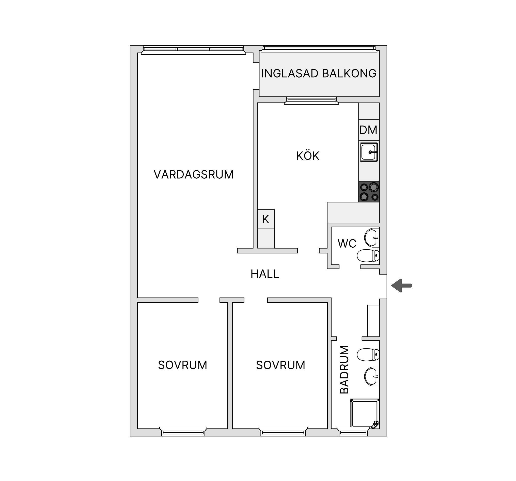 Lägenheten erbjuder två generösa sovrum med bra förvaringsmöjligheter och flexibel möblering. Dessutom finns ett hel kaklat badrum med duschkabin samt en separat gäst-WC en bekväm lösning i vardagen.