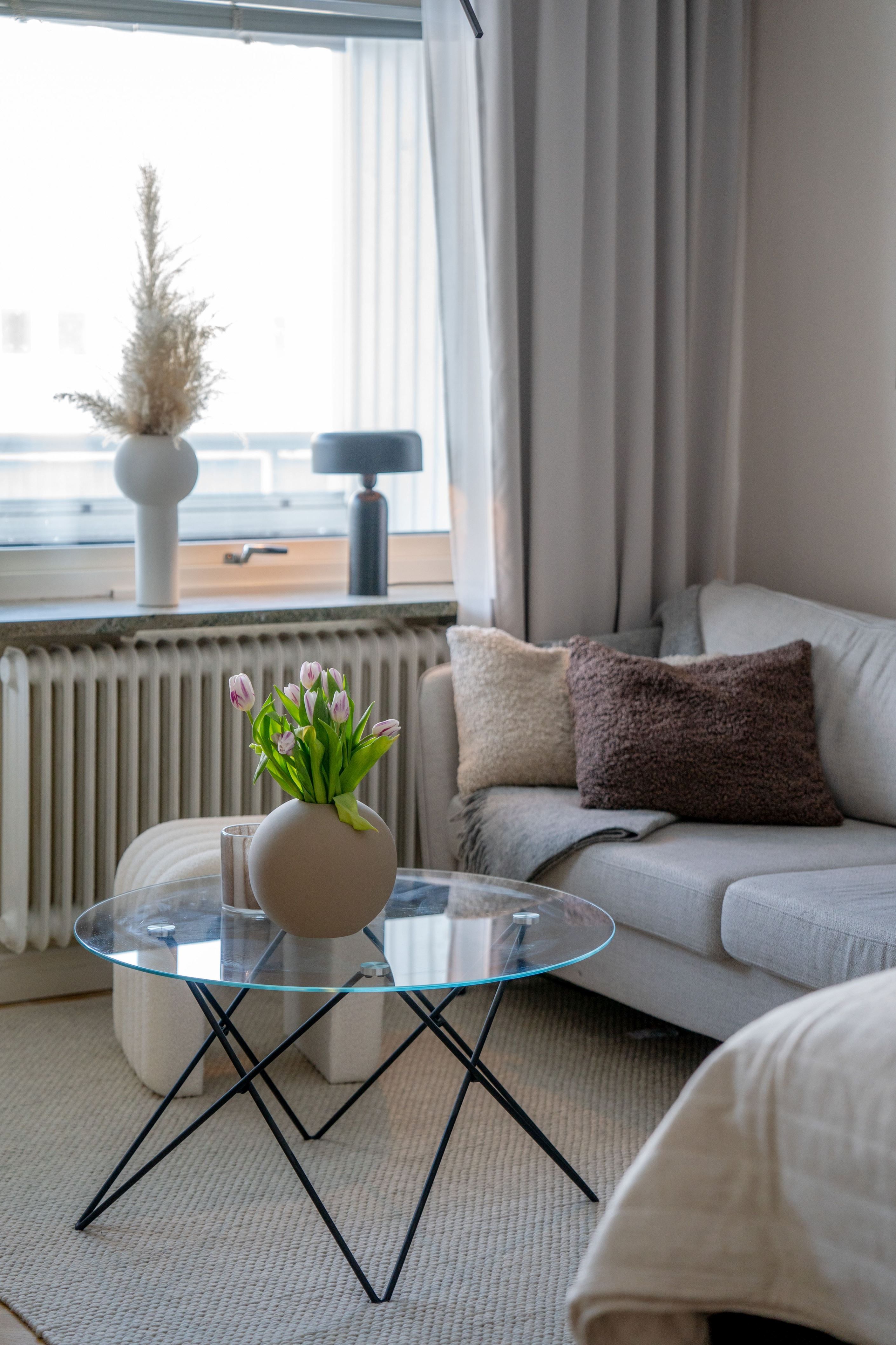 Vidare finner du ett väl tilltaget allrum med plats för såväl tv-hörna som sovplats. Här ligger ett välbevarat och otroligt vackert fiskbensparkett och pryder golvet medan väggarna är ljust målade. Via vardagsrummet når du dessutom en väl tilltagen inglasad balkong i västläge. Här kan du njuta av härliga sommarkvällar i en skön loungegrupp.