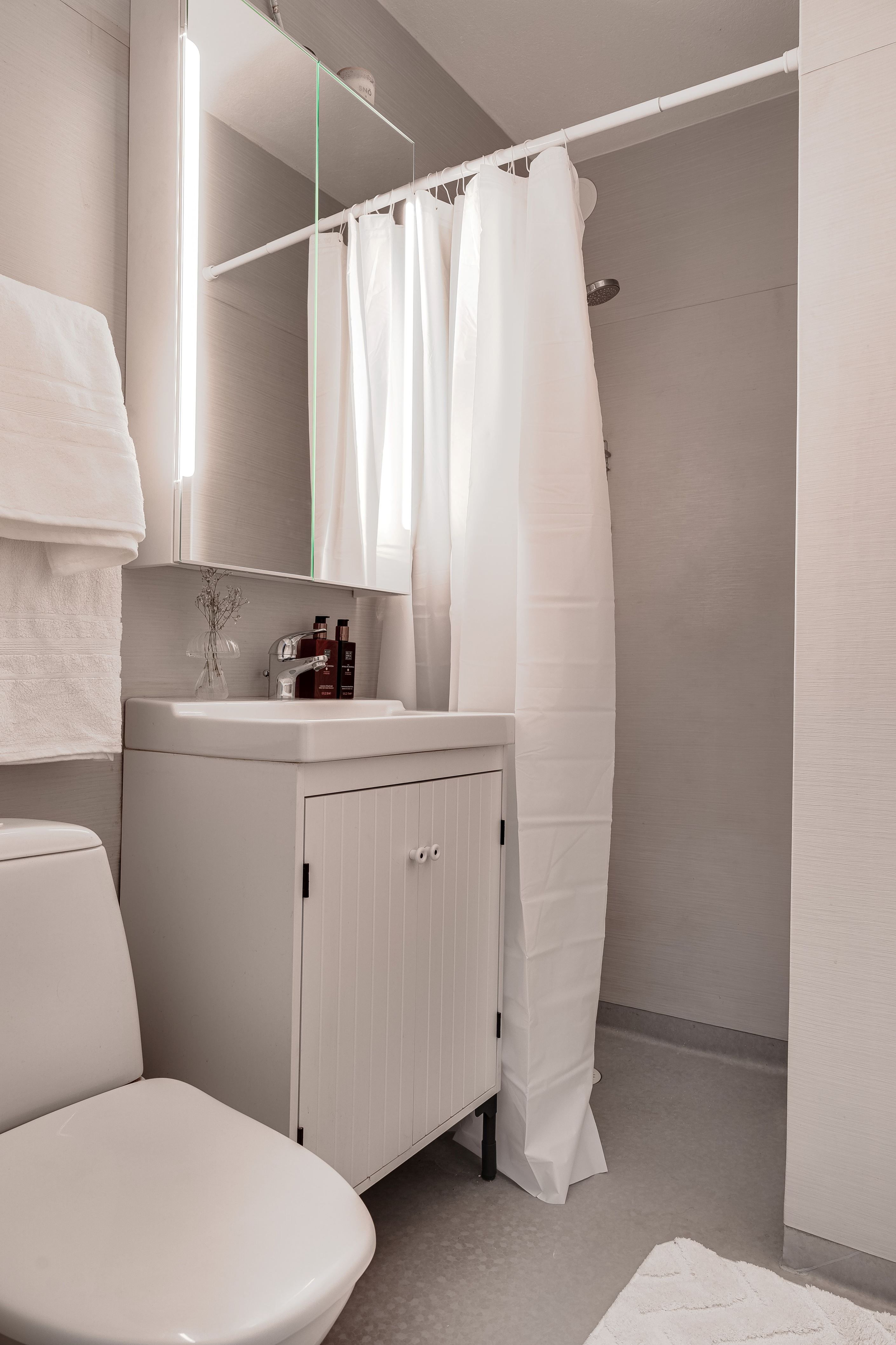 Via hallen når du sedan ett renoverat badrum. Här ligger en smakfull grå våtrumsmatta på golvet och väggarna har en något ljusare grå/grön våtrumstapet. Utöver detta så är utrymmet utrustat med WC, dusch och en vit kommod med spegelskåp ovan.