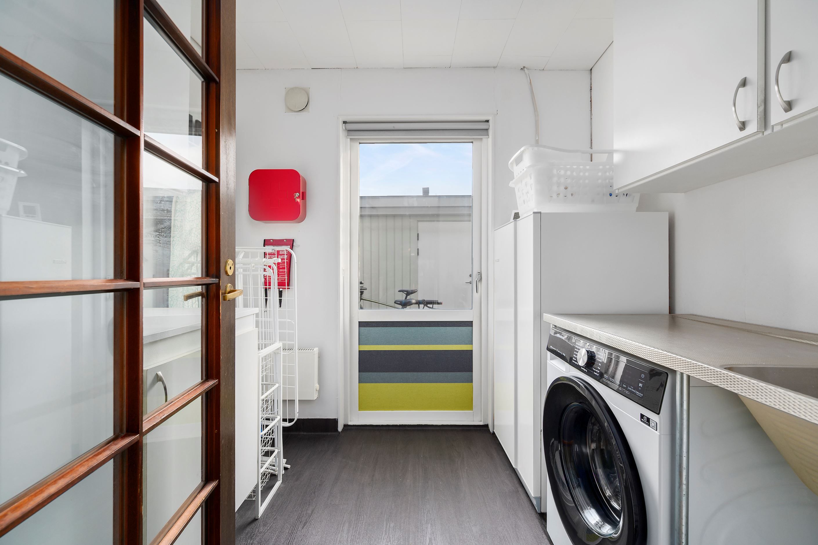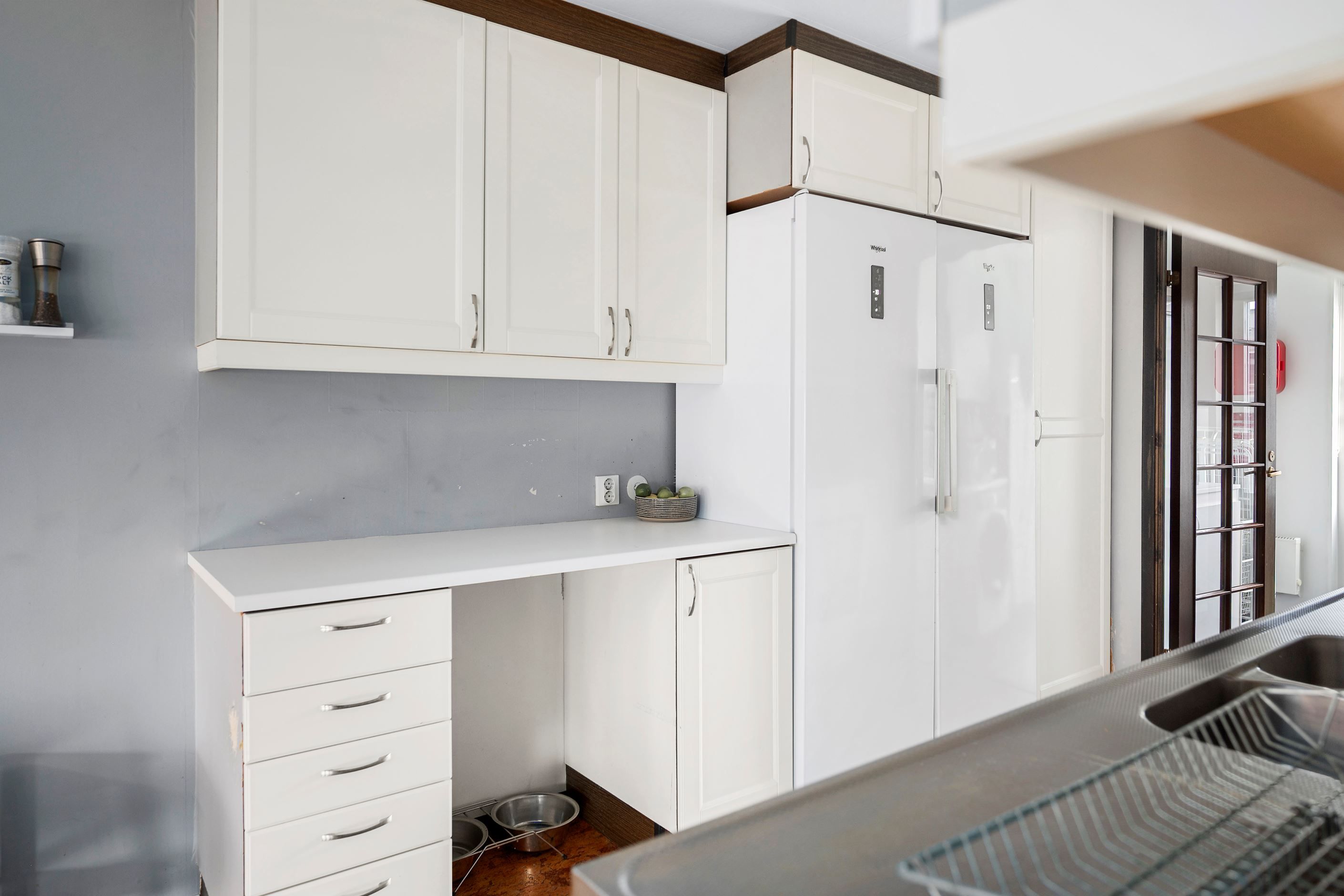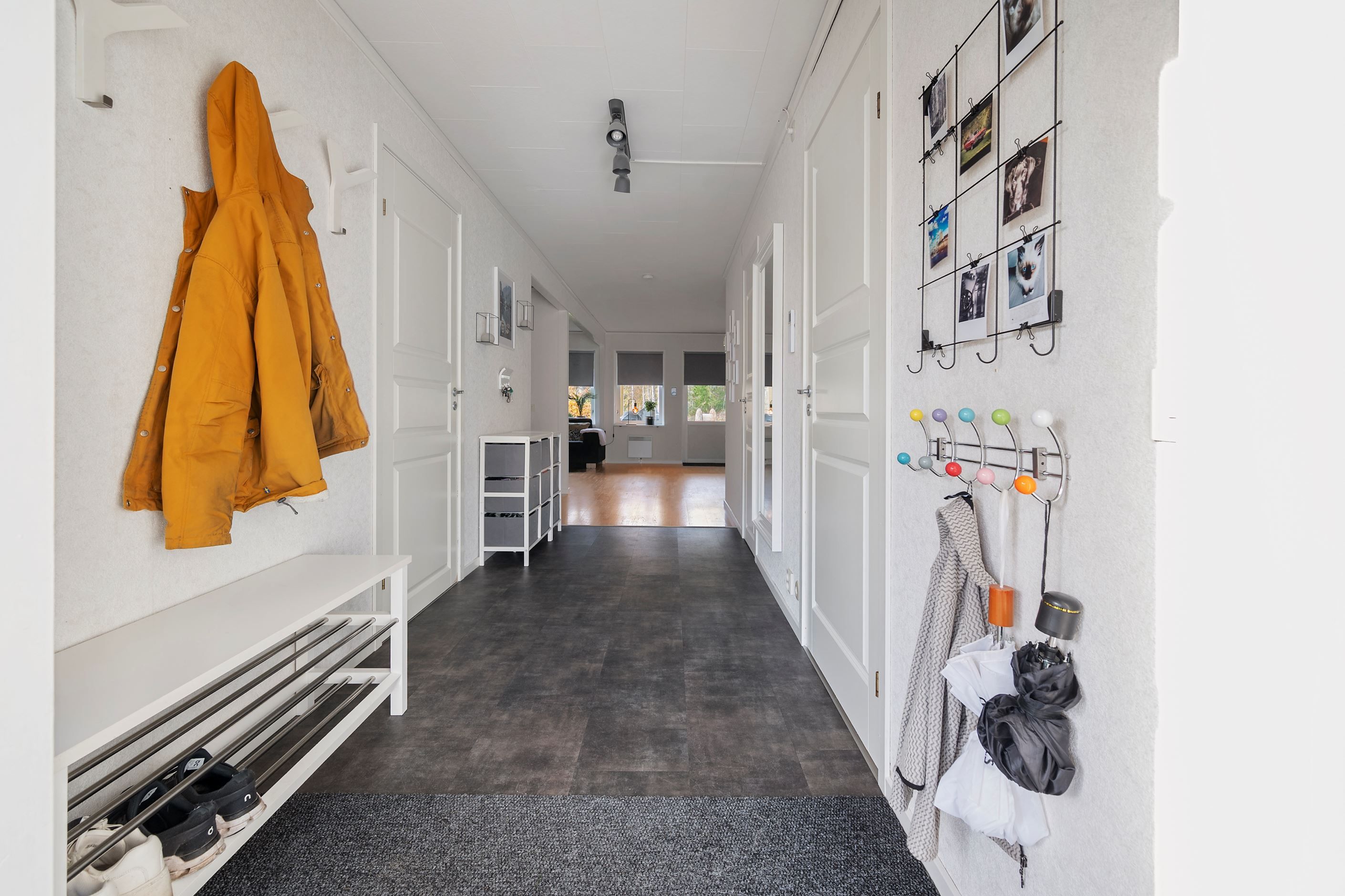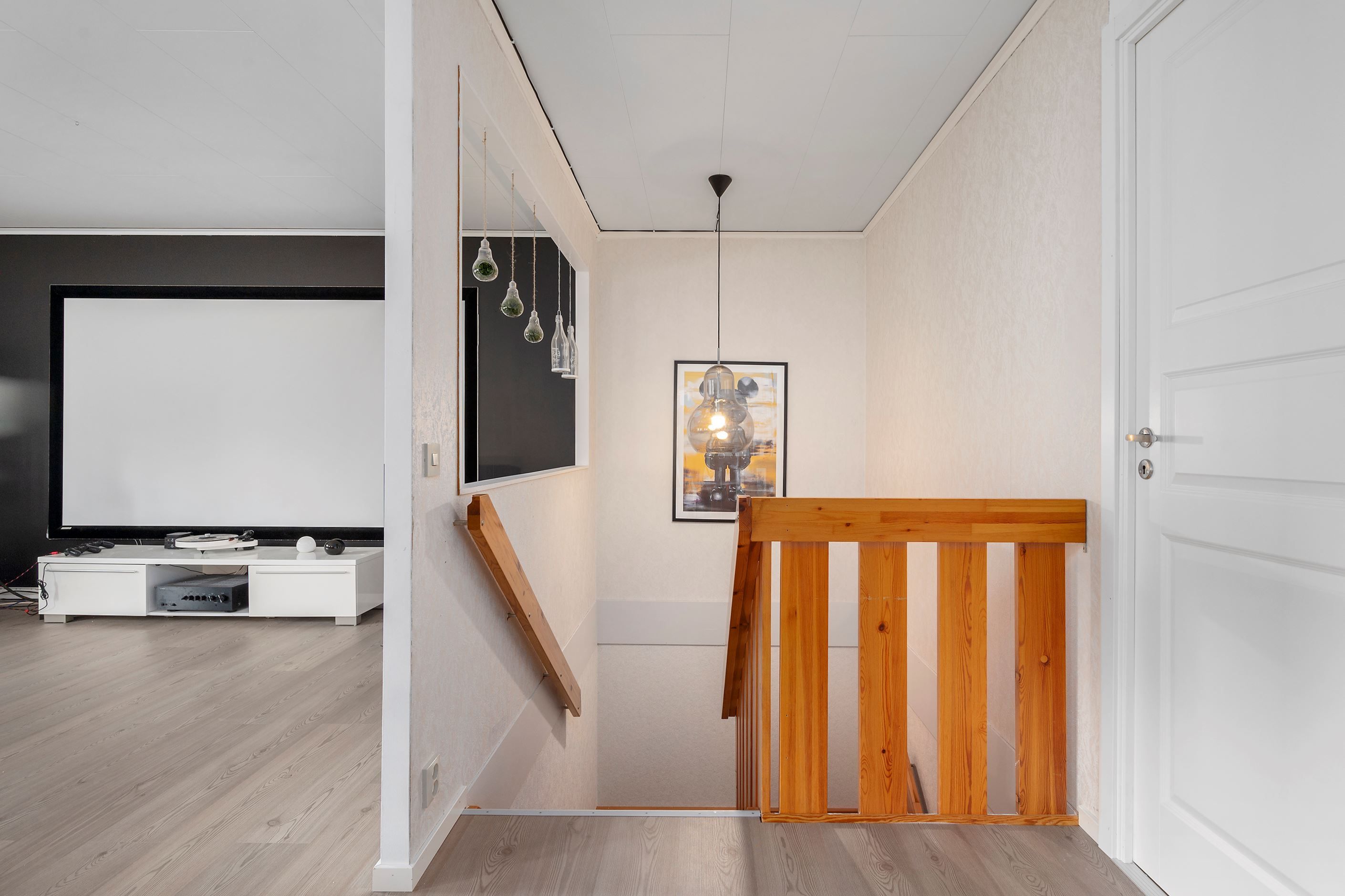 På entréplan möts du av en välkomnande hall med bra förvaringsmöjligheter. Här finns även ett smakfullt renoverat badrum direkt till höger samt ett sovrum som passar lika bra som gästrum, tonårsrum eller kanske ett bekvämt sovrum på markplan till vänster. Köket med matplats ligger i öppen planlösning mot vardagsrummet och skapar en ljus och social miljö där familj och vänner gärna samlas. Intill köket finns en praktisk och stilfull tvättstuga med goda arbetsytor och förvaring – en uppskattad detalj i vardagen. Från vardagsrummet nås en härlig altan i sydvästläge som bjuder på många soltimmar och plats för både middagar, grillkvällar och avkoppling.