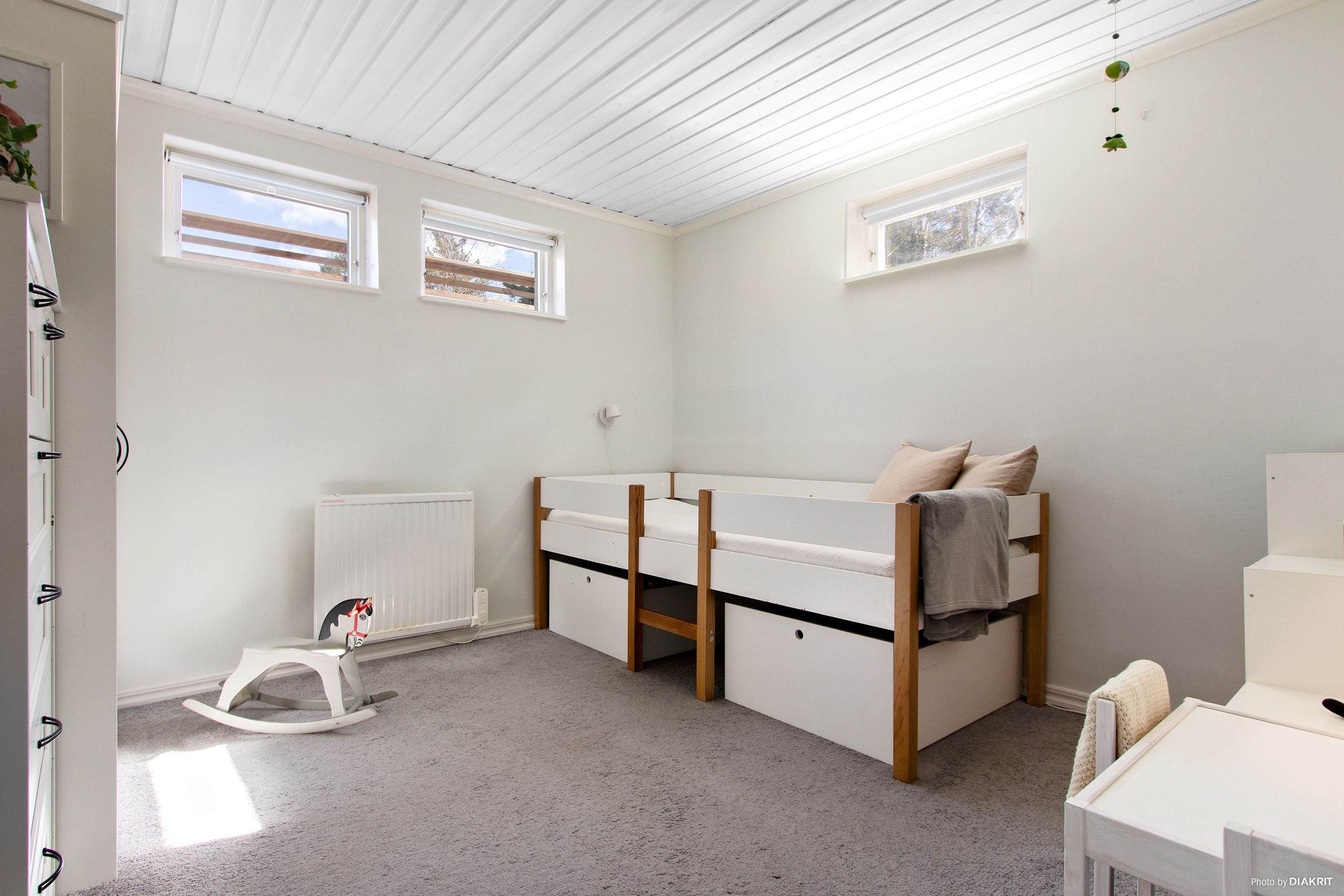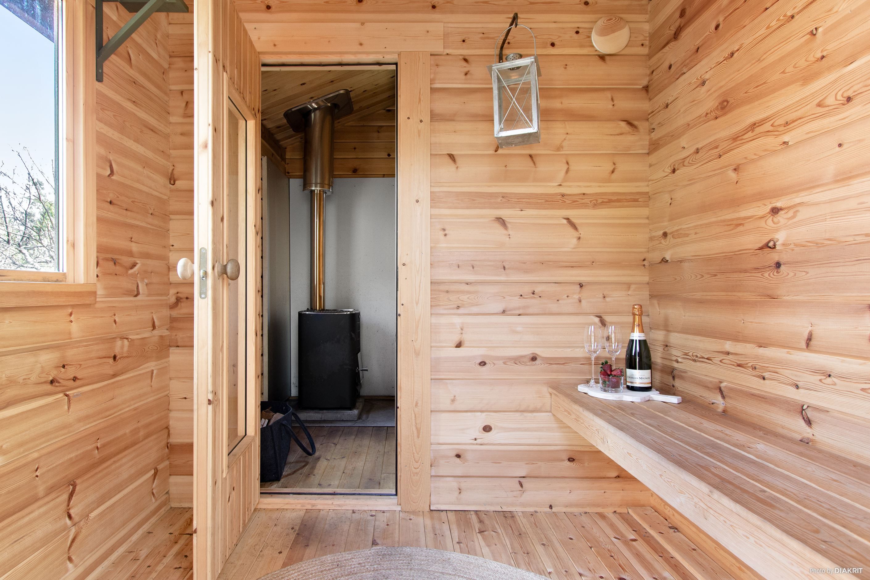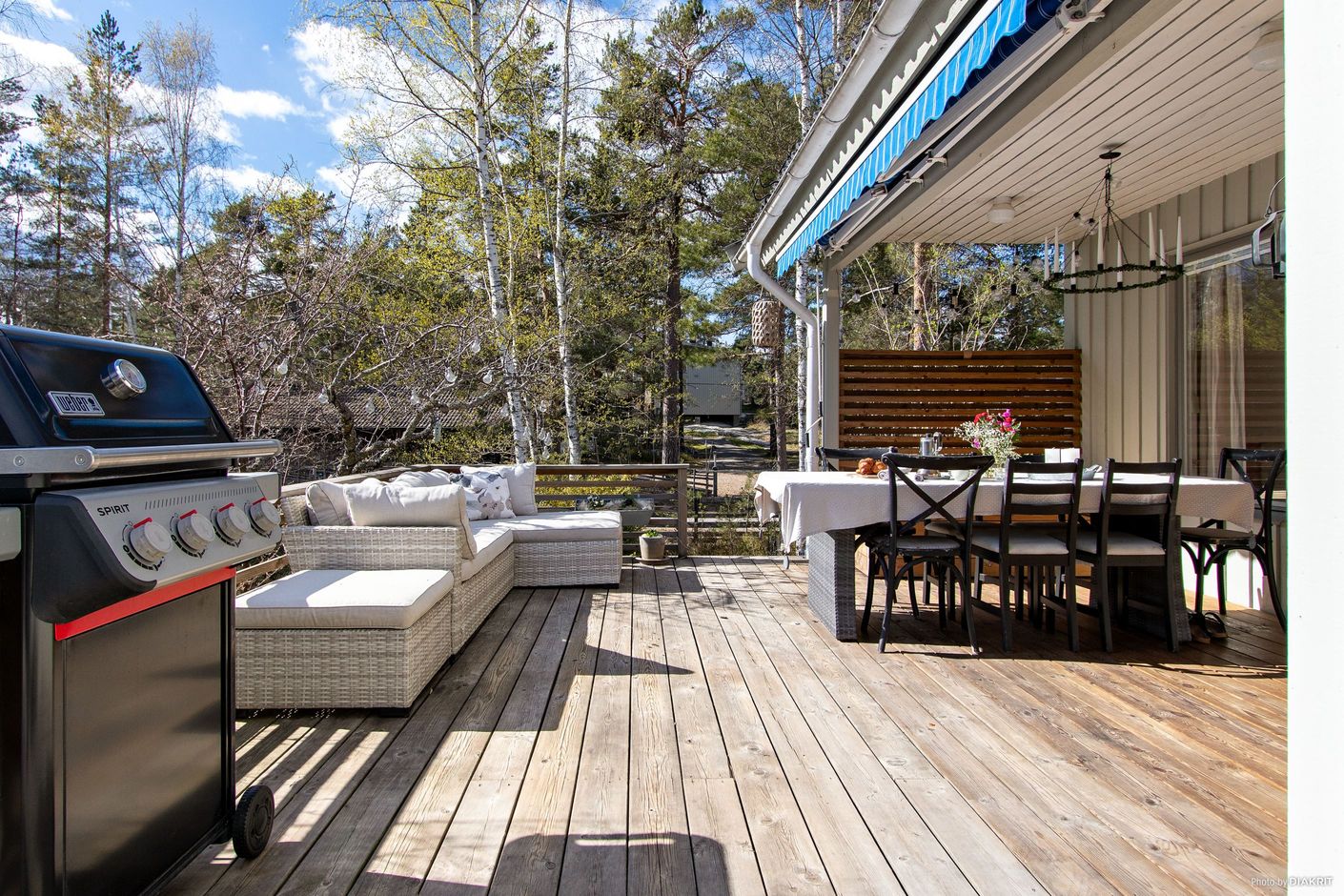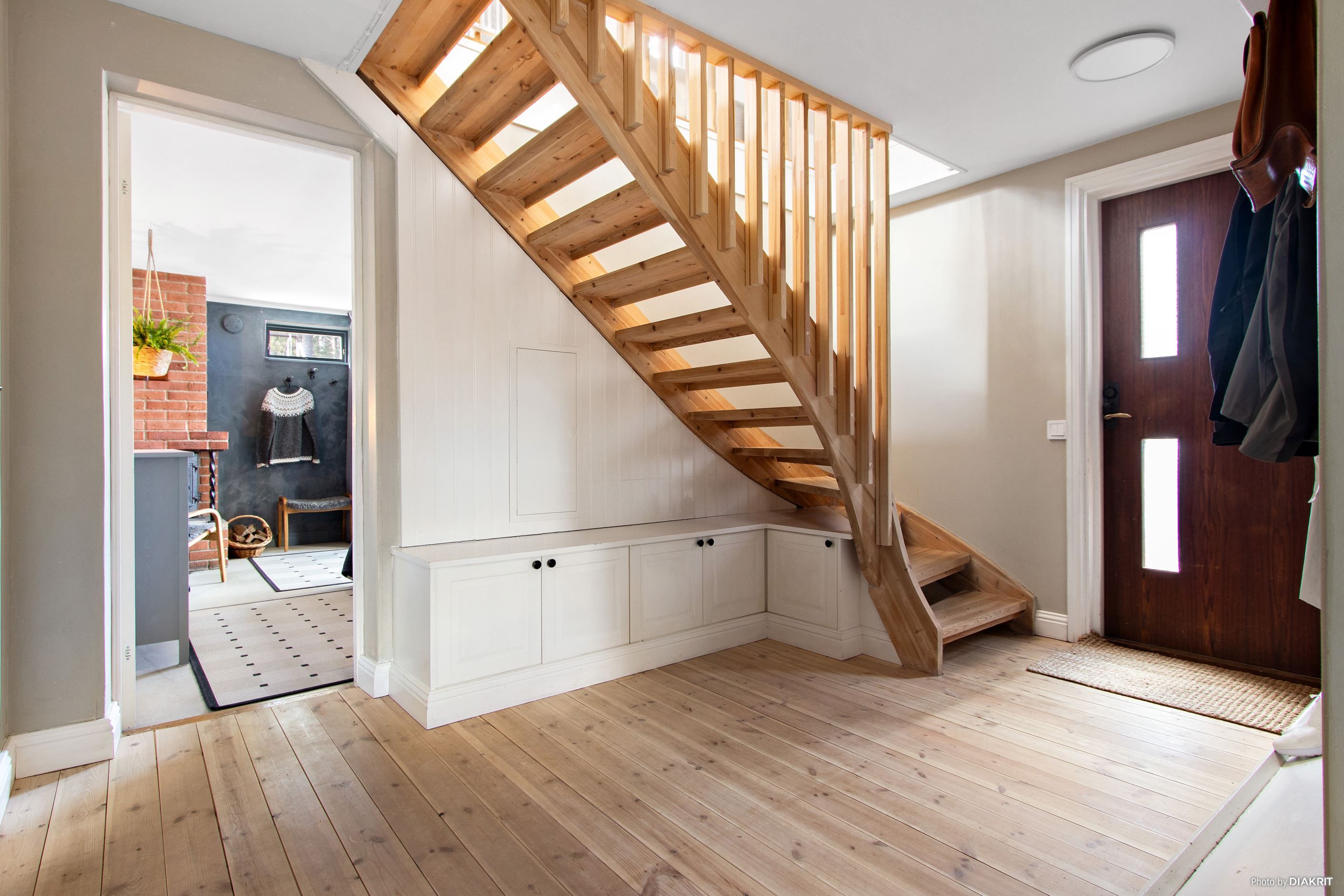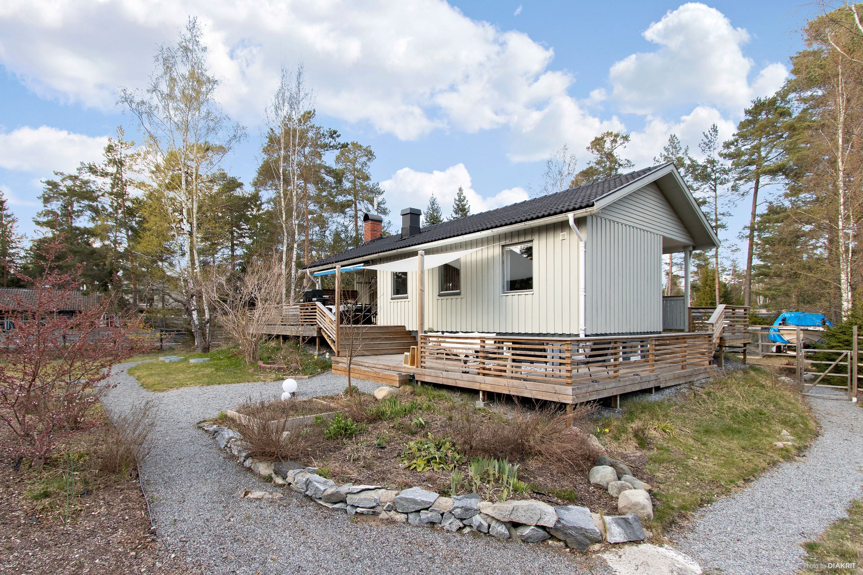 Huset är fördelat på ett plan med inrett källarplan och har en totalyta om 101 kvm. Entréplanet rymmer ett till två sovrum, badrum samt tvättrum. Övre planet erbjuder ett ljust vardagsrum, ett rymligt kök med matplats samt ytterligare ett sovrum samt toalett. Från huset nås en generös altan som löper runt byggnaden i tre väderstreck, delvis under tak – perfekt för både morgonkaffe och långa sommarkvällar. På tomten finns även en separat bastubyggnad med vedeldad bastu och relaxavdelning.