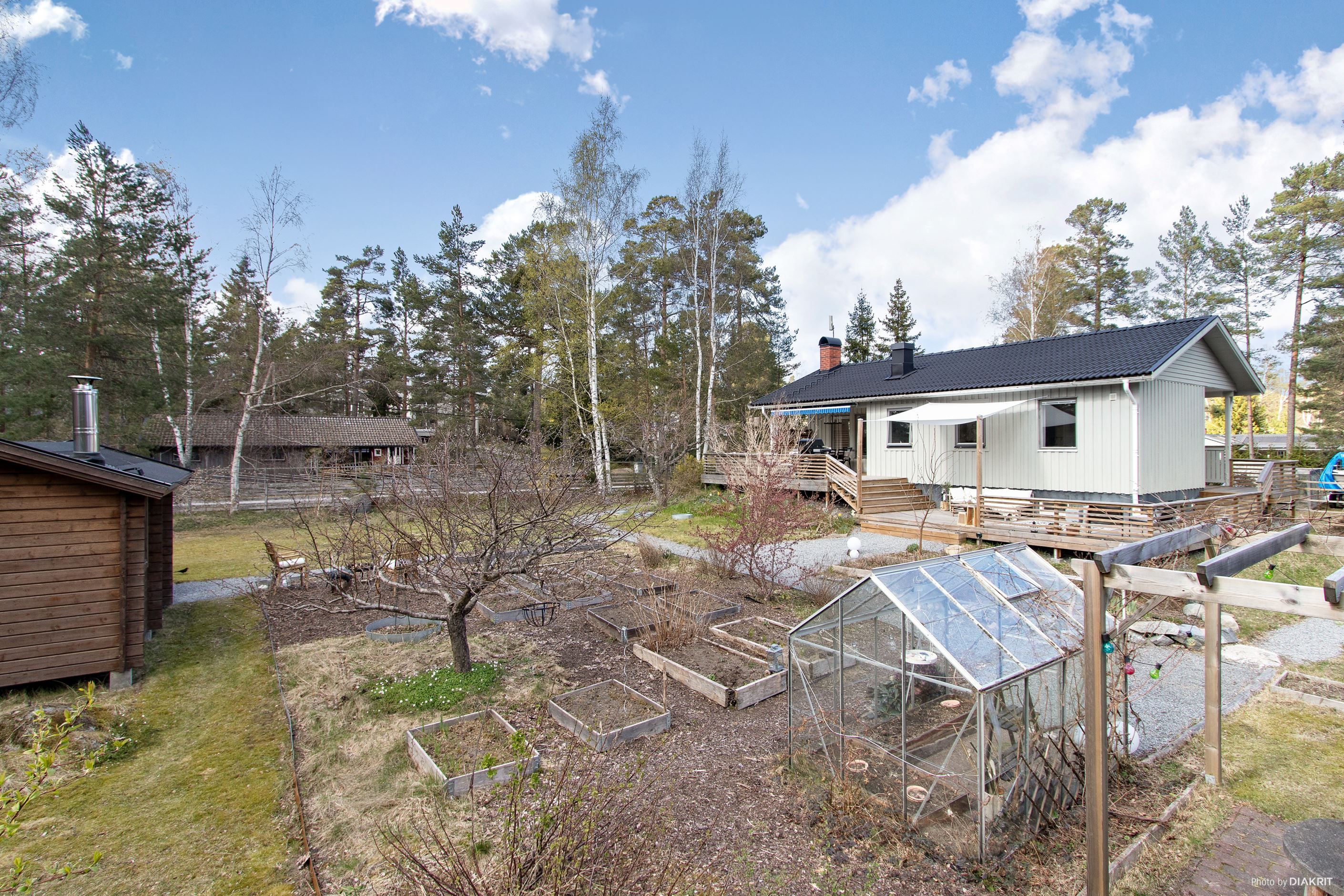 Fastigheten är soligt belägen på en plan och trivsam trädgårdstomt med goda möjligheter för odling. Här finns växthus, en charmig pergola samt ett litet hönshus för den som önskar ett lantligt inslag i vardagen. På tomten finns även ett äldre garage/förråd samt ett separat gästrum.
