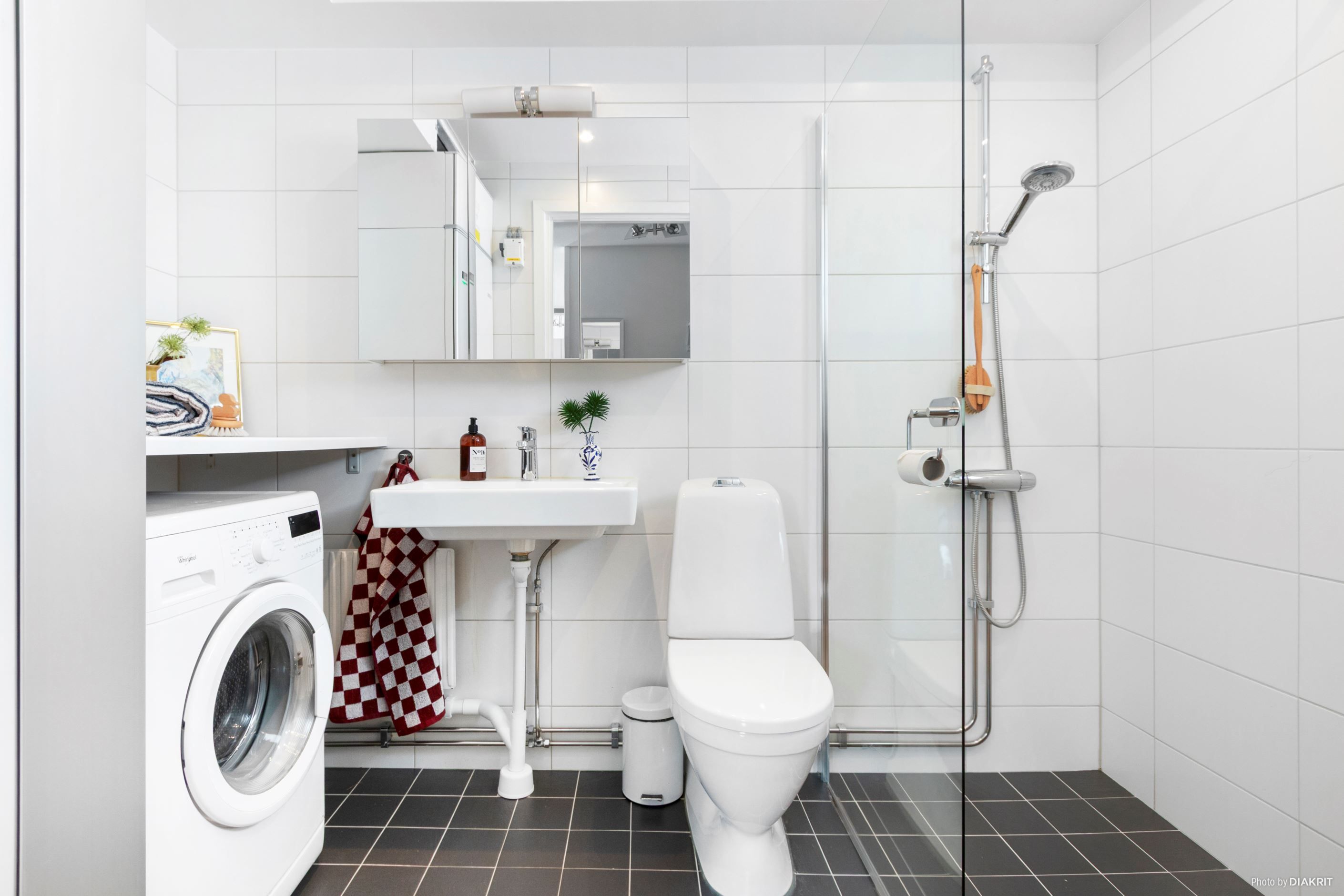 Rymligt helkaklat badrum utrustad med duschhörna med glasväggar, toalett, handfat samt tvättmaskin. I badrummet finns även en panna/frånluftsvärmepump.