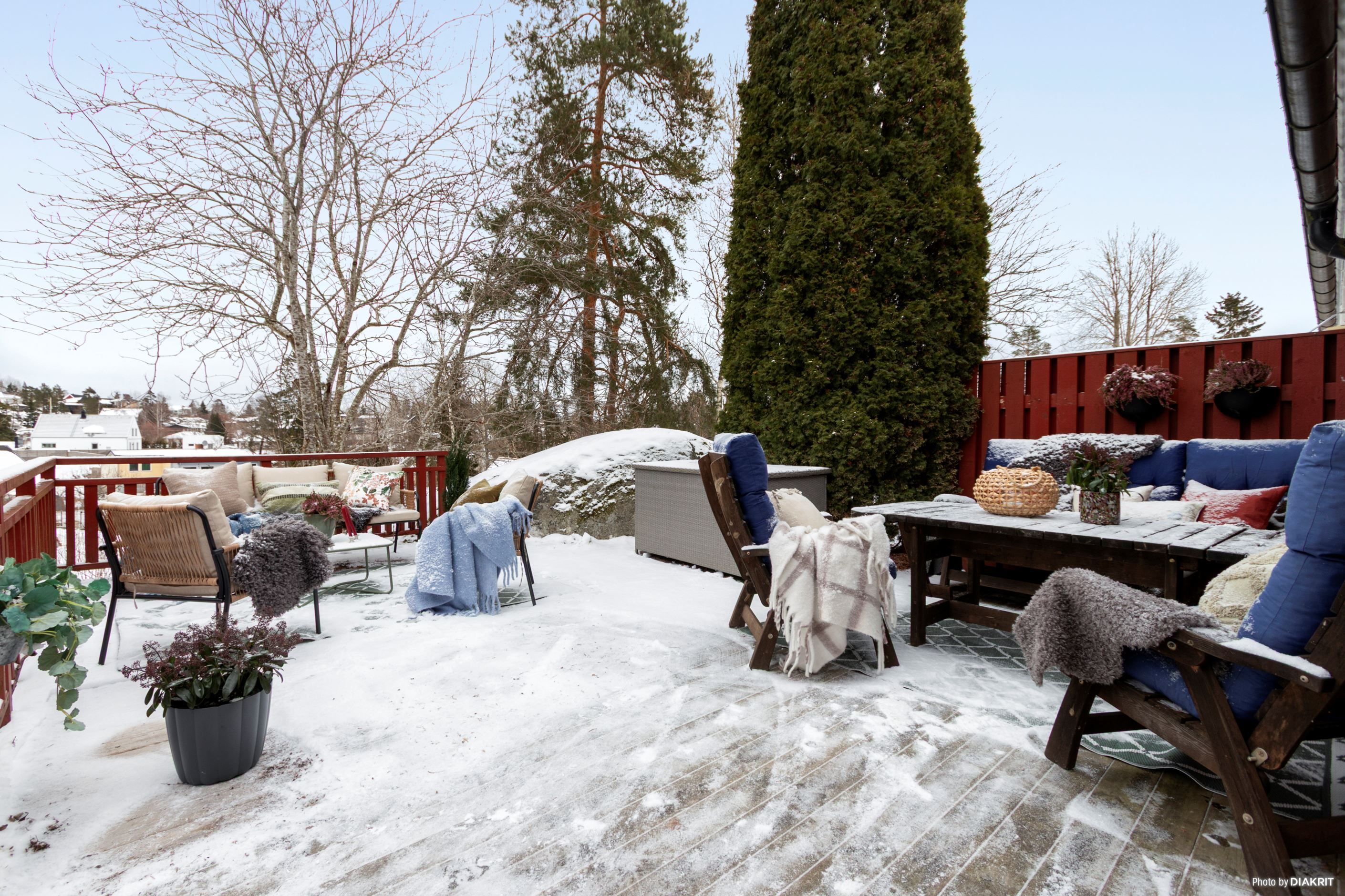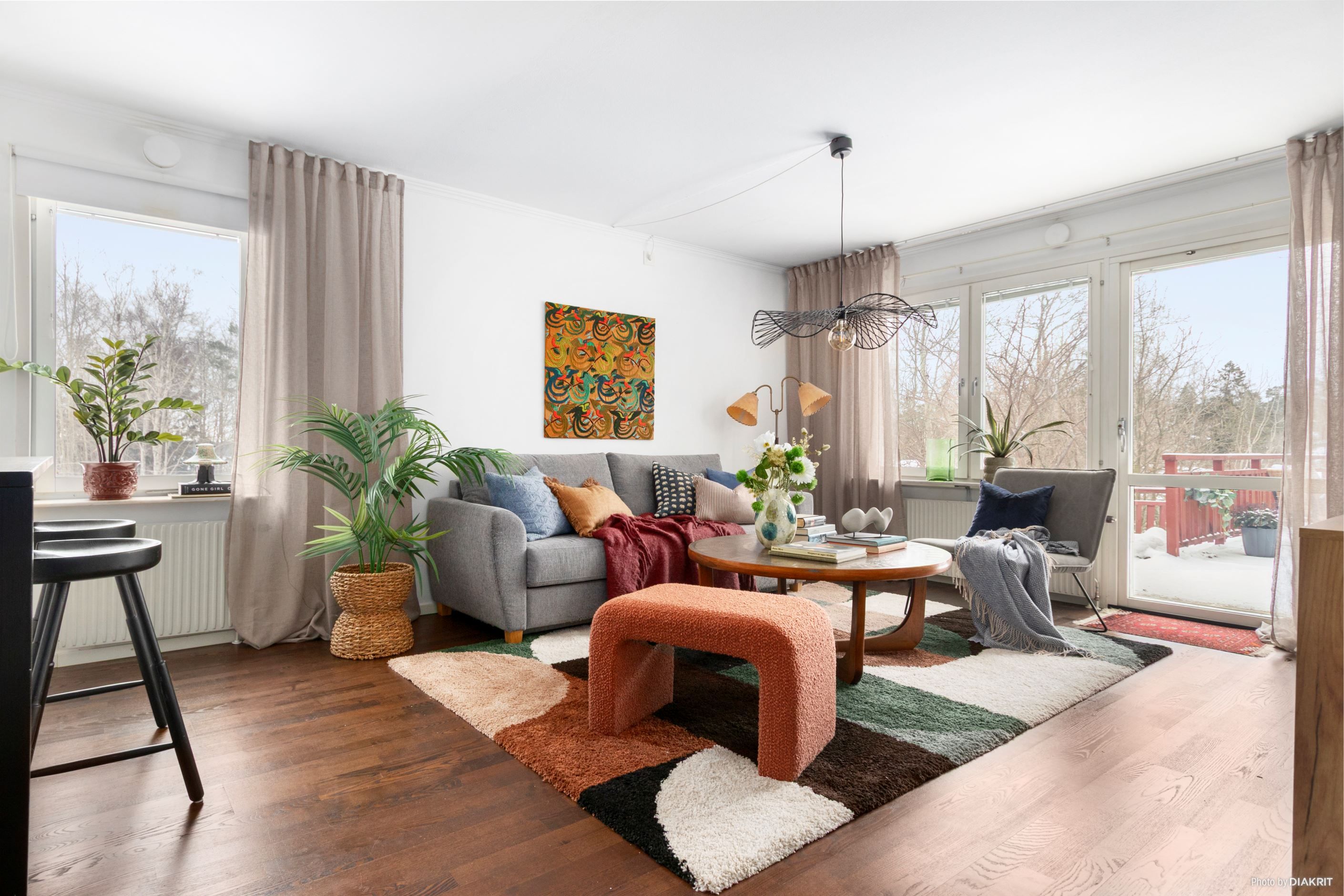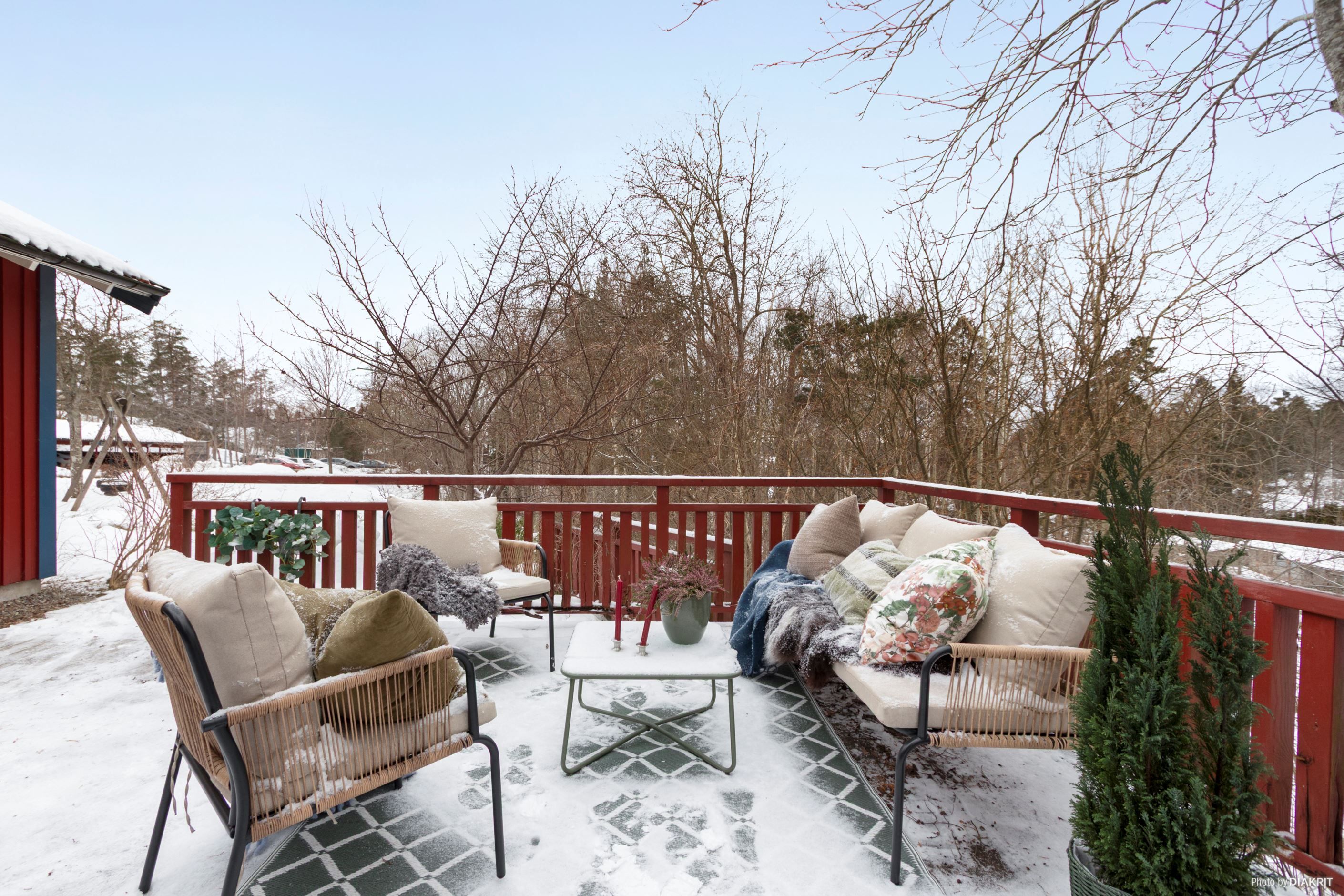 Stort vardagsrum med gott om plats för soffgrupp och tv-möblemang. Här finns stora fönsterpartier i tre väderstreck som ger ett rikligt ljusinsläpp samt balkongdörr ut till uteplats. Den stora uteplatsen är trädäckad och ligger vackert belägen med utsikt mot grönområde. Här finns gott om plats för både matbord och soffgrupp.