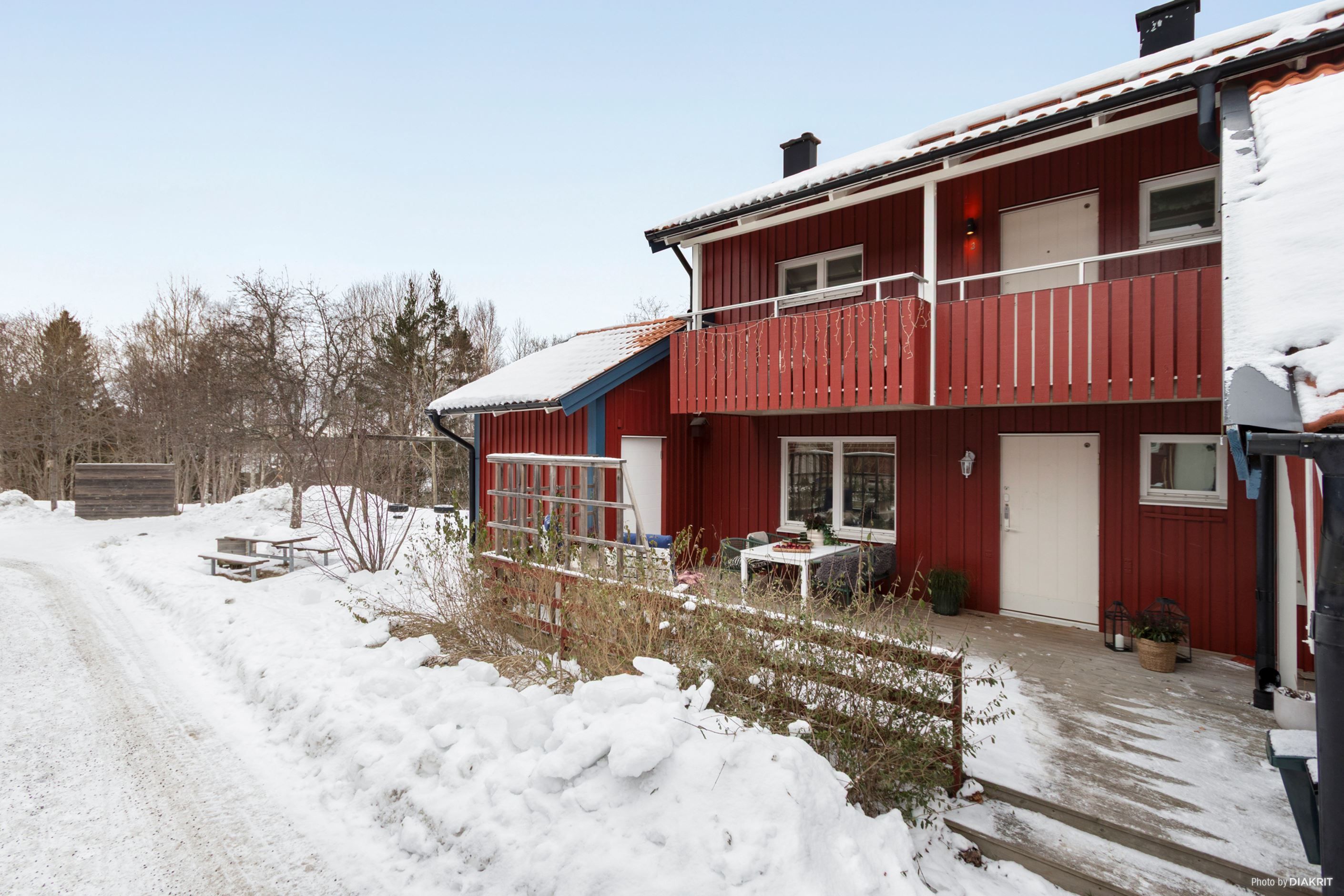 Hall med plats för avhängning närmast entré. Utanför entrén finns en stor uteplats i sydvästläge samt bostadens förråd.