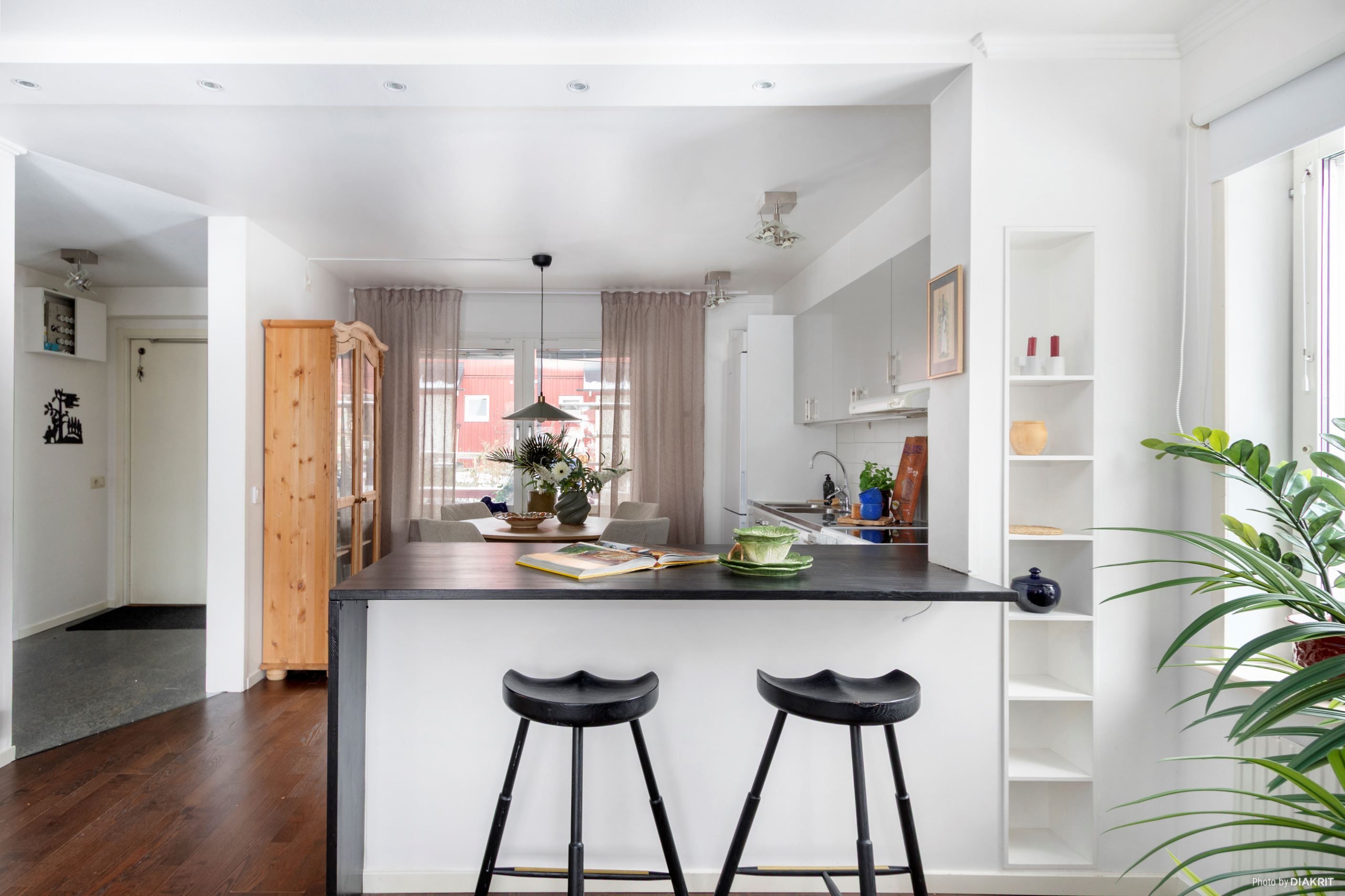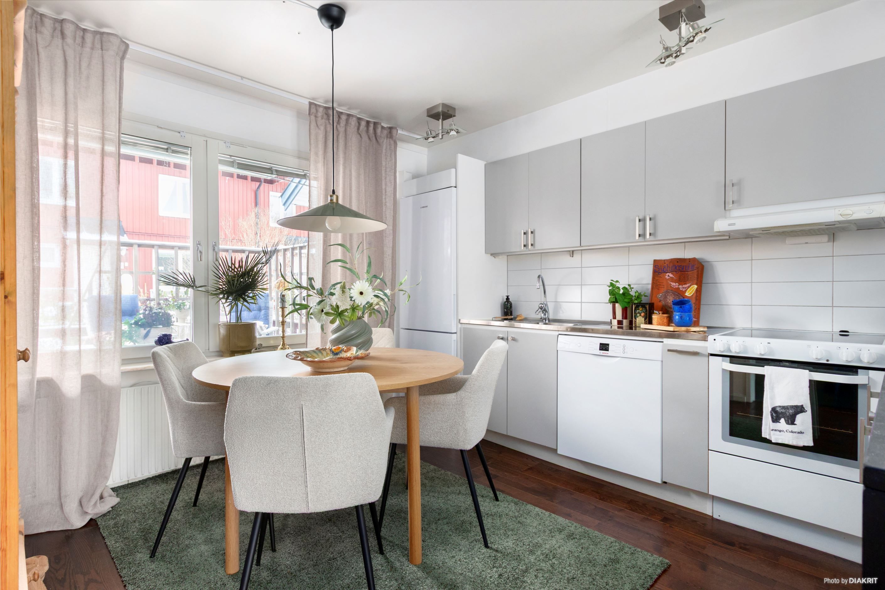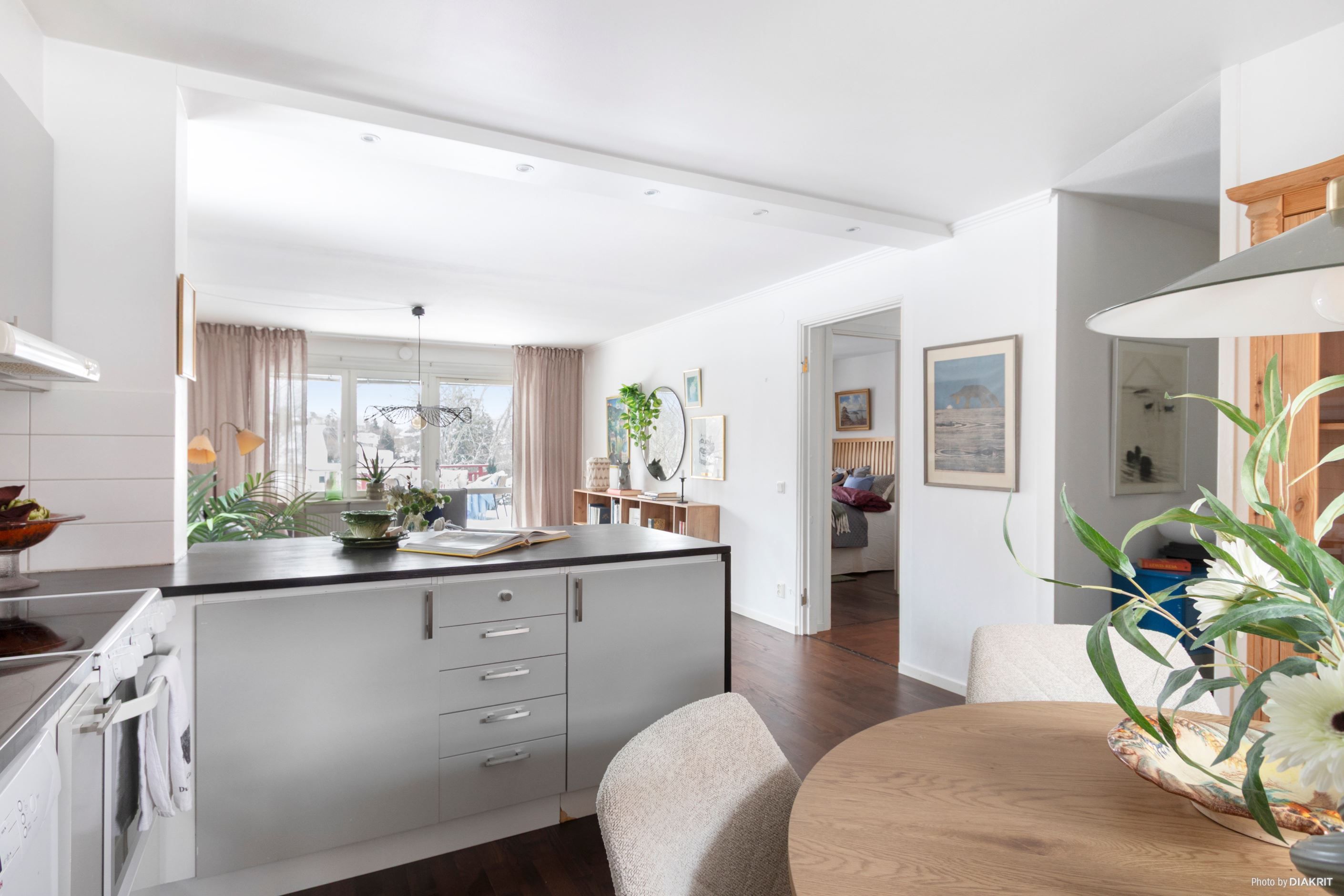 Lägenheten har ett trevligt kök med öppen planlösning mot vardagsrum, plats för matbord vid fönster samt gott om förvaring och arbetsyta. Moderna vitvaror med diskmaskin, spis, spisfläkt och kyl/frys.