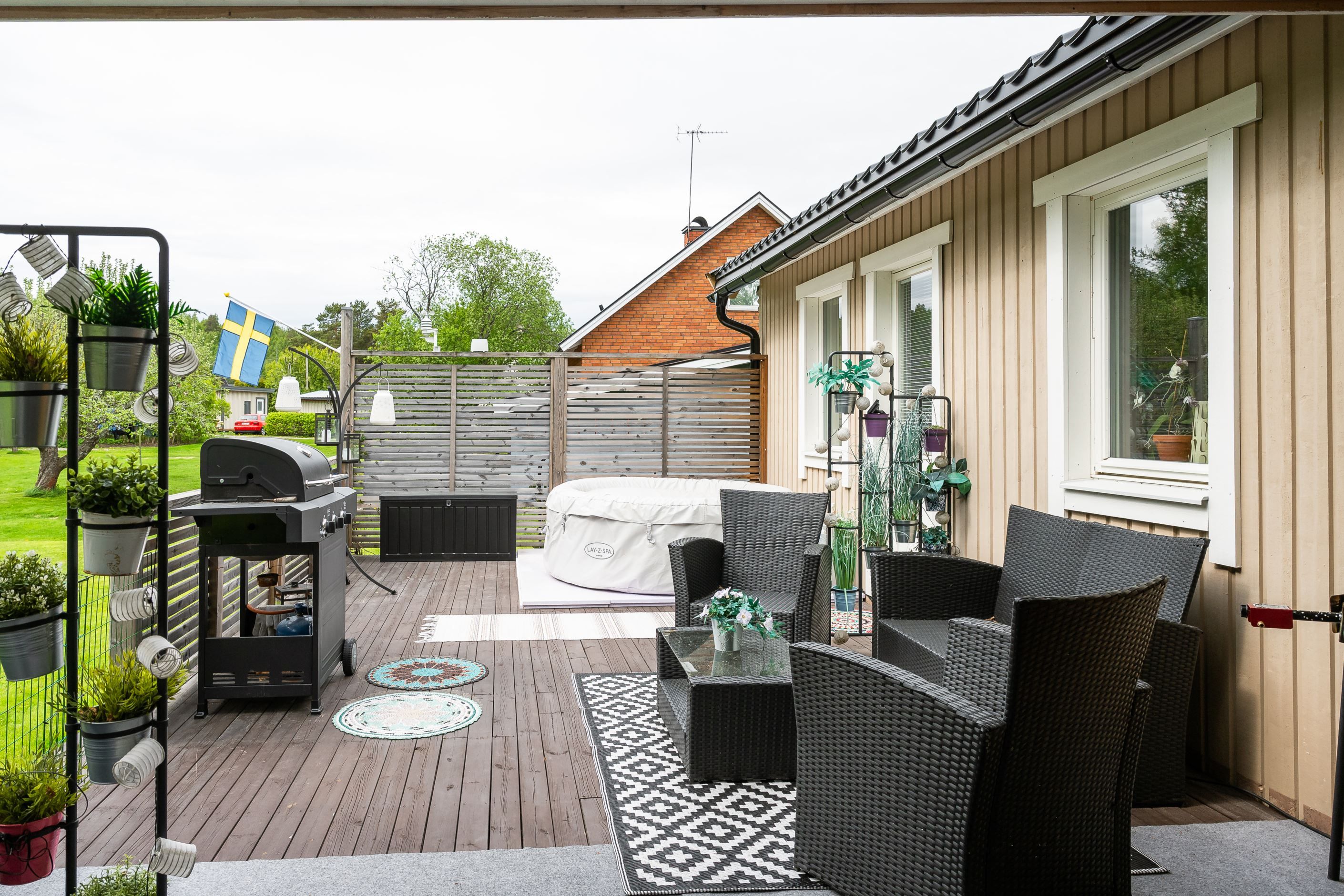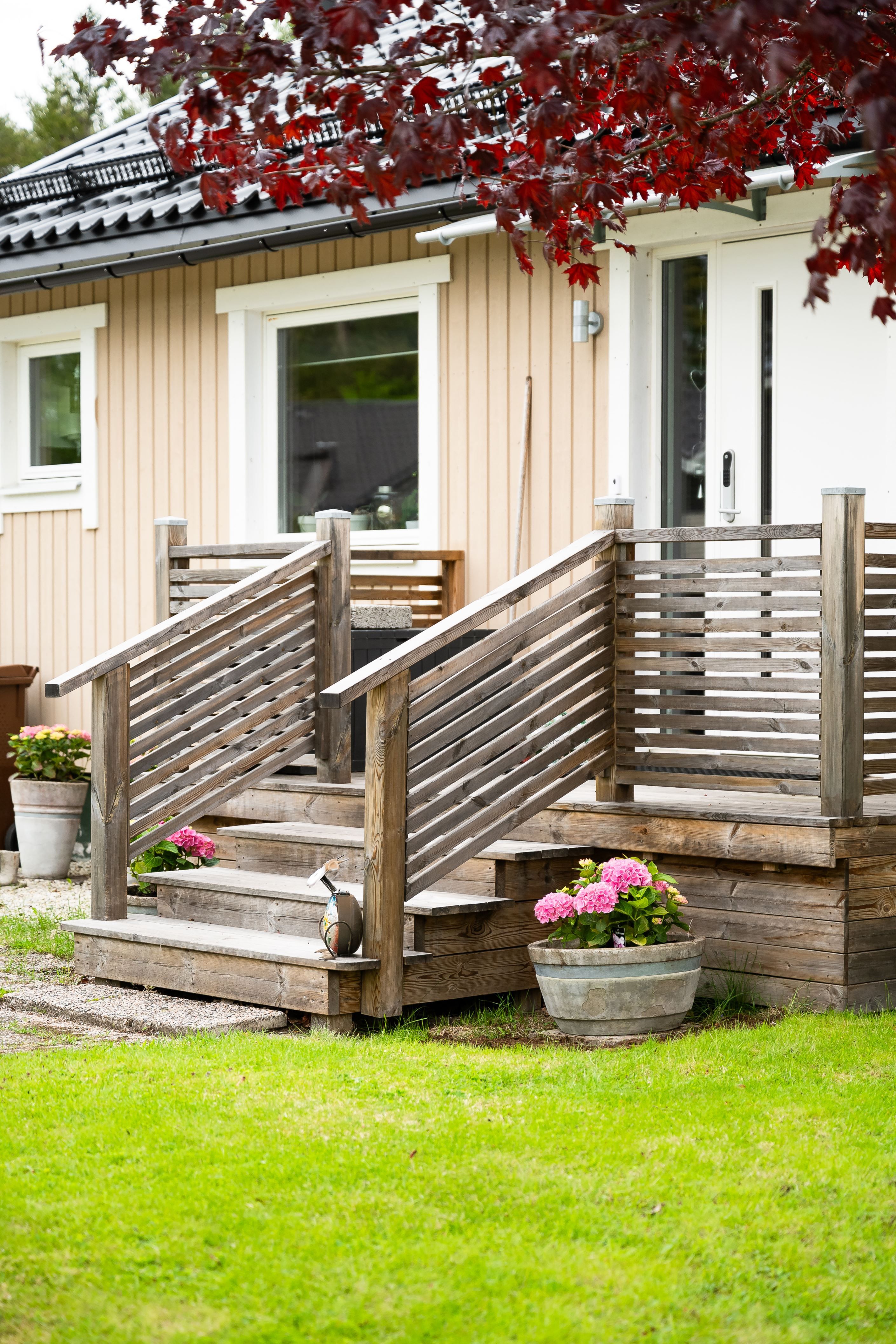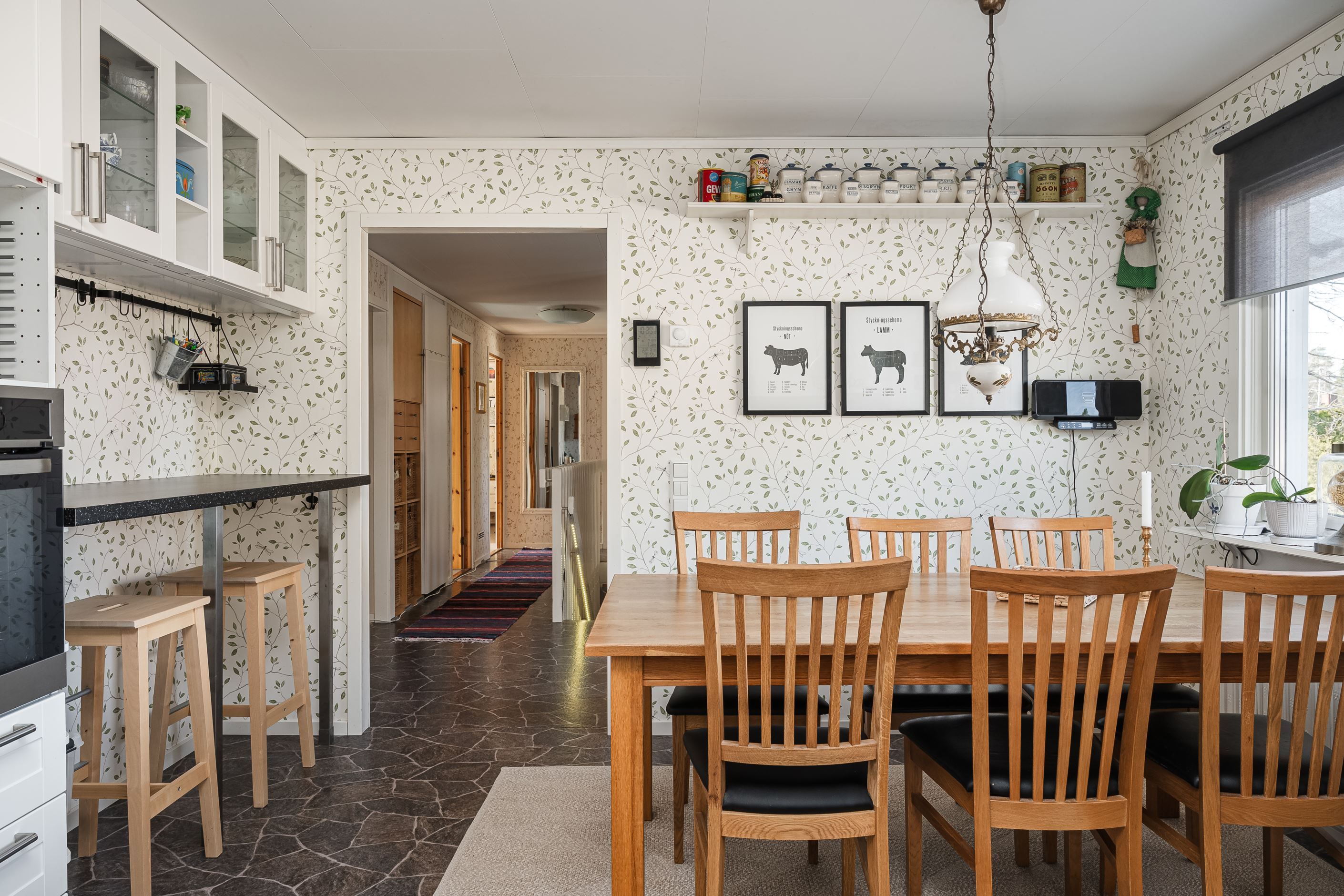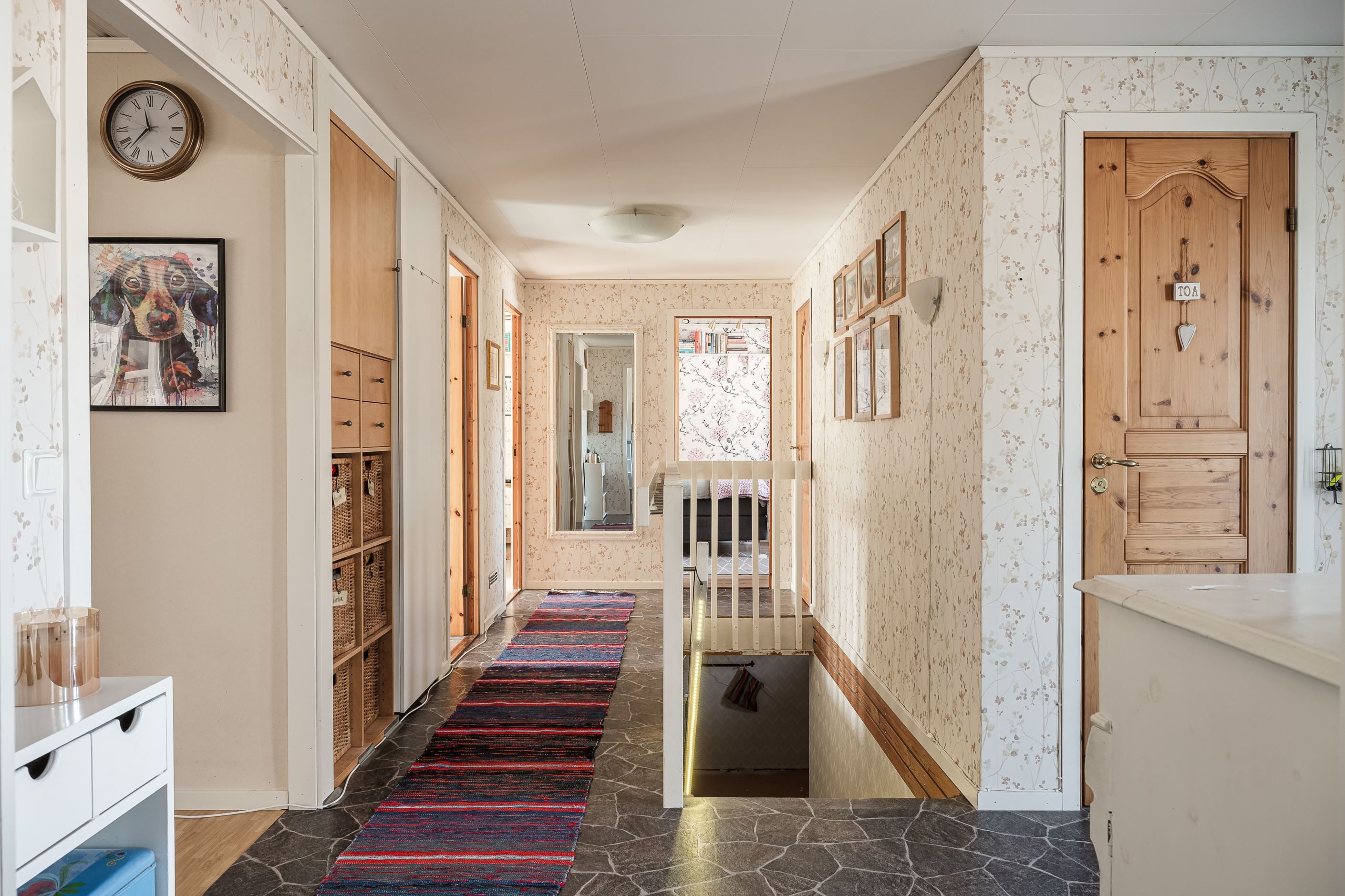 Entréplanet präglas av ljus, rymd och trivsel. Det stora köket har gott om förvaring och en hemtrevlig karaktär, med både moderna lösningar och ett charmigt skafferi som sätter tonen. Intill ligger vardagsrummet med stora fönsterpartier som släpper in rikligt med dagsljus och skapar en härlig kontakt med den lummiga trädgården. Härifrån kliver du ut på den generösa altanen – en plats att njuta av under soliga dagar eller samla familj och vänner till trevliga kvällar. På planet finns även tre sovrum, varav ett med direkt utgång till altanen, samt ett stilrent renoverat badrum med kakel, klinker och modern inredning.