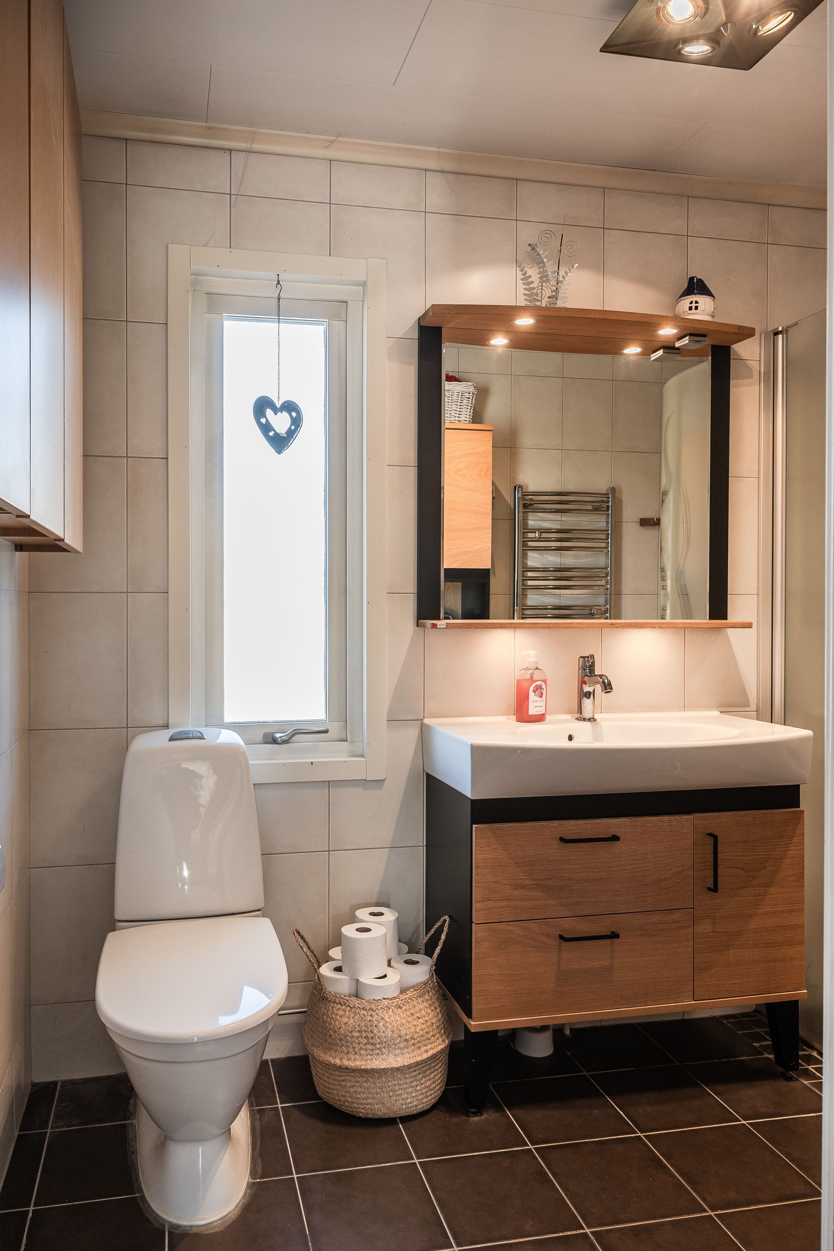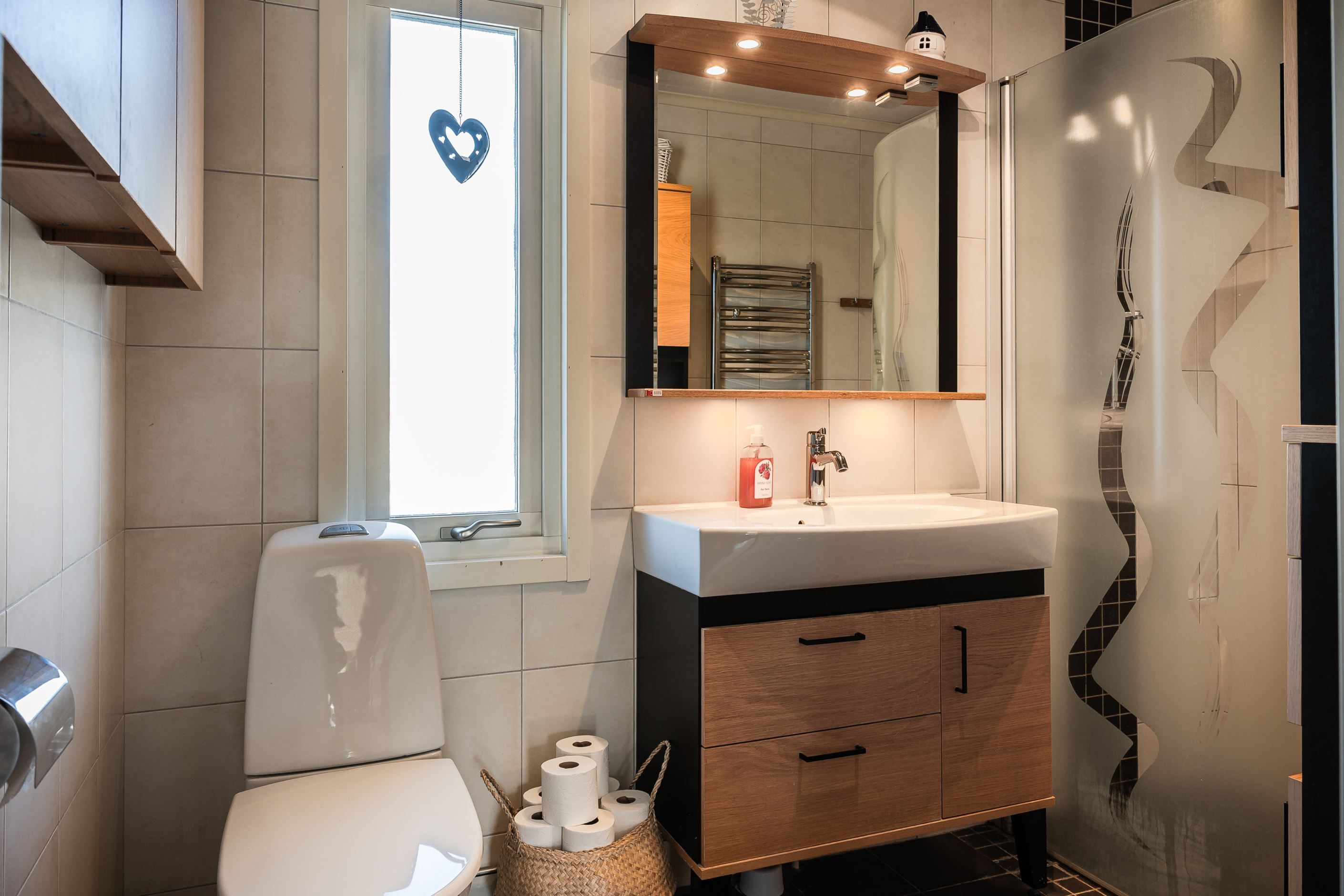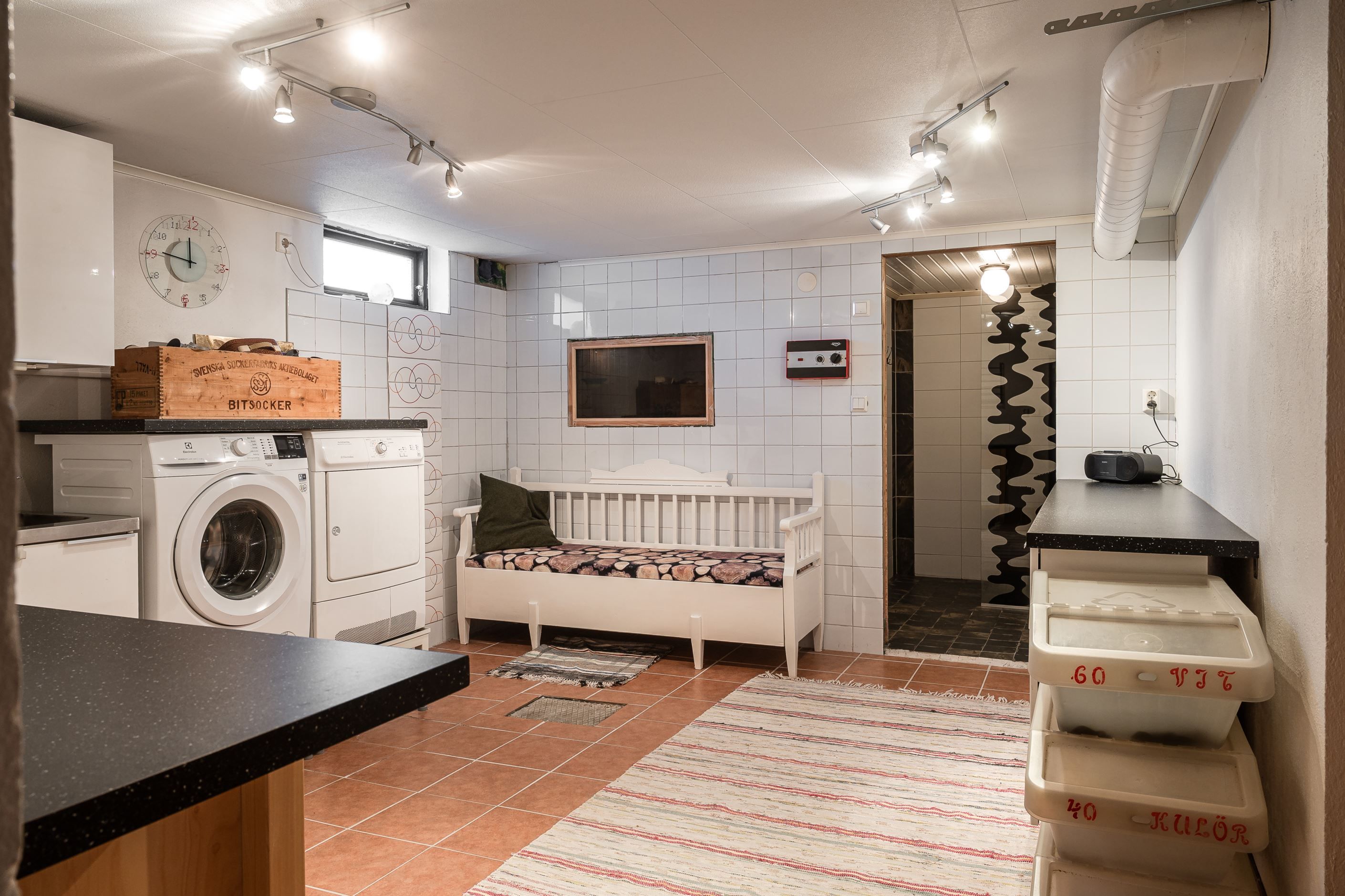 En trappa ner fortsätter den hemtrevliga känslan. Här finns en inbjudande gillestuga med kamin som värmer gott under vintern, en rymlig och välplanerad tvättstuga, gott om förvaringsutrymmen samt ett fräscht duschrum. I anslutning till detta finns även en bastu – den självklara platsen för avkoppling efter en lång dag.