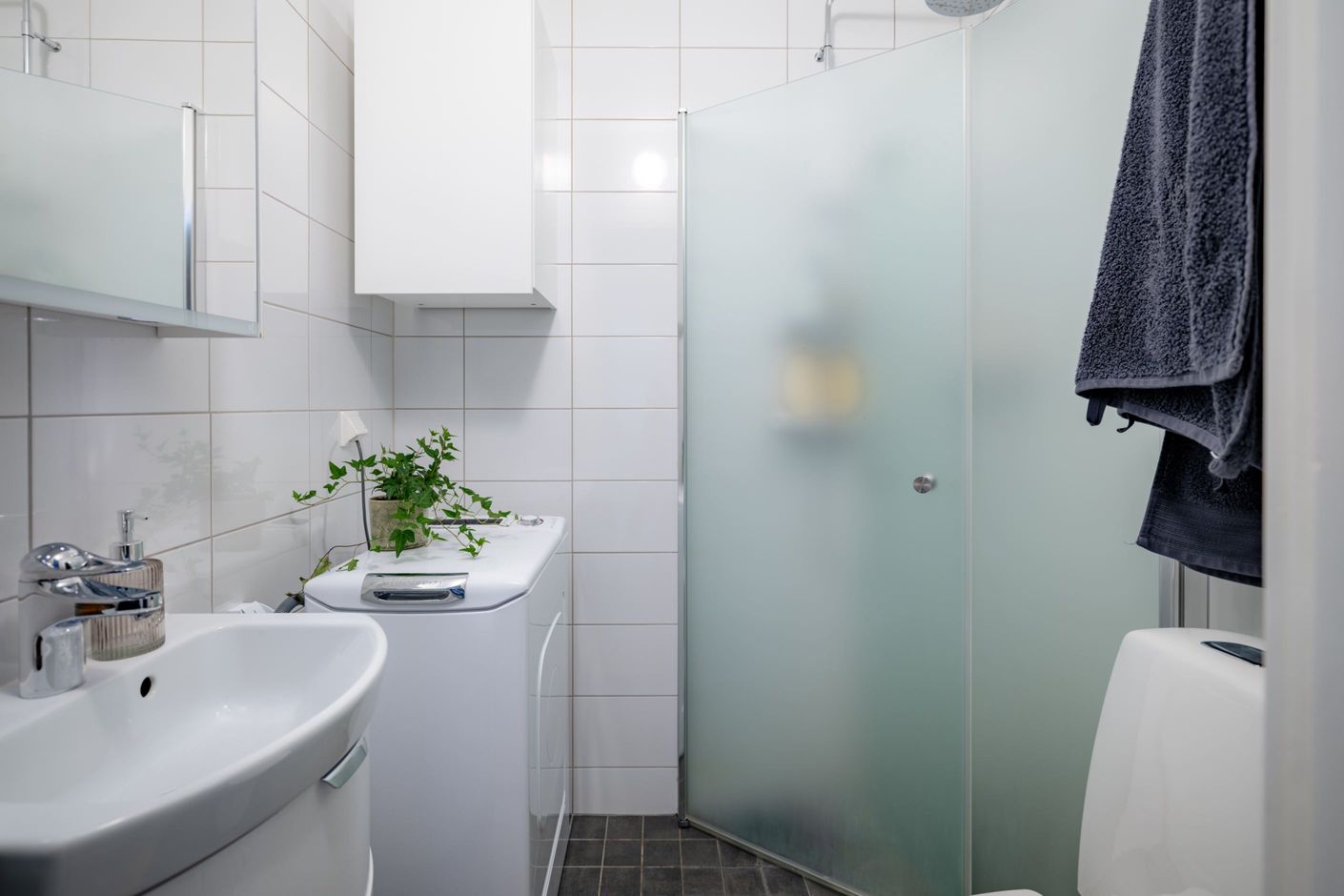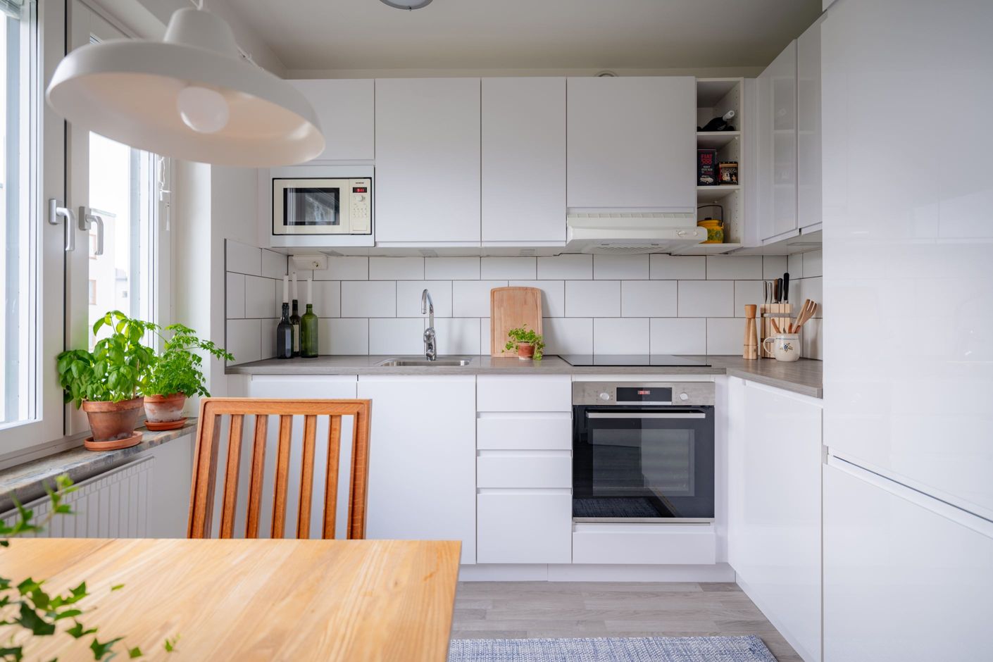 Köket är renoverat och utformat för att förena stil och praktiska lösningar. Här finns gott om arbetsytor, bra förvaring och en diskmaskin som gör vardagen enklare. Intill det stora fönstret finns plats för ett rejält matbord där middagar med vänner och familj kan avnjutas i en trivsam miljö. Hallen erbjuder bra förvaring med både klädkammare och plats för öppna lösningar för ytterkläder och skor. Badrummet är helkaklat och modernt utrustat med dusch, golvvärme och tvättmaskin – detaljer som höjer både komfort och bekvämlighet i vardagen.