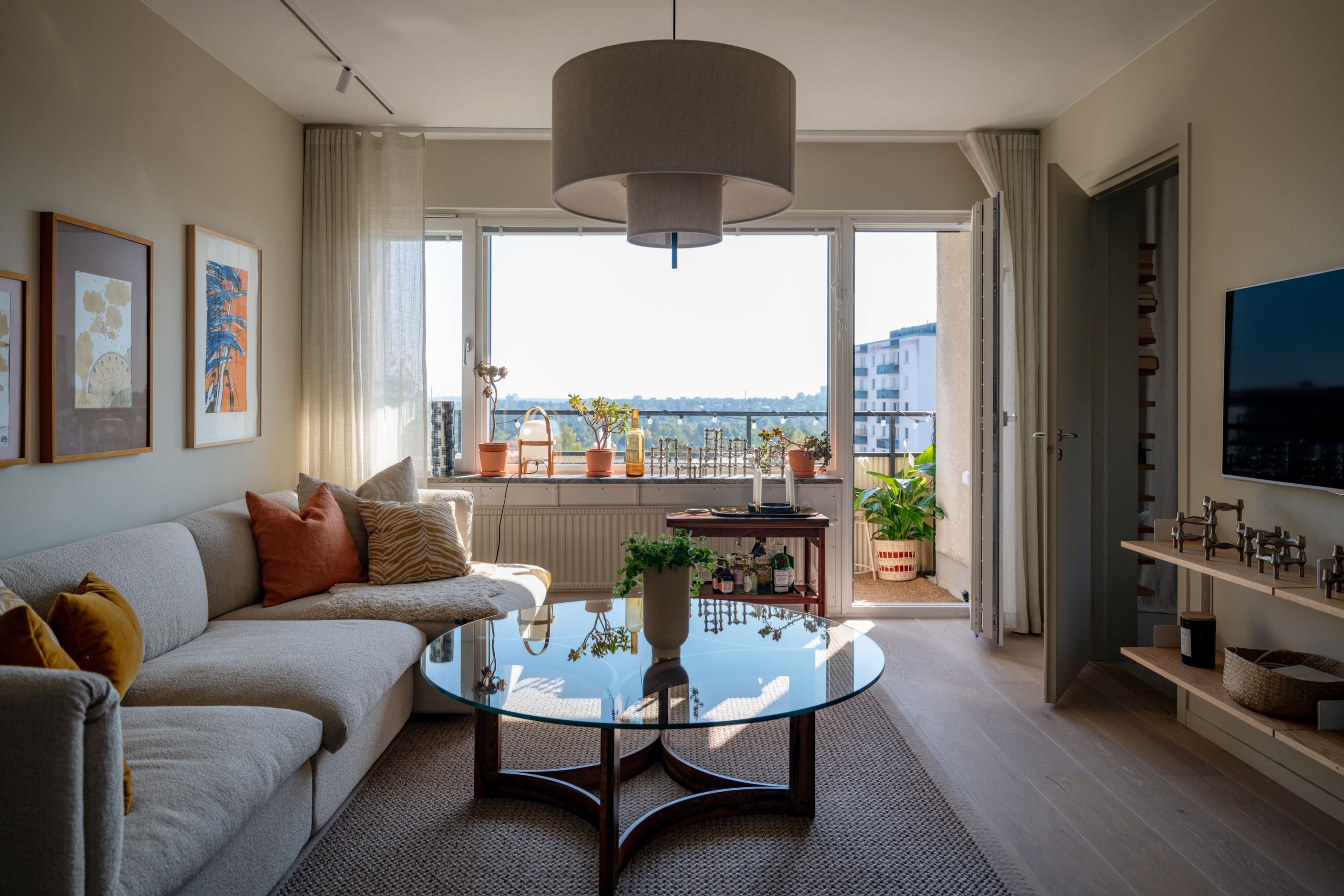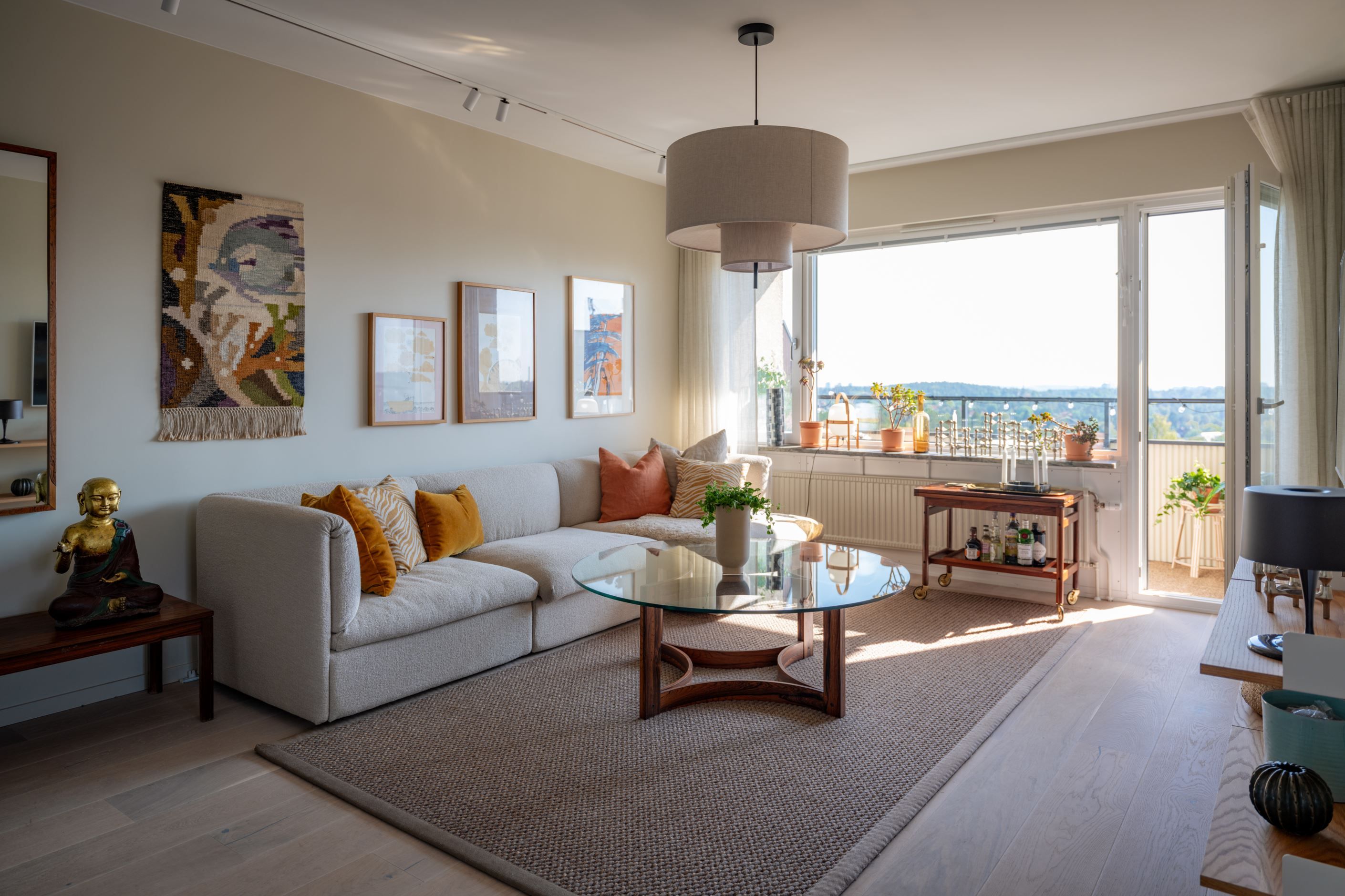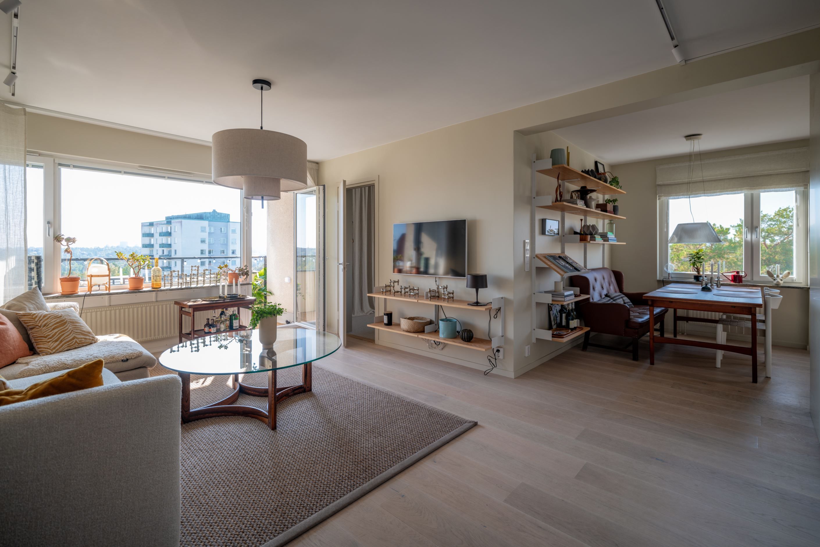 Placerad på hög höjd i charmigt 60-tals hus ligger denna totalt omarbetade tvårummare inredd av inredningsarkitekt. Bostaden är unik i sitt slag med genomgående stilrena och påkostade materialval där varje detalj setts över för att optimera planlösningen med ett naturligt flöde för den sociala ytan, lyfta fram ljuset och samtidigt behålla och underlätta vardagsbestyren som funktionen av förvaring, dold tvätthörna och arbetsytor i köket innebär. Med sitt läge på 4:e våningen (som nås via hiss) i helt privat läge ges en fantastisk utsikt över stora delar av centrala Lidingö och i perfekt syd/väst-läge där solen kan avnjutas på rymlig balkong större delen av dagen/kvällen.