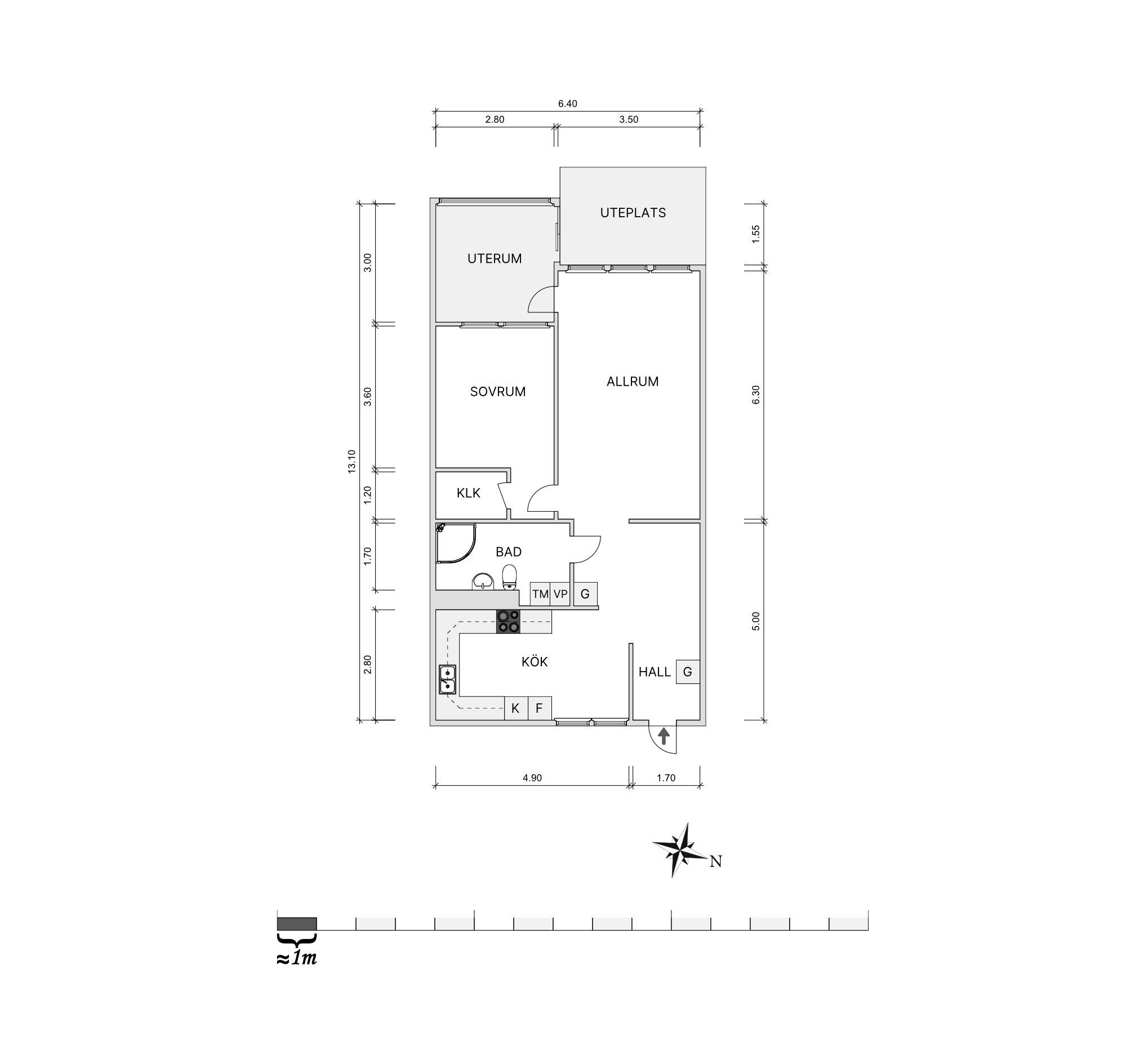 Lägenheten erbjuder hall med förvaring, kök med matplats, vardagsrum med utgång till uterummet, sovrum med garderober och klädkammare samt badrum. Planlösningen är funktionell och lätt att möblera.