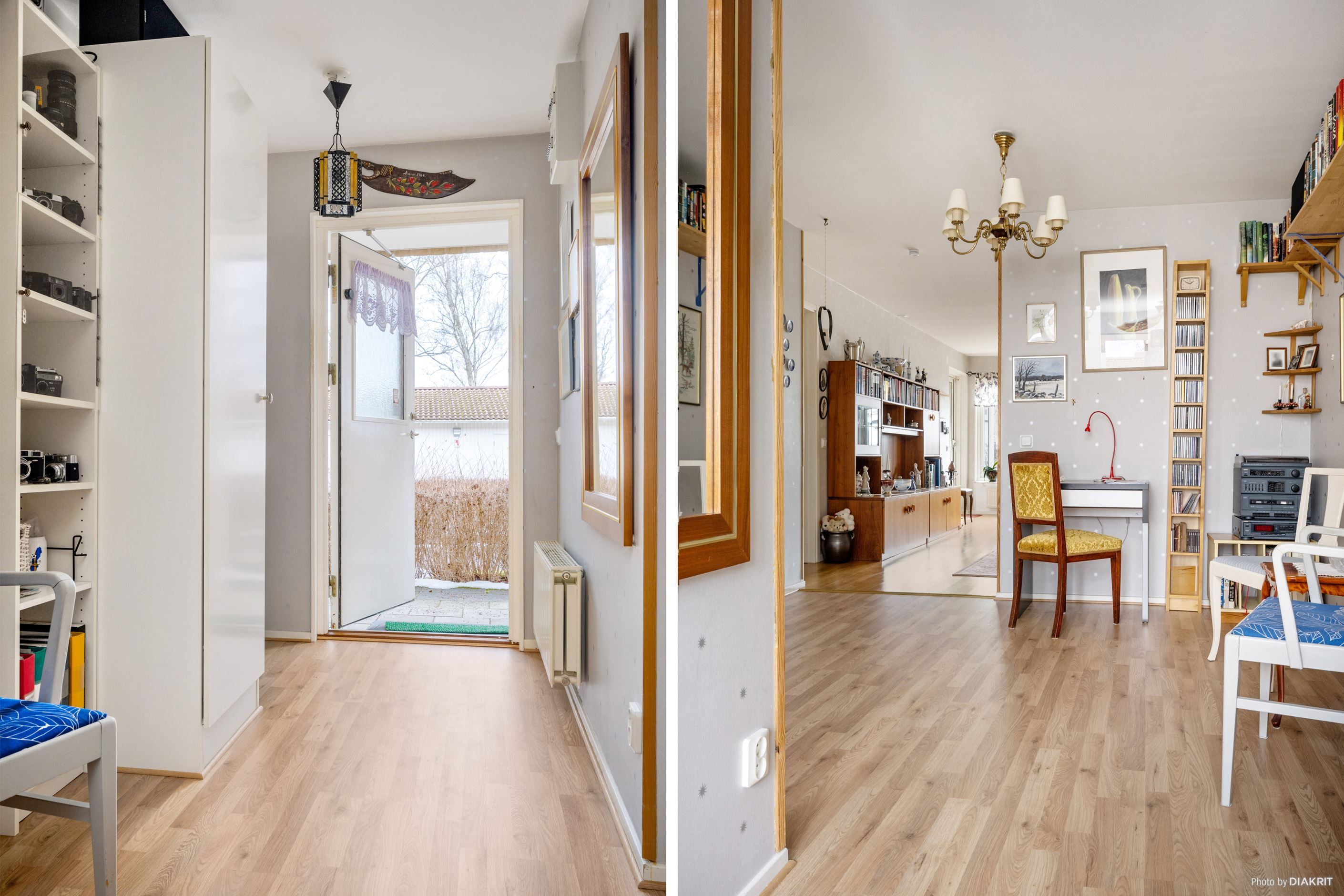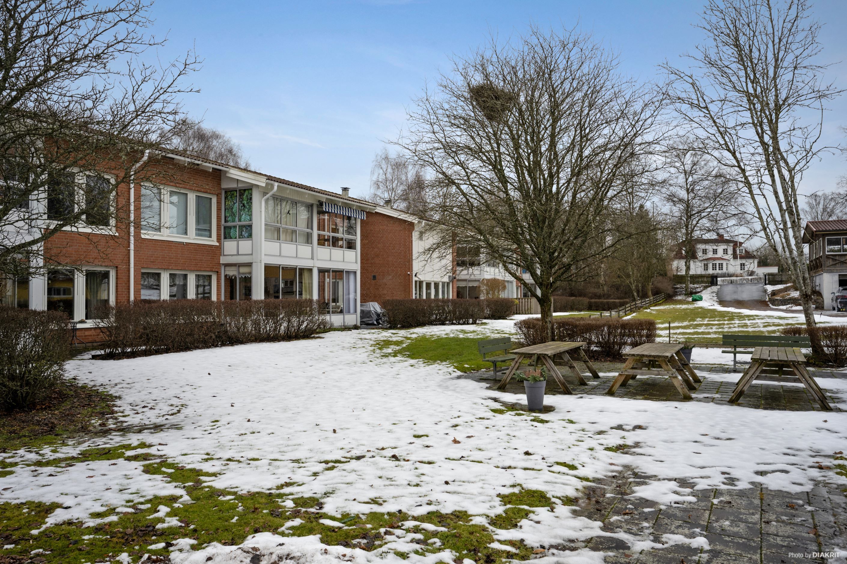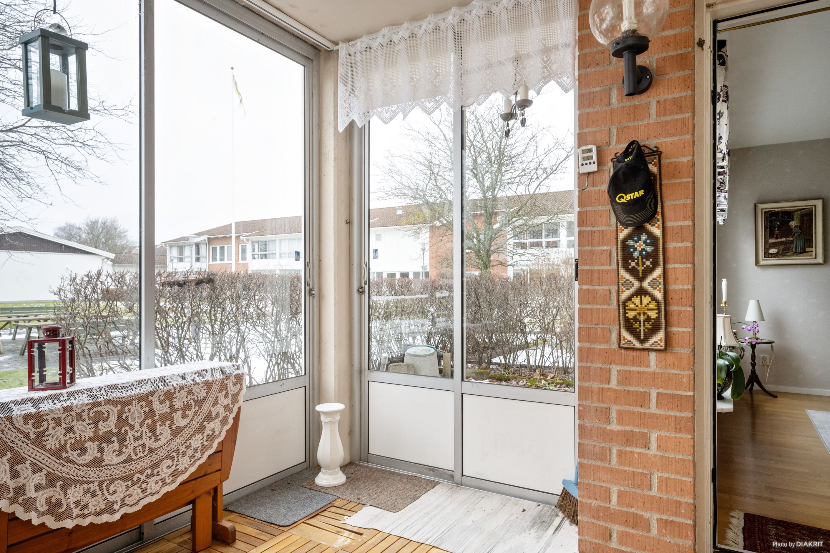 Här bor du utan trappor och med direkt access till ett inglasat uterum som förlänger säsongen större delen av året. Utanför finns dessutom en stenlagd uteplats – en trevlig yta för morgonkaffet eller en stund i solen.